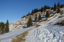 Zügiger Abstieg ab 10.50 Uhr ohne Schneeschuhe aber mit Spikes. Die Spur hat ausreichend gut getragen. Im unteren Drittel zunehmend warm.
