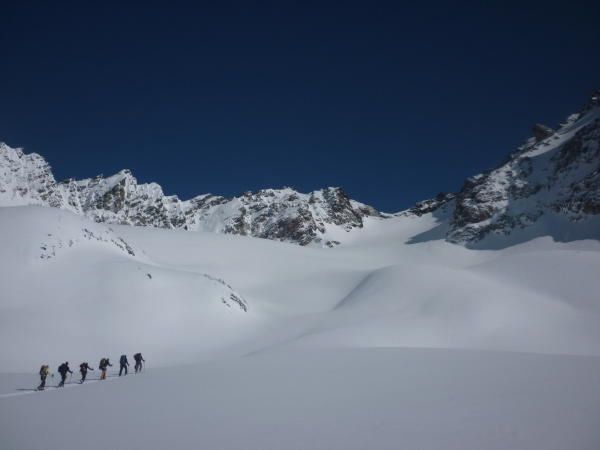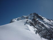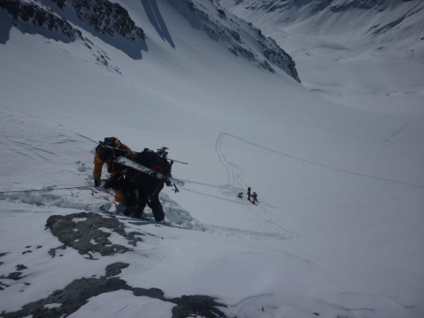 Dann dem Tal Tuoi entlang zur Tuoi Hütte (ca. 2 Std.) Wir haben dort übernachtet wegen der relativ langen Anreisezeit. Am nächsten Morgen am Punkt 2451 Plan Furcletta vorbei. Wir lassen den Punkt 2659 an unserer Rechten liegen und Zielen in einem weiten Bogen zum Jamjoch. Ski aufschnallen und auf das Jamjoch chrakseln. Von dort entlang der CH-A Grenze auf die Hinter-Jamspitze.