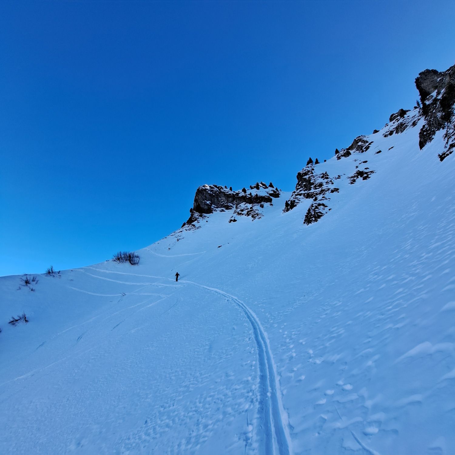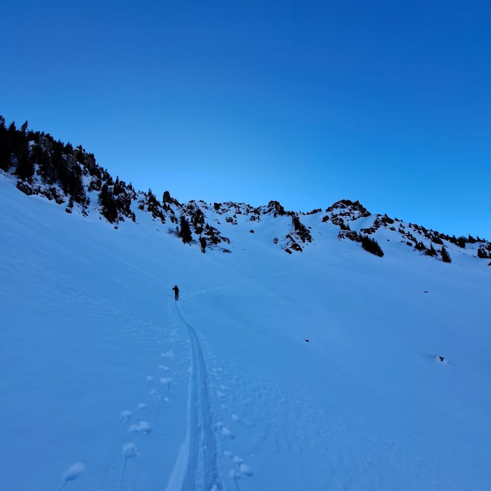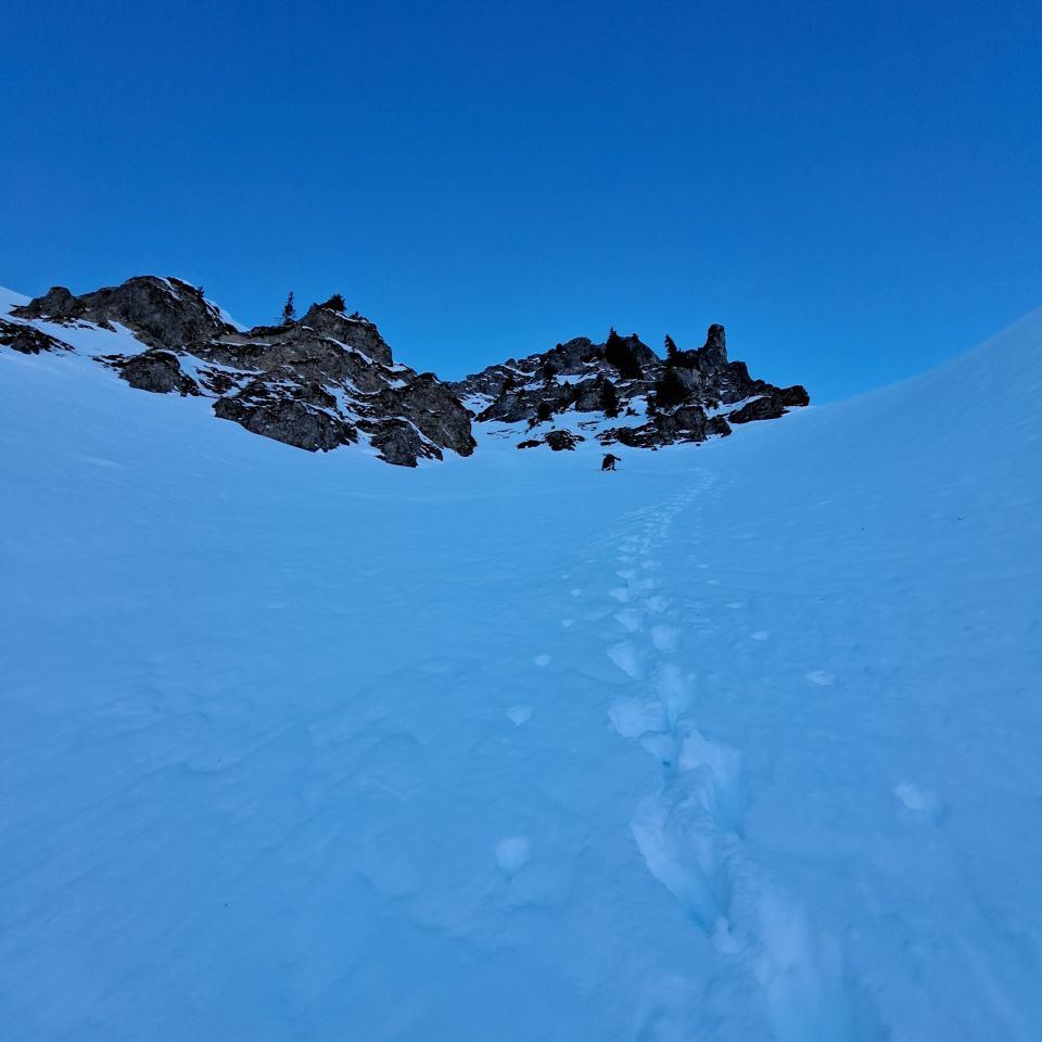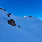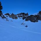 Sind nach Ostflanke direkt in Nordseite rüber,Culi ganz links bereits gespurt(merci u gruess de zwöi modis)desshalb erst da hoch und da netterweise das direkte Gipfelculi noch ohne Spur(merci den Vorgängern) eine super Firstline in tollem Presspulfer....