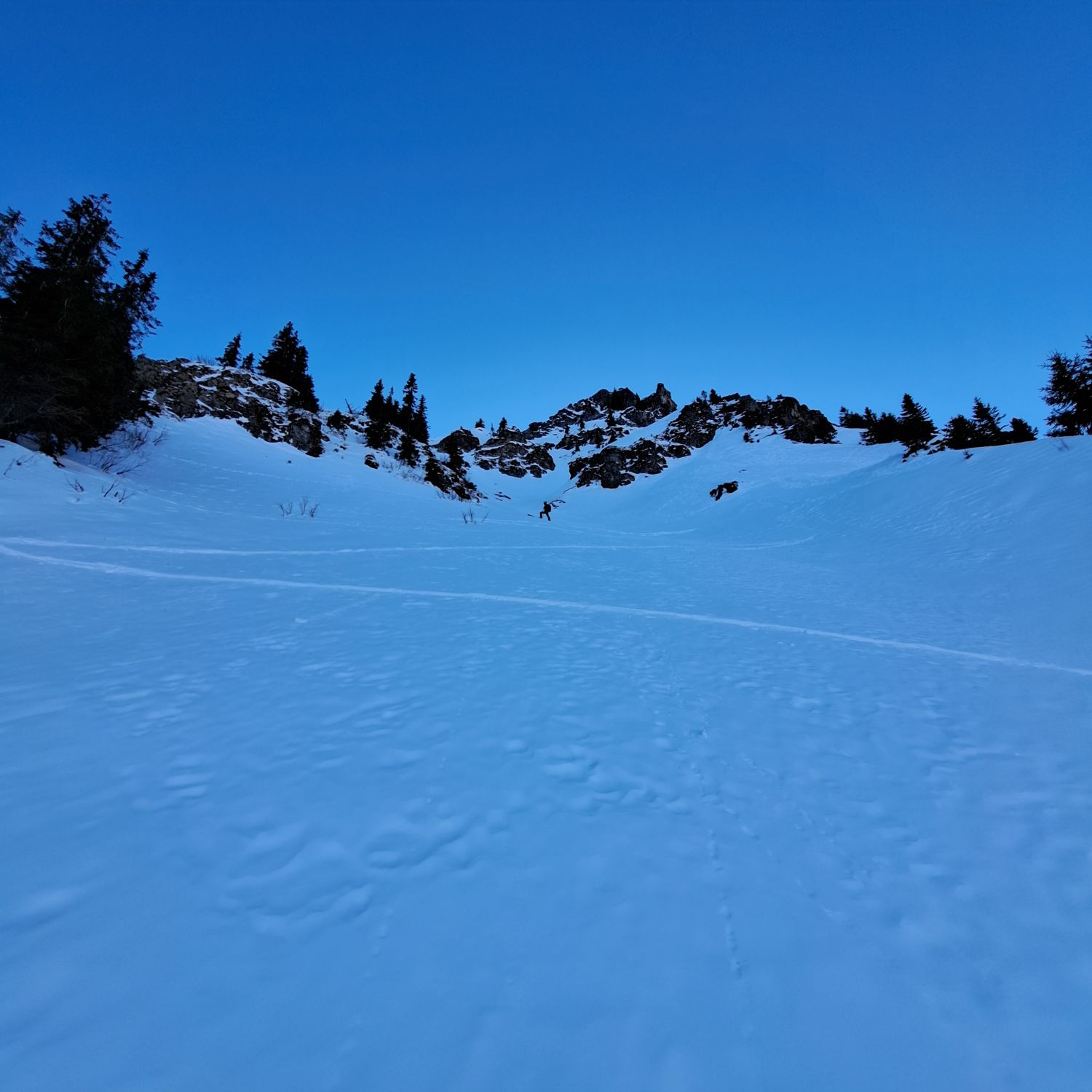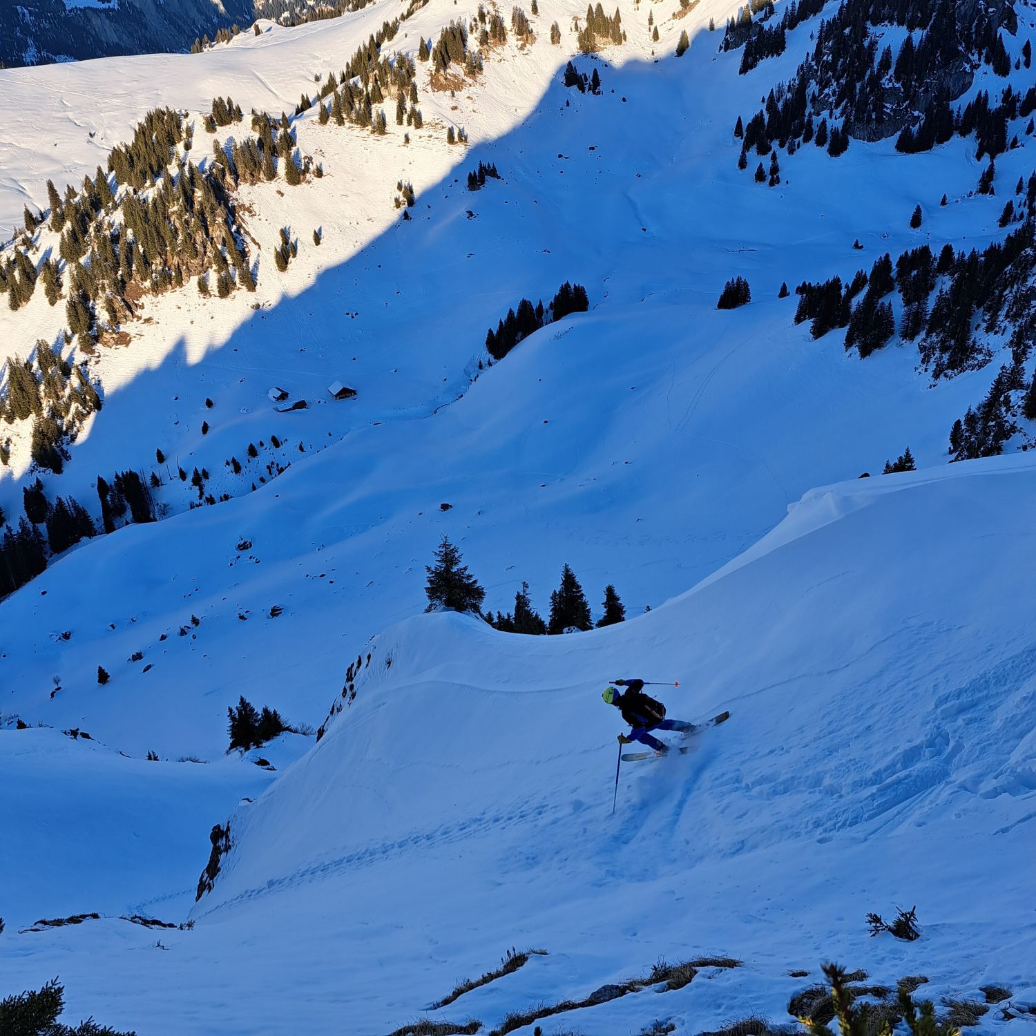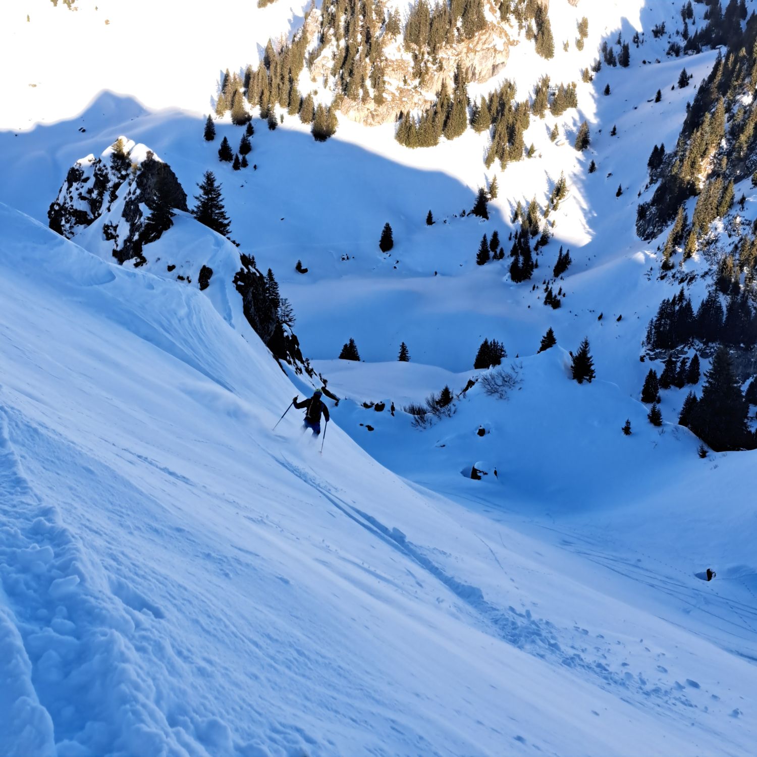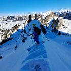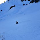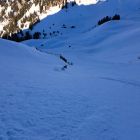 Dann noch mal Auffellen und bis Felsen hoch mit Ski und Rest zu Fuss auf Grat.Abfahrt Steilstufe genug aber nach Abfahrt mit viel Sluff nun etwas geleert,Rest der Oberhammerpulver.Sind über Strasse bis Gschänd(unser Start)retour-
