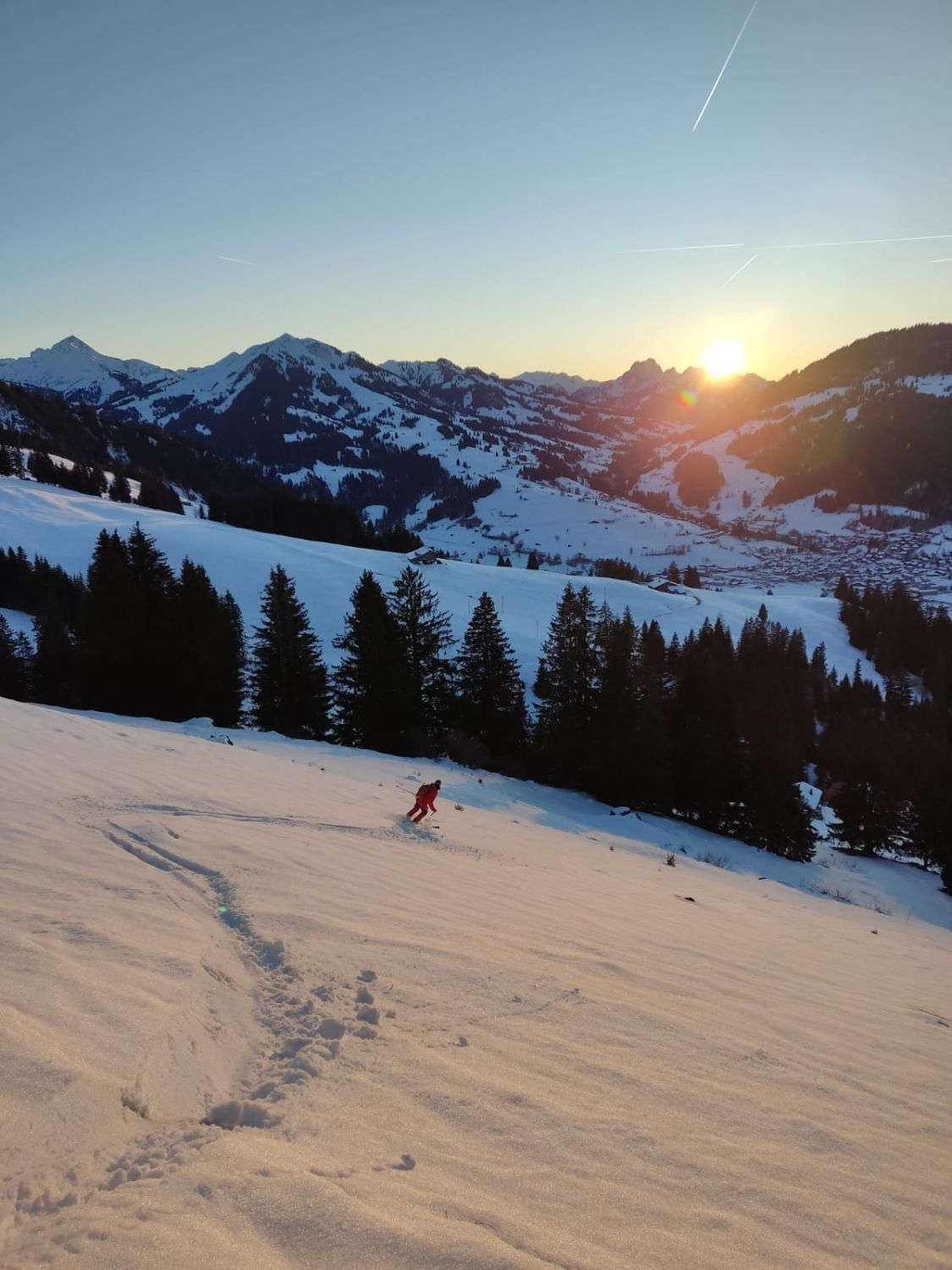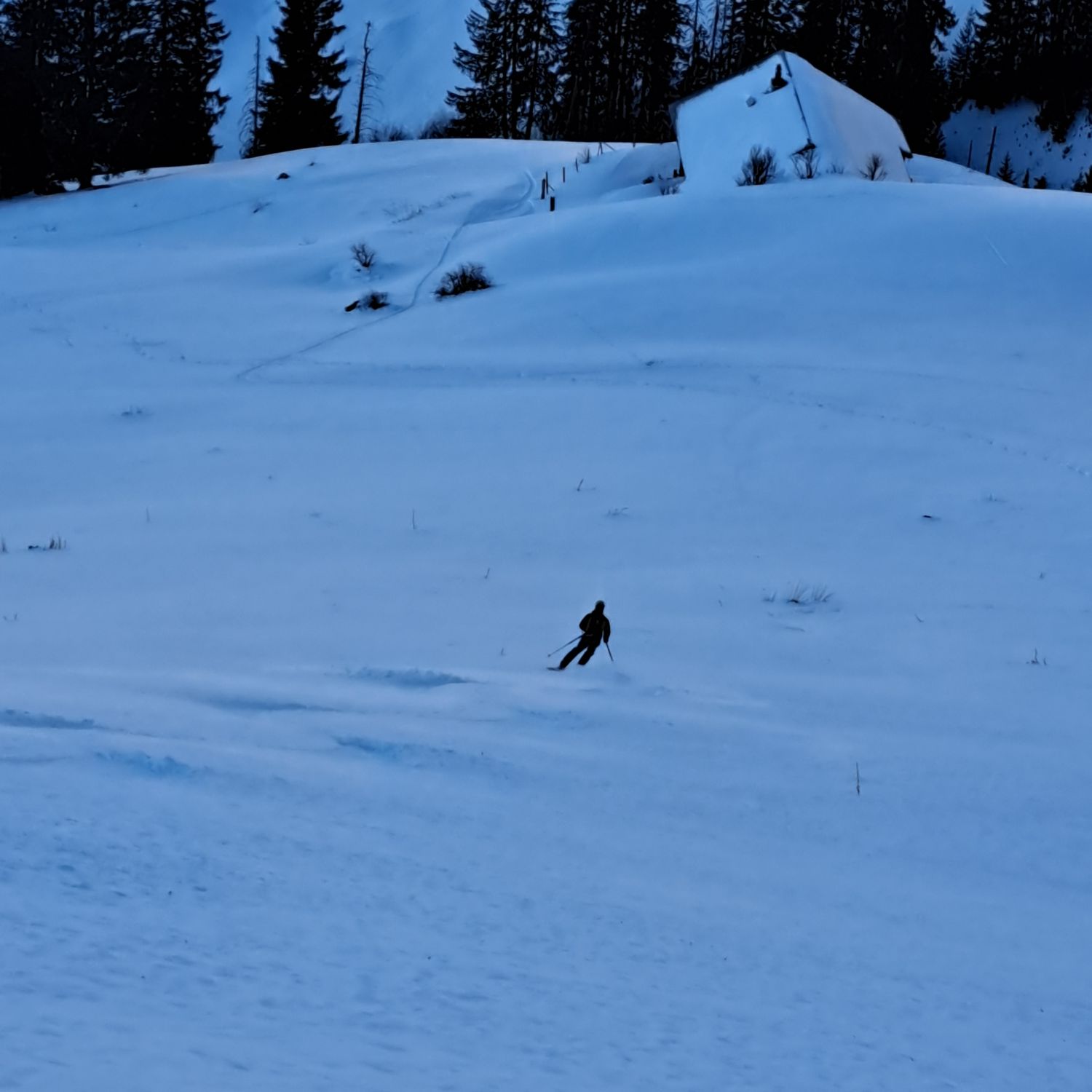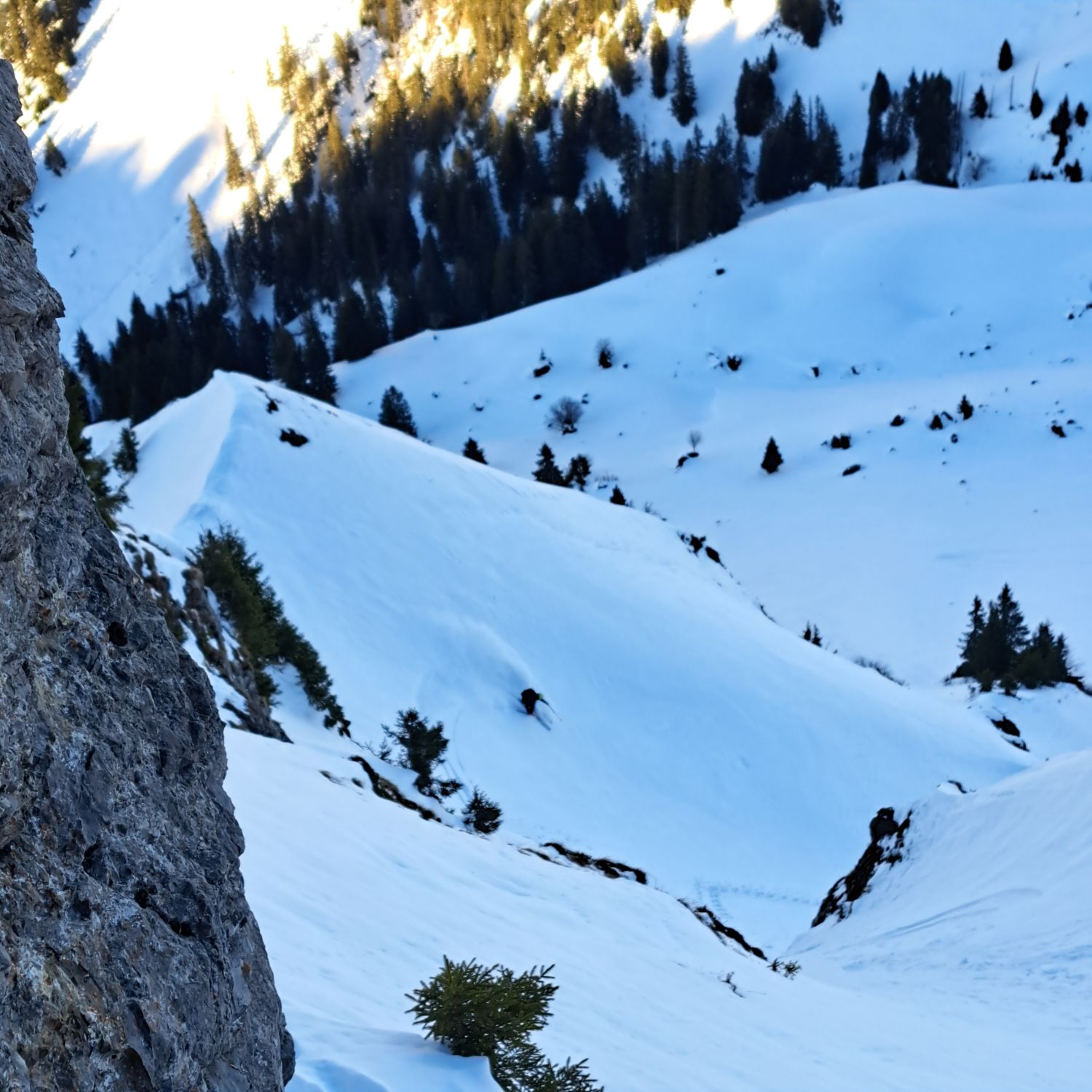 Dann noch mal Auffellen und bis Felsen hoch mit Ski und Rest zu Fuss auf Grat.Abfahrt Steilstufe genug aber nach Abfahrt mit viel Sluff nun etwas geleert,Rest der Oberhammerpulver.Sind über Strasse bis Gschänd(unser Start)retour-