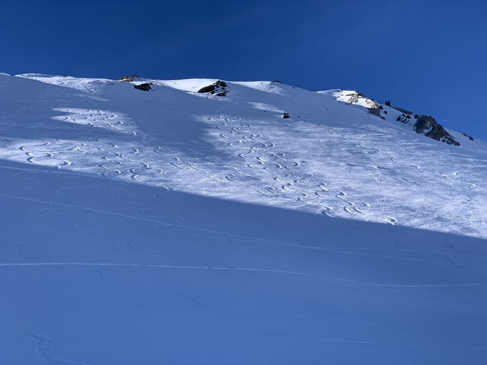 Bei der andernorts doch vielfach knappen Schneelage war dieses Gebiet gestern der reine Genuss. Vom Gipfel bis runter zur Alpe Fursch schönster Pulver, der auch nach den vielen Sonnentagen keinen Deckel bekommen hat. Und das Gelände ist weit genug für viele Varianten.