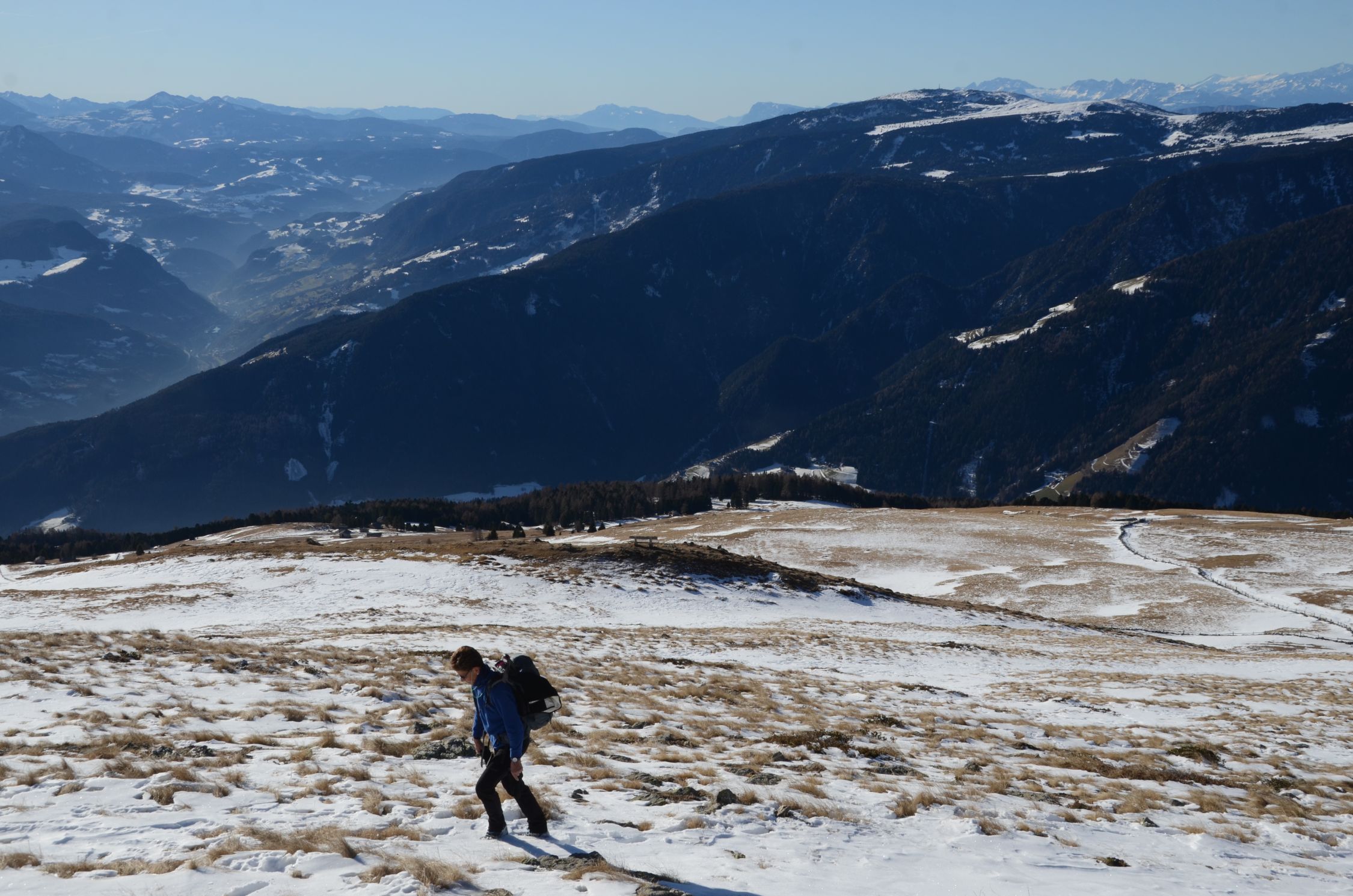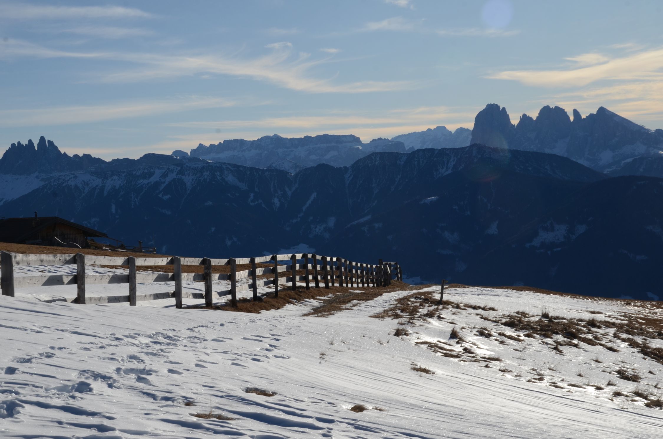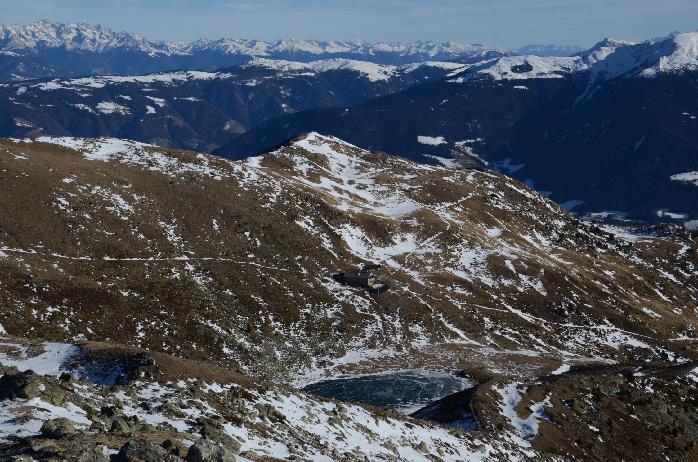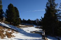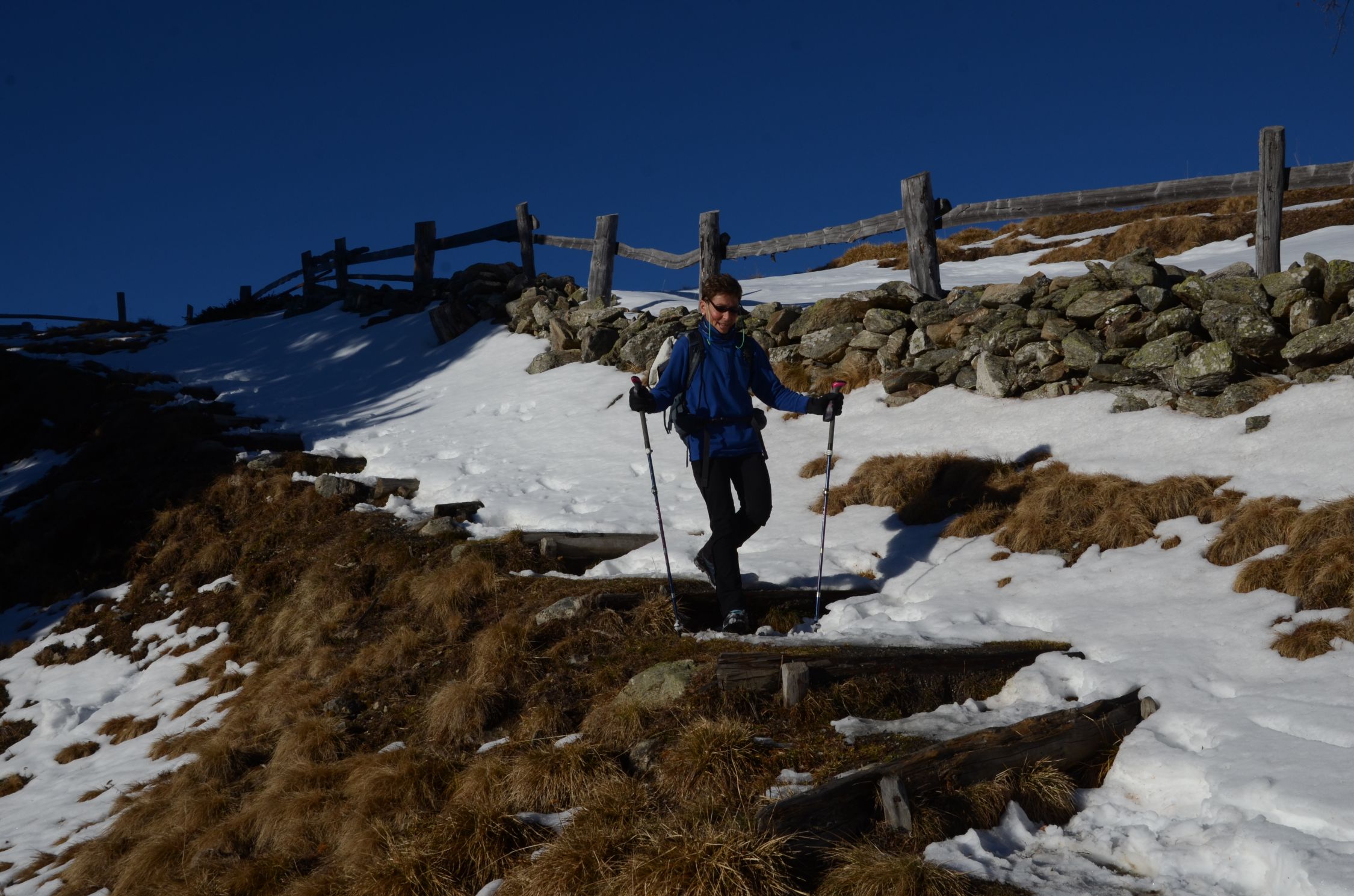 Es sind einige Schneeflecken vorhanden, besonders auf den Wegen und Steigen. An sonst fast aper.