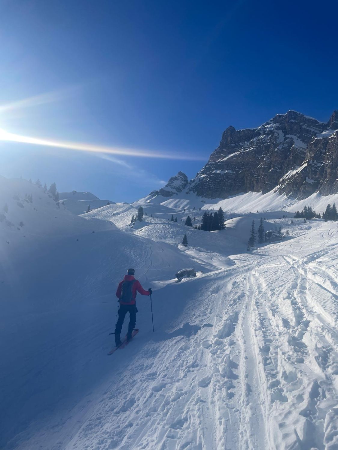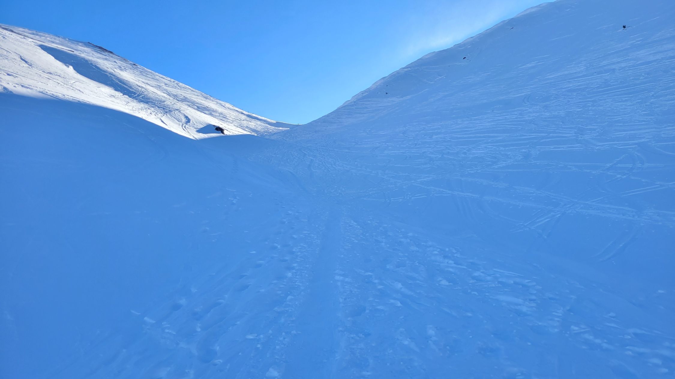 Der Powder schwindet langsam. Die Gegend ist noch gut eingeschneit, aber der Wärmeeintrag der letzten Tage und der starke Wind gestern haben ihre Spuren hinterlassen. Von der Grimmifurggi bis Alp Grimmi findet man noch recht guten Abfahrtsschnee, von Grimmifurggi bis Gipfel ist es überwiegend verblasen und die Spuren hart. Schnee hat es aber auch dort genug. Die Waldstrasse bis zum Parkplatz ist sehr gut befahrbar. Kaum Steine/ Felsen sichtbar.