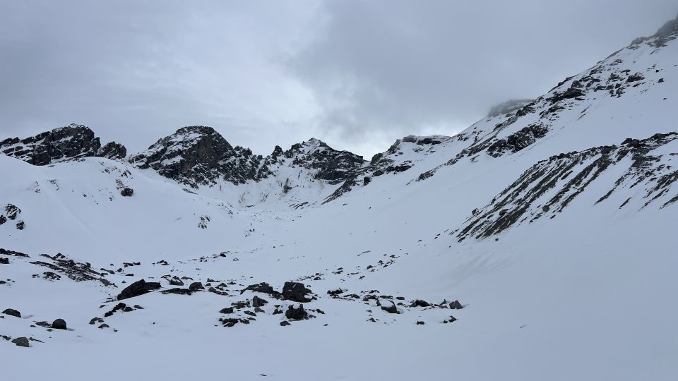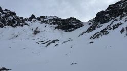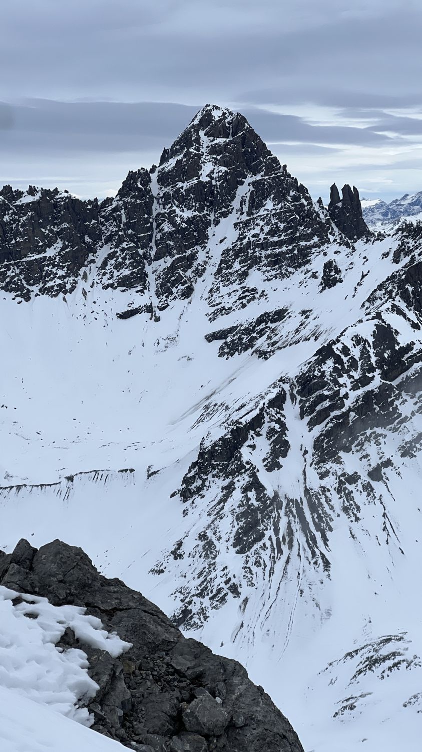 Sehr wenig Schnee im Gebiet. Ein paar mal kratzt es schon in der Abfahrt. Aber alles in allem ok. Steigeisen sehr hilfreich im Couloir. Die letzten 50hm dort zu Fuss. Nachher kaum noch Schnee bis auf den Gipfel.