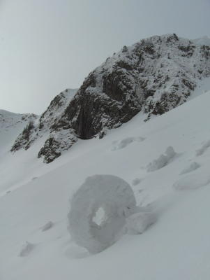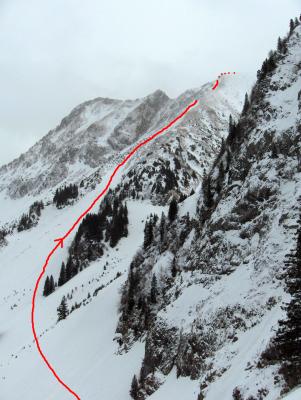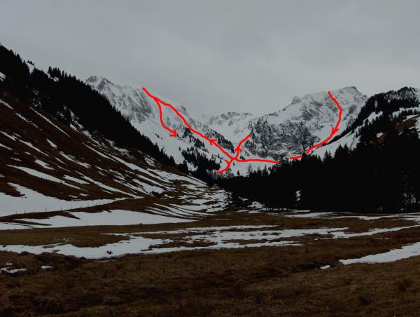 Schibe: Querung nach E und Aufstieg über NW-Rippe bis ca. 1960m, nach E in die N-Flanke und über diese entlang dem NW-Grat auf den Gipfel (bis 40 Grad, letzte 50Hm zu Fuss). Abfahrt über die N-Flanke bis ca. 1860m, dann durch das Couloir E der NW-Rippe Richtung Mürder zurück auf die Strasse bei 1450m (unten Halfpipe, insgesamt 700m).