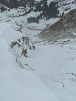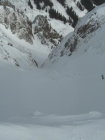 Märe: Aufstieg und Abfahrt wie im Bericht vom 27.3.2010 beschrieben (Gratulation und Danke an Beat und Aedu!). Bei 10-20cm Gleitschicht auf angefrorener Unterlage Abstieg 2m über Wächte und Abfahrt mit Eisgerät in der Hand bis zum Flaschenhals, über den ich mit Steigeisen abkletterte, dann "freihändig" bis ca. 1575m.