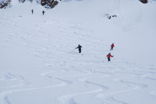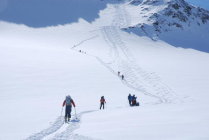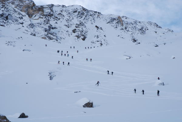 Am Marteller Talschluss hinauf zur Zufallhütte und weiter zur Martellerhütte. Vor dem Fürkelferner über einen Schluff hinauf zum Hohenferner und über das Gletscherbecken zum Joch und mit den Schiern leicht zum Gipfel. Die Abfahrt folgte der Aufstiegsspur.
