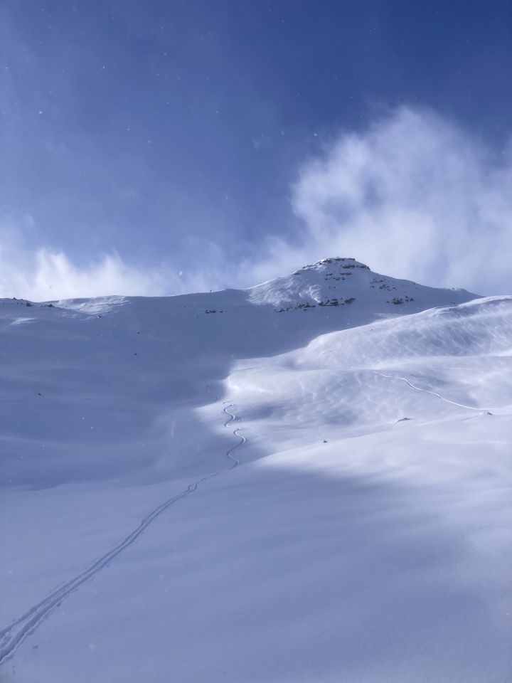 Habe von unten weg neu gespurt. Voraustrupp war wohl nicht ganz ortskundig oder hat etwas sightseeing gemacht. Jetzt ist die Spur einigermassen direkt und gleichmässig.