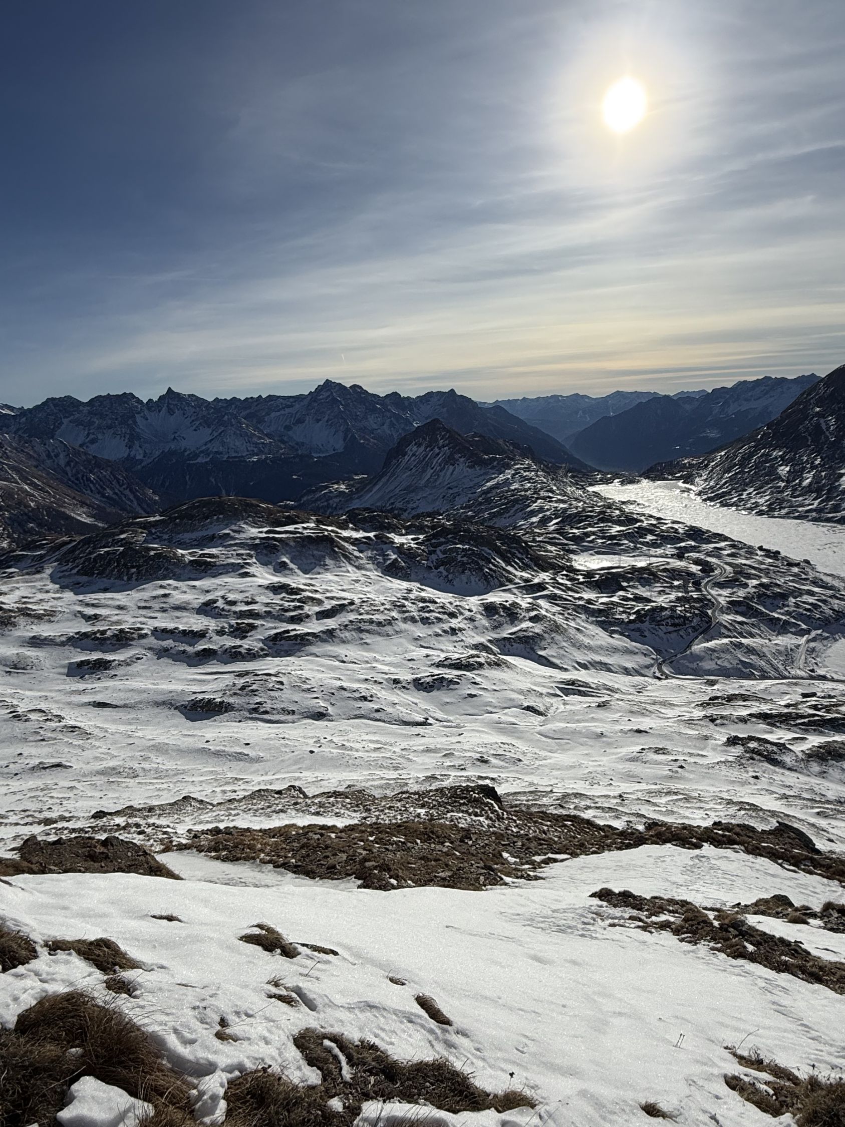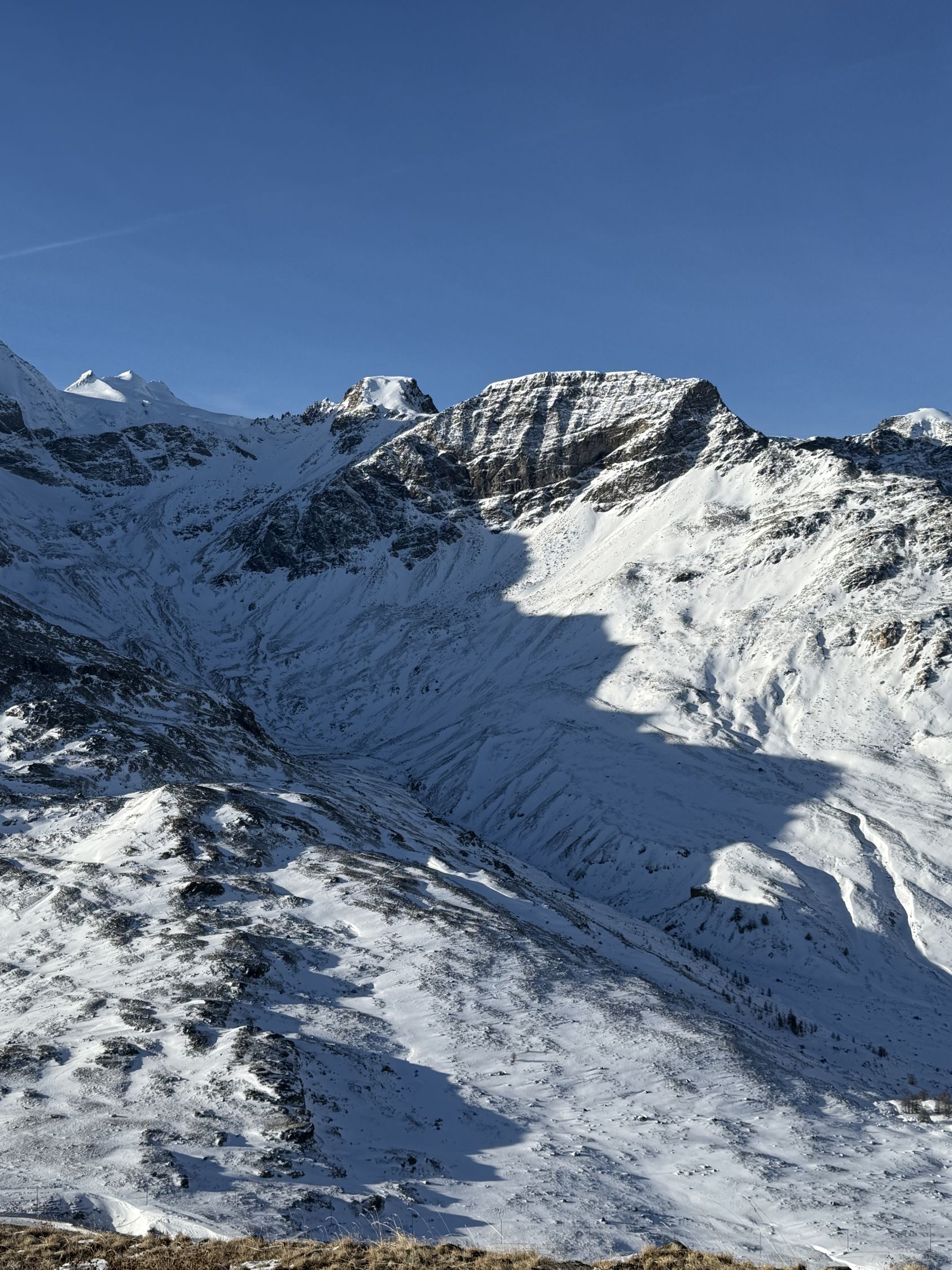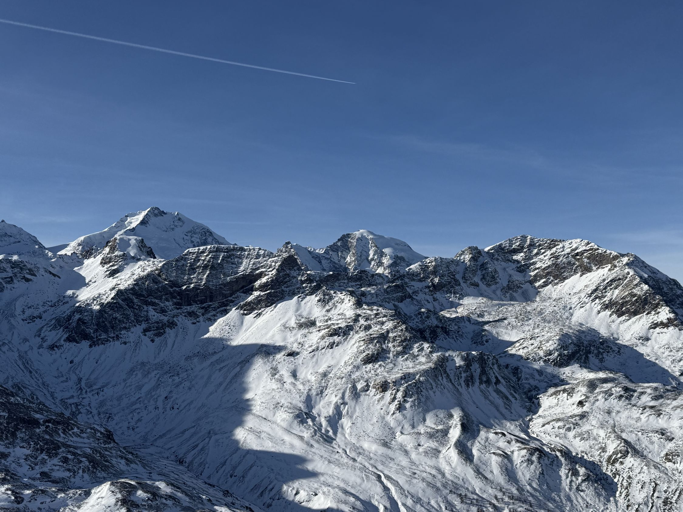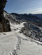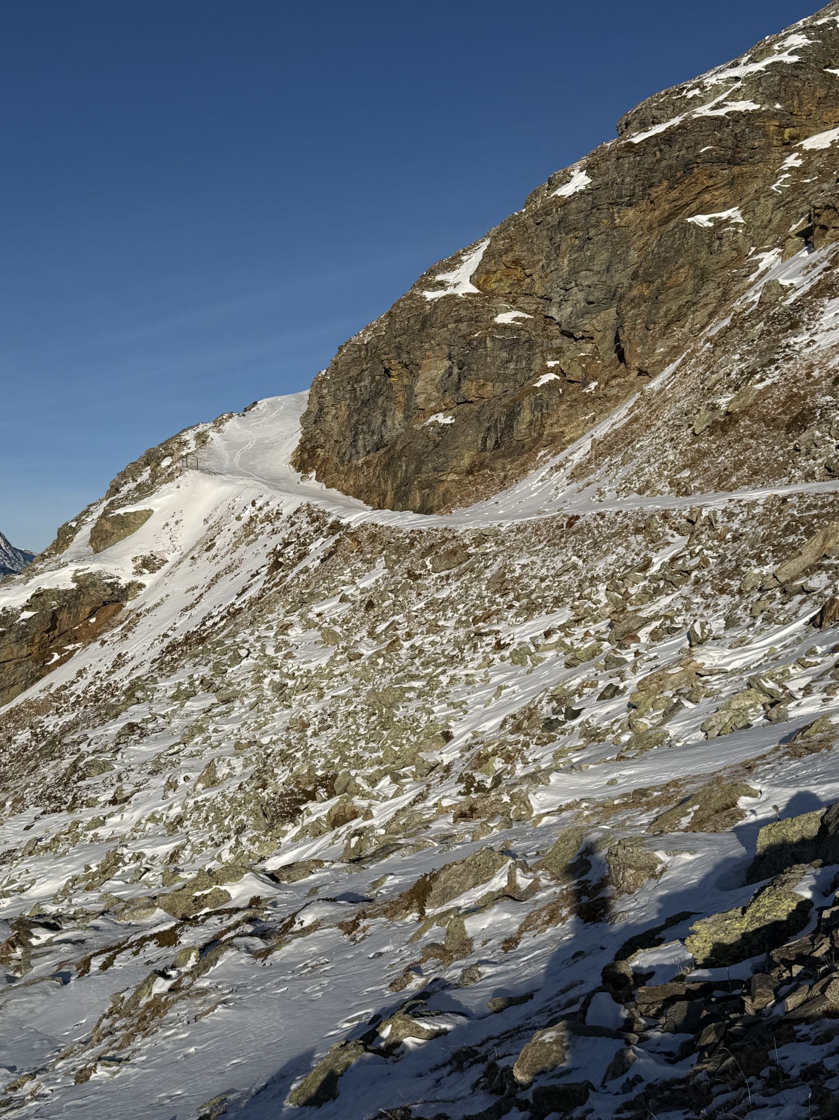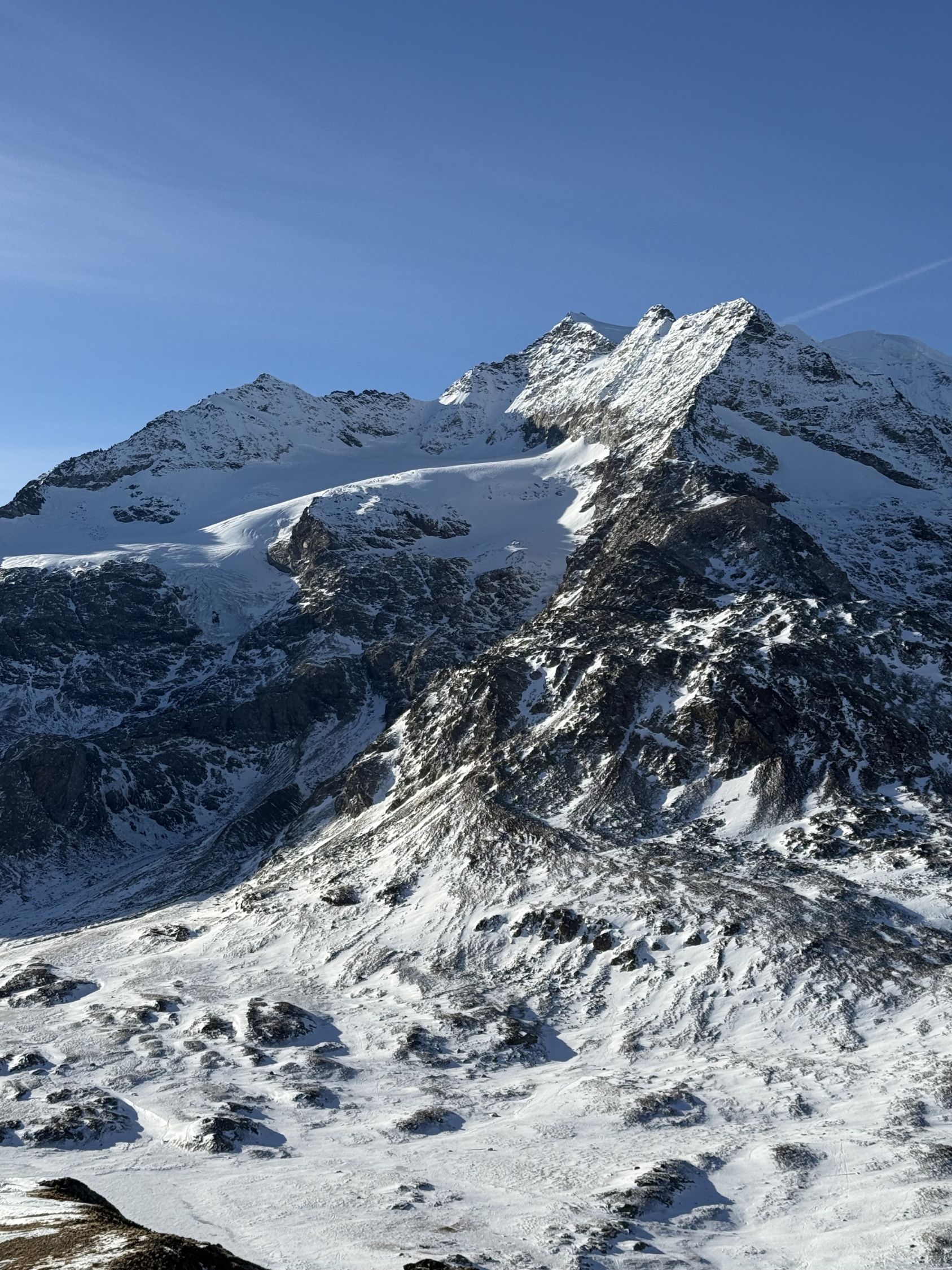 Rundtour bis Bank mit der schönen Aussicht und schwieriger Abstieg in der Südflanke, T4+. Start Berninastrasse 9 Uhr, minus 12 Grad, leichter Nordwind, blauer Himmel. Angenehmer Aufstieg mit Hochtourenschuh auf Schneeschuhspur bis Bänklein Punkt 2698. Den Gipfel habe ich mir heute geschenkt, die Bergstation unterhalb des Gipfels ist ja auch nicht gerade ein interessanter Bau! Für Abstieg habe ich die Grödel montiert. Hatte mehr Schnee als ich gerechnet habe, vorsichtiger Abstieg, teilweise sehr steil und hart. Im Val dal Bügliet eine Schneeschuhspur bis Parkplatz Berninastrasse. Tolles Ambiente, hatte wie erwartet den Berg für mich alleine, der Skibetrieb ist infolge Schneemangel eingestellt.