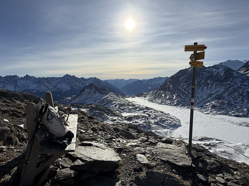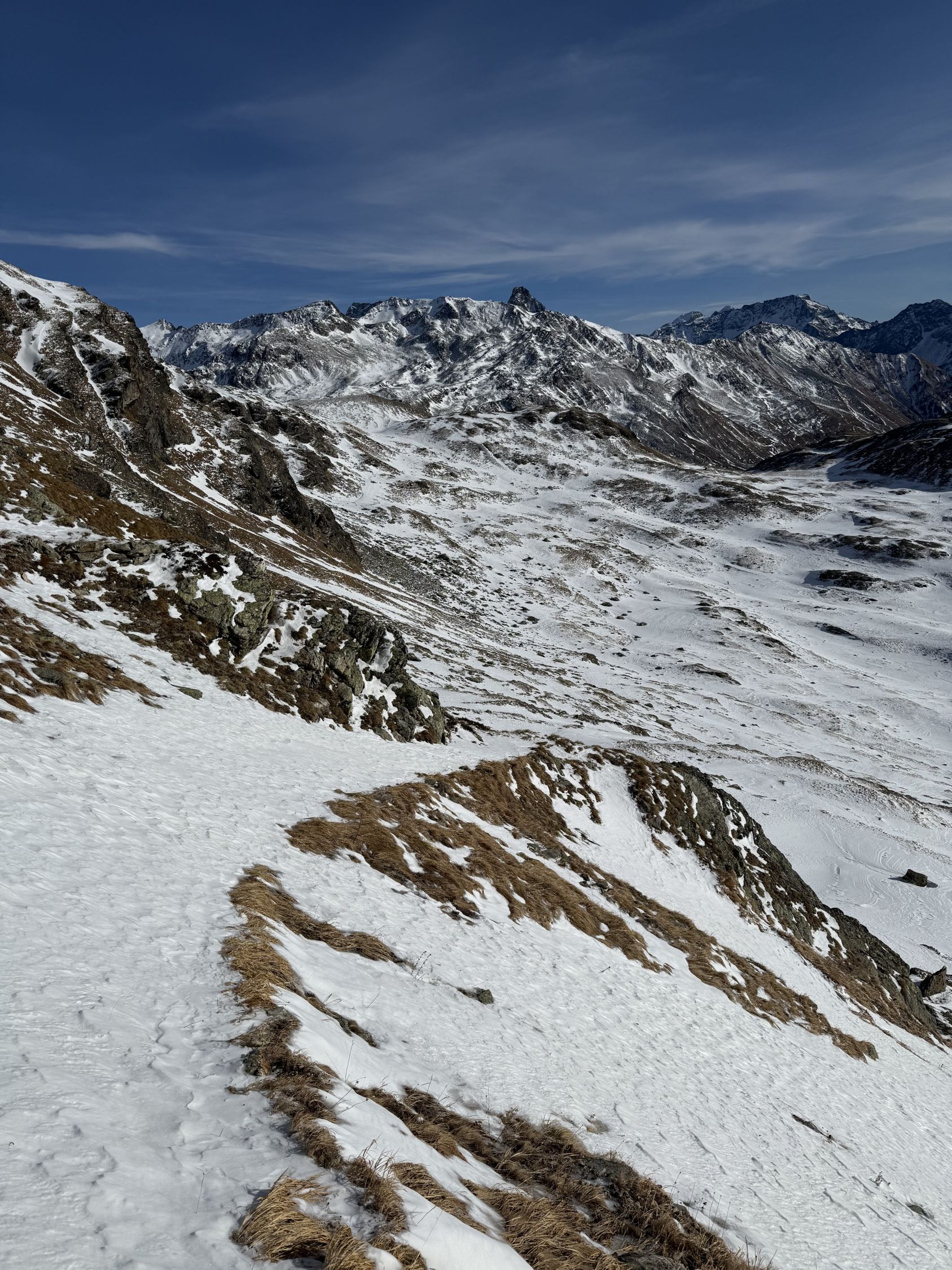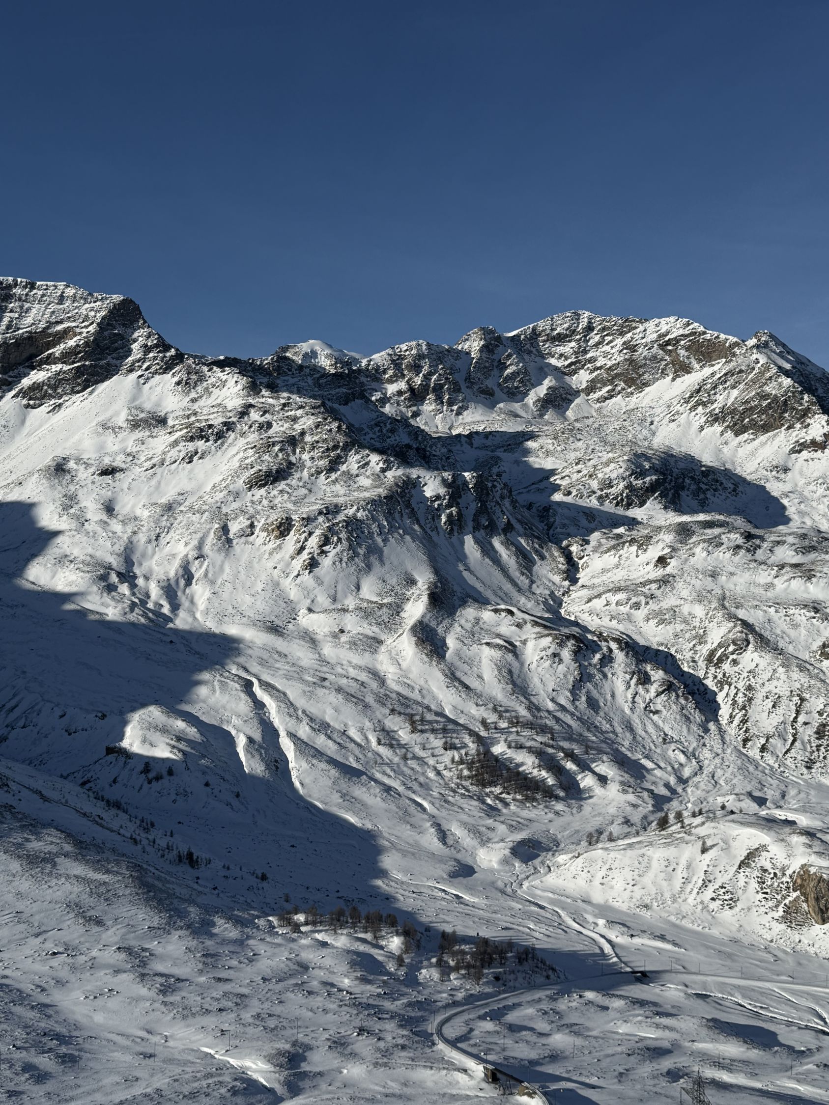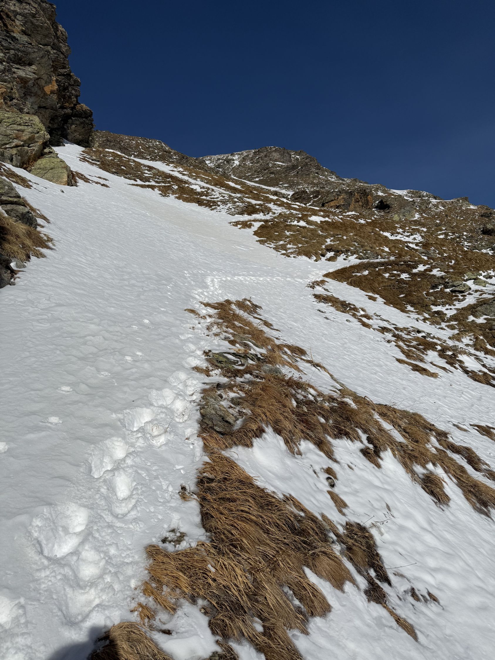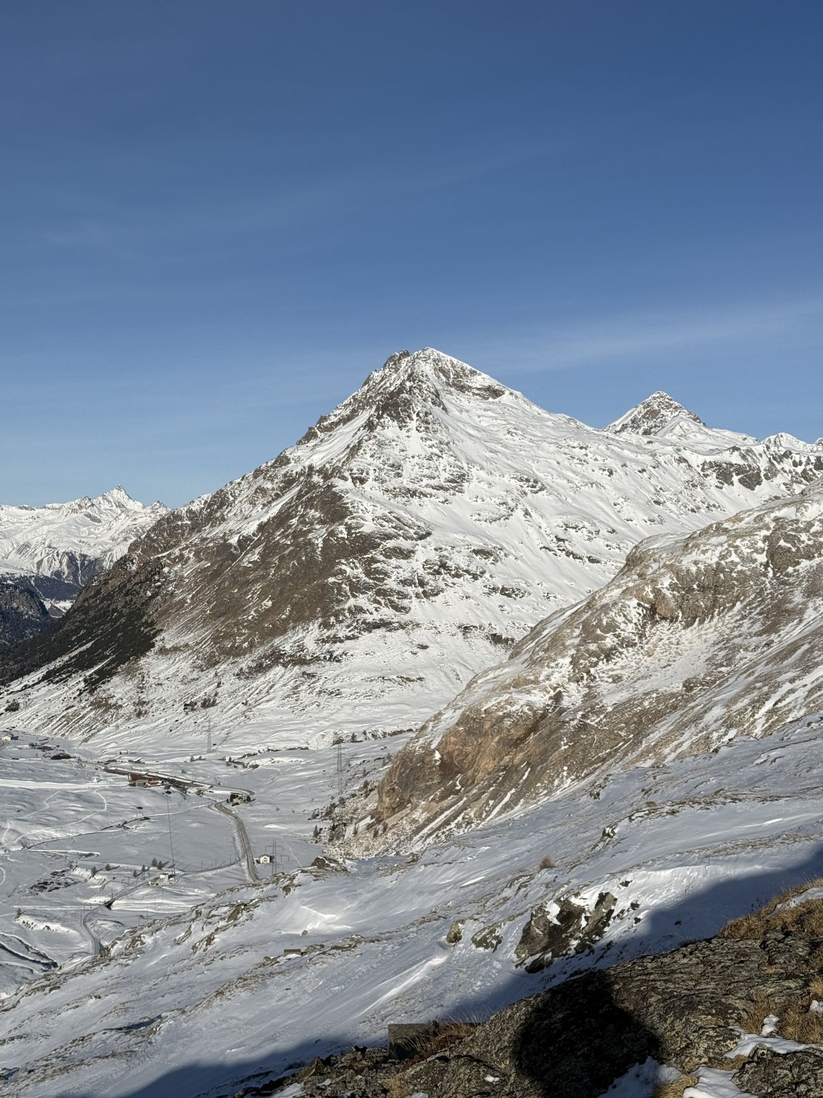 Rundtour bis Bank mit der schönen Aussicht und schwieriger Abstieg in der Südflanke, T4+. Start Berninastrasse 9 Uhr, minus 12 Grad, leichter Nordwind, blauer Himmel. Angenehmer Aufstieg mit Hochtourenschuh auf Schneeschuhspur bis Bänklein Punkt 2698. Den Gipfel habe ich mir heute geschenkt, die Bergstation unterhalb des Gipfels ist ja auch nicht gerade ein interessanter Bau! Für Abstieg habe ich die Grödel montiert. Hatte mehr Schnee als ich gerechnet habe, vorsichtiger Abstieg, teilweise sehr steil und hart. Im Val dal Bügliet eine Schneeschuhspur bis Parkplatz Berninastrasse. Tolles Ambiente, hatte wie erwartet den Berg für mich alleine, der Skibetrieb ist infolge Schneemangel eingestellt.