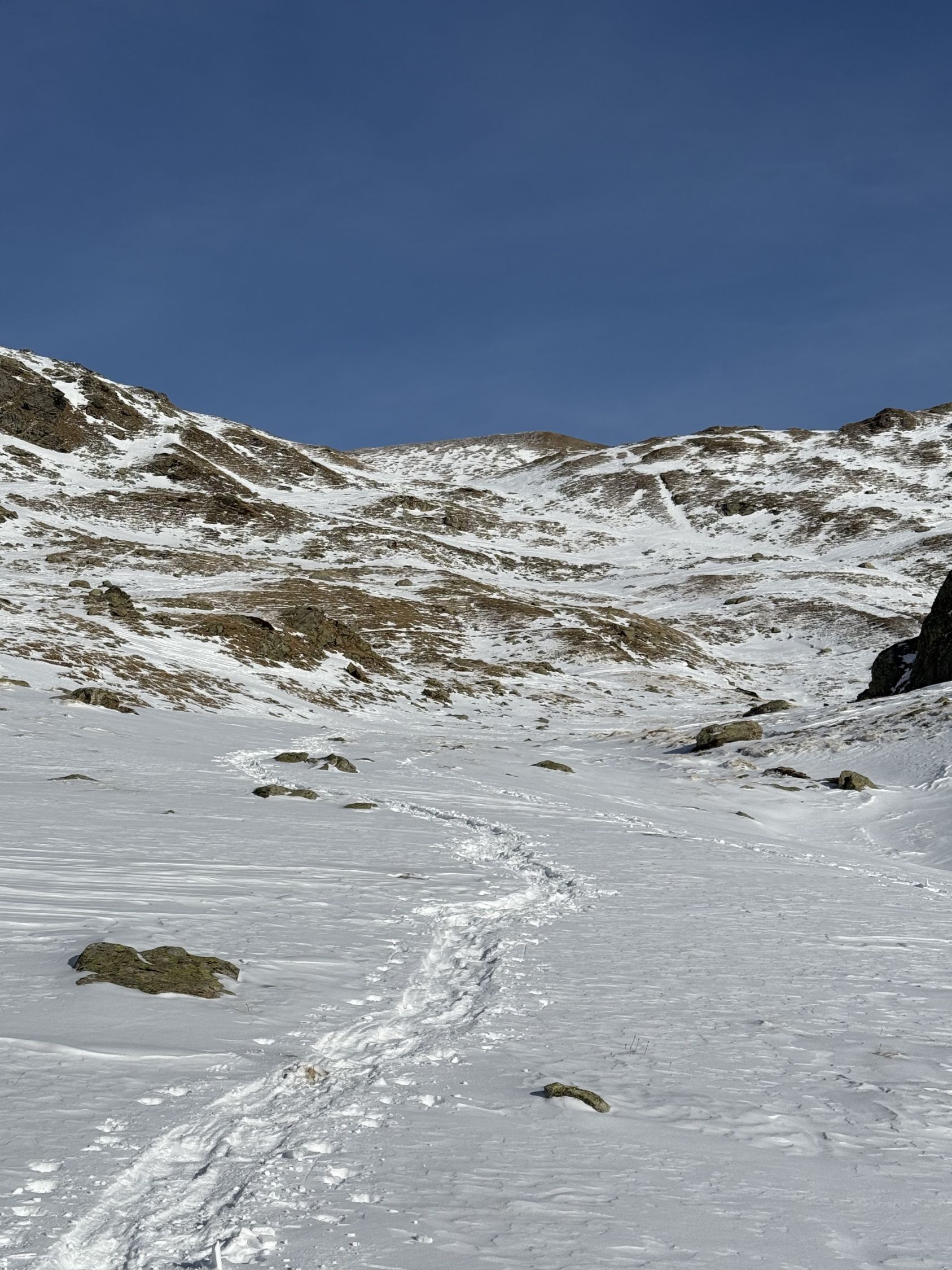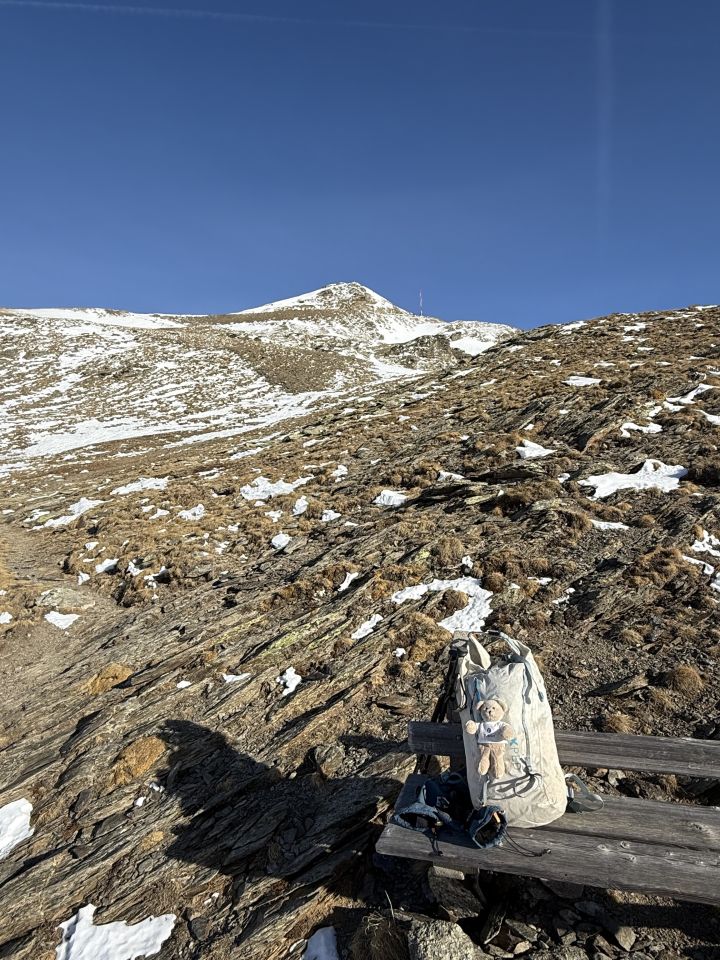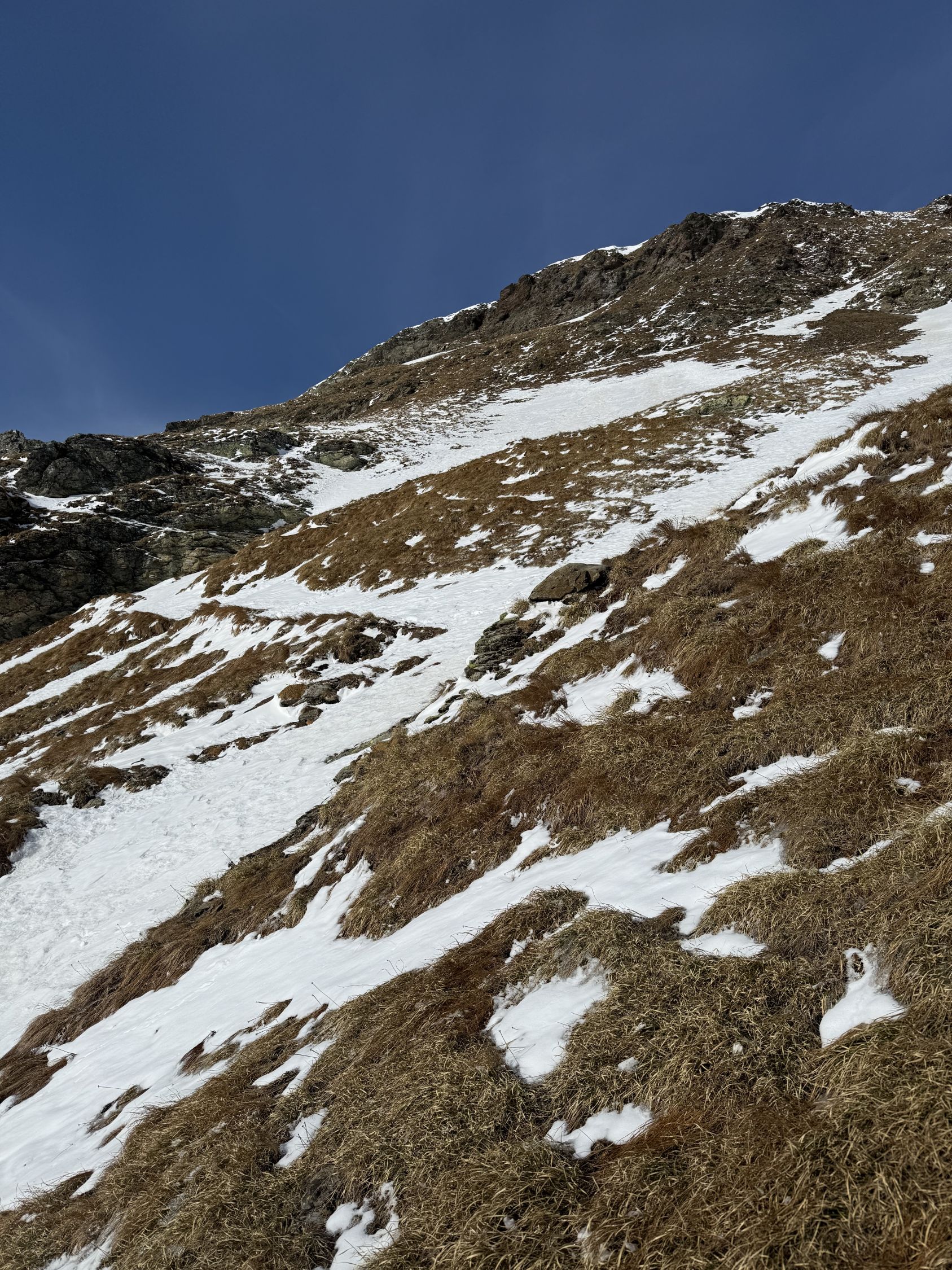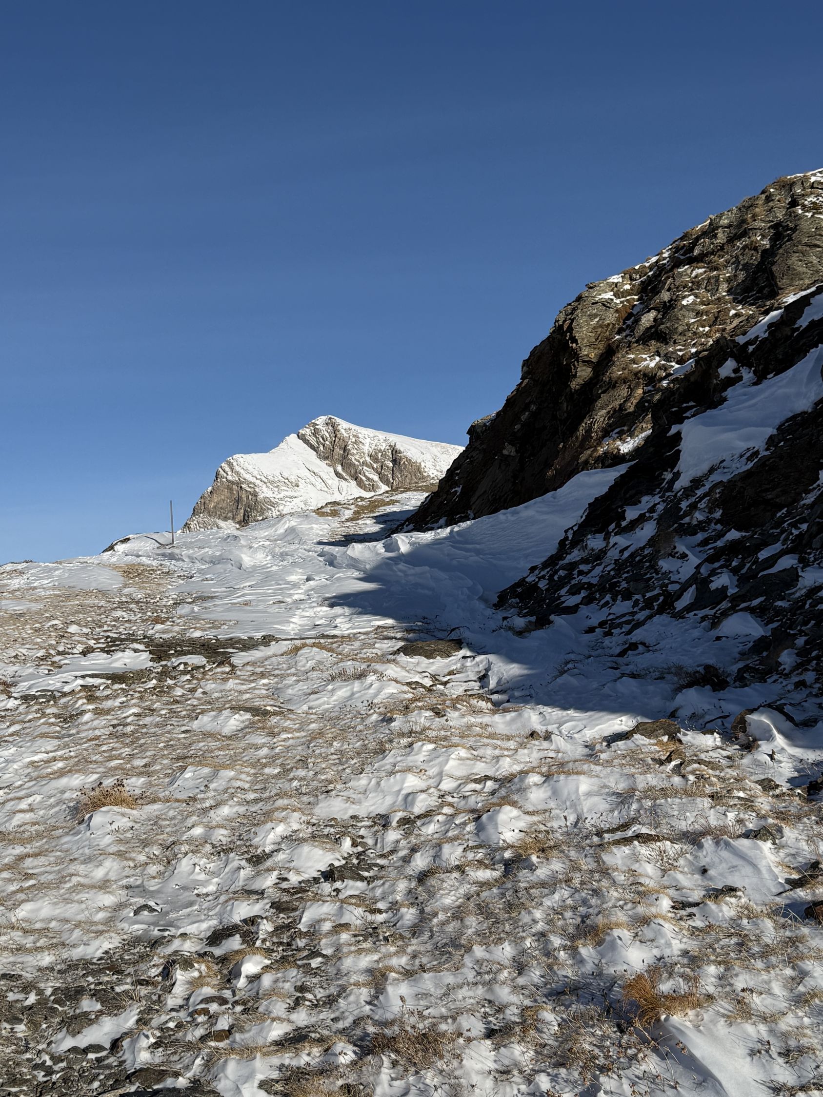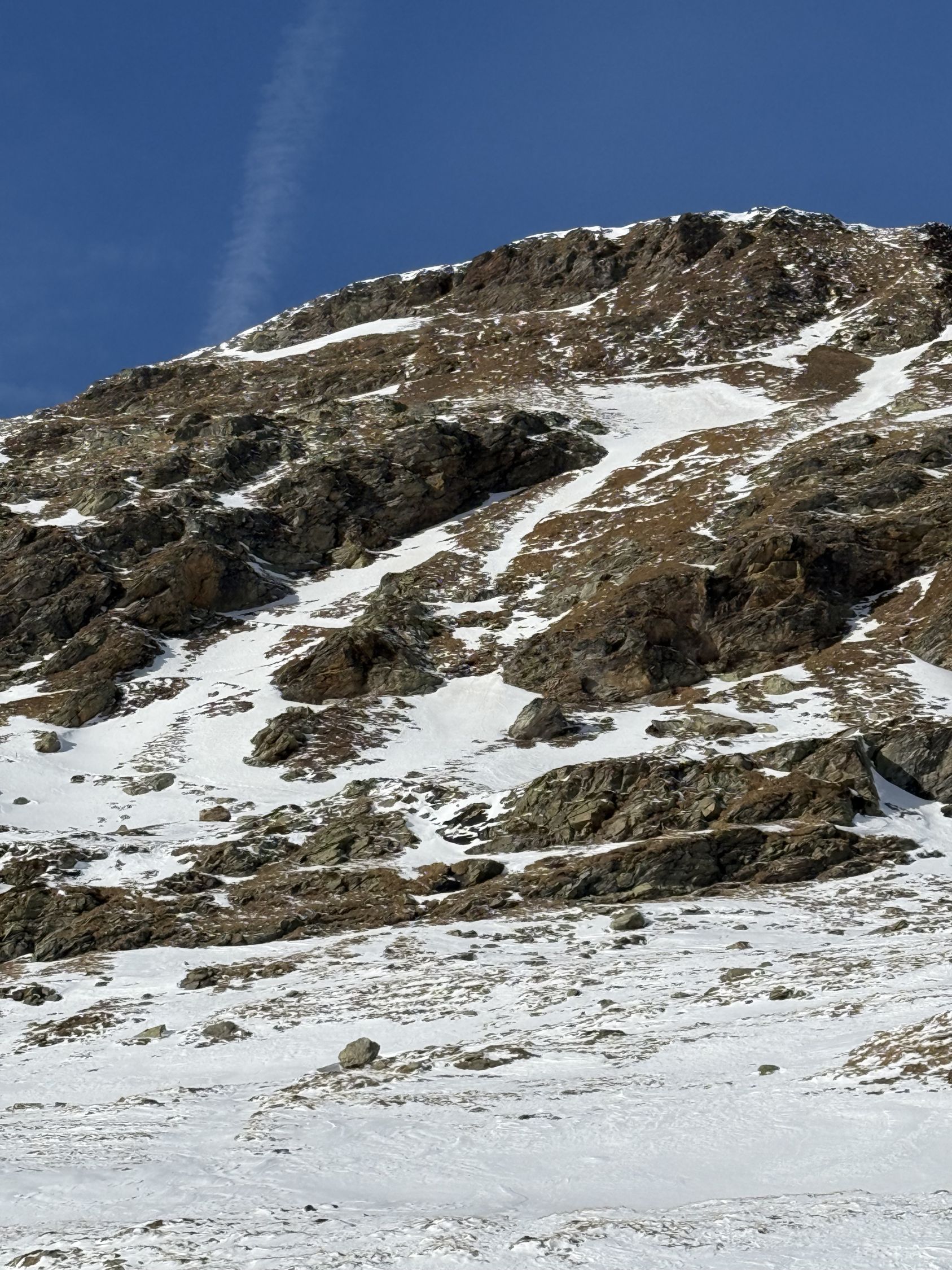 Rundtour bis Bank mit der schönen Aussicht und schwieriger Abstieg in der Südflanke, T4+. Start Berninastrasse 9 Uhr, minus 12 Grad, leichter Nordwind, blauer Himmel. Angenehmer Aufstieg mit Hochtourenschuh auf Schneeschuhspur bis Bänklein Punkt 2698. Den Gipfel habe ich mir heute geschenkt, die Bergstation unterhalb des Gipfels ist ja auch nicht gerade ein interessanter Bau! Für Abstieg habe ich die Grödel montiert. Hatte mehr Schnee als ich gerechnet habe, vorsichtiger Abstieg, teilweise sehr steil und hart. Im Val dal Bügliet eine Schneeschuhspur bis Parkplatz Berninastrasse. Tolles Ambiente, hatte wie erwartet den Berg für mich alleine, der Skibetrieb ist infolge Schneemangel eingestellt.