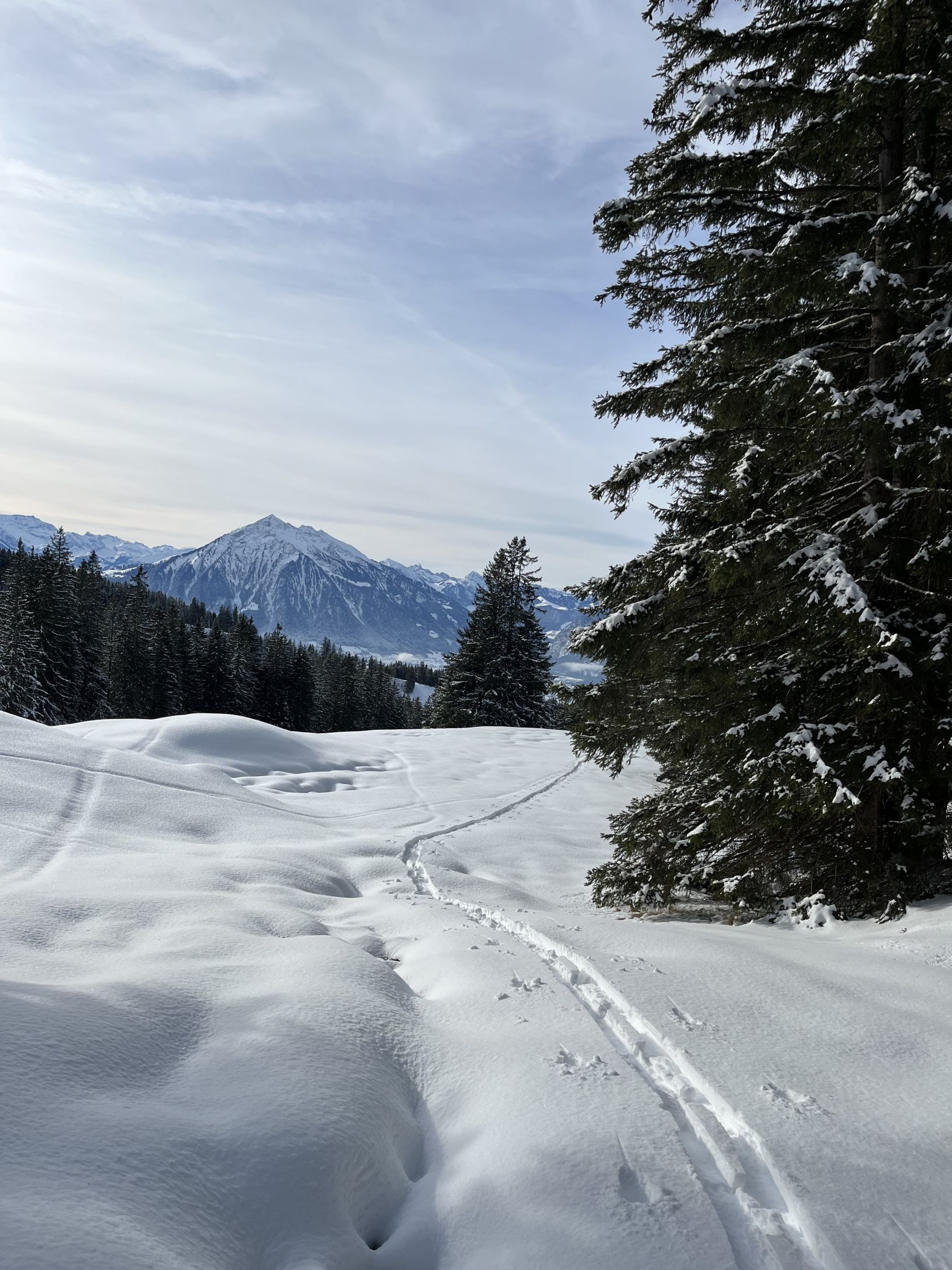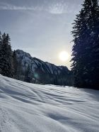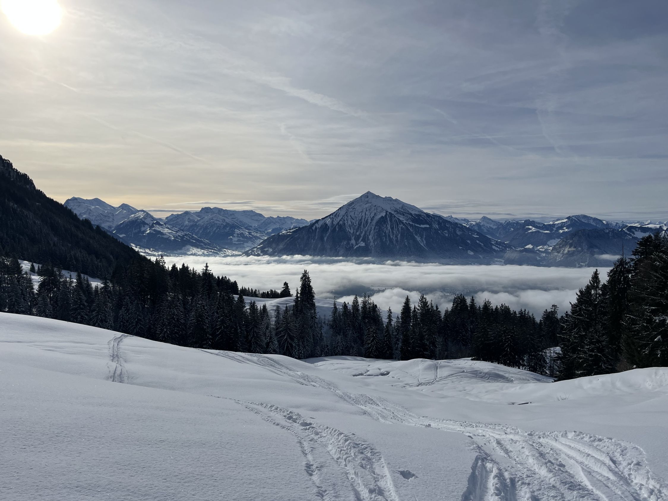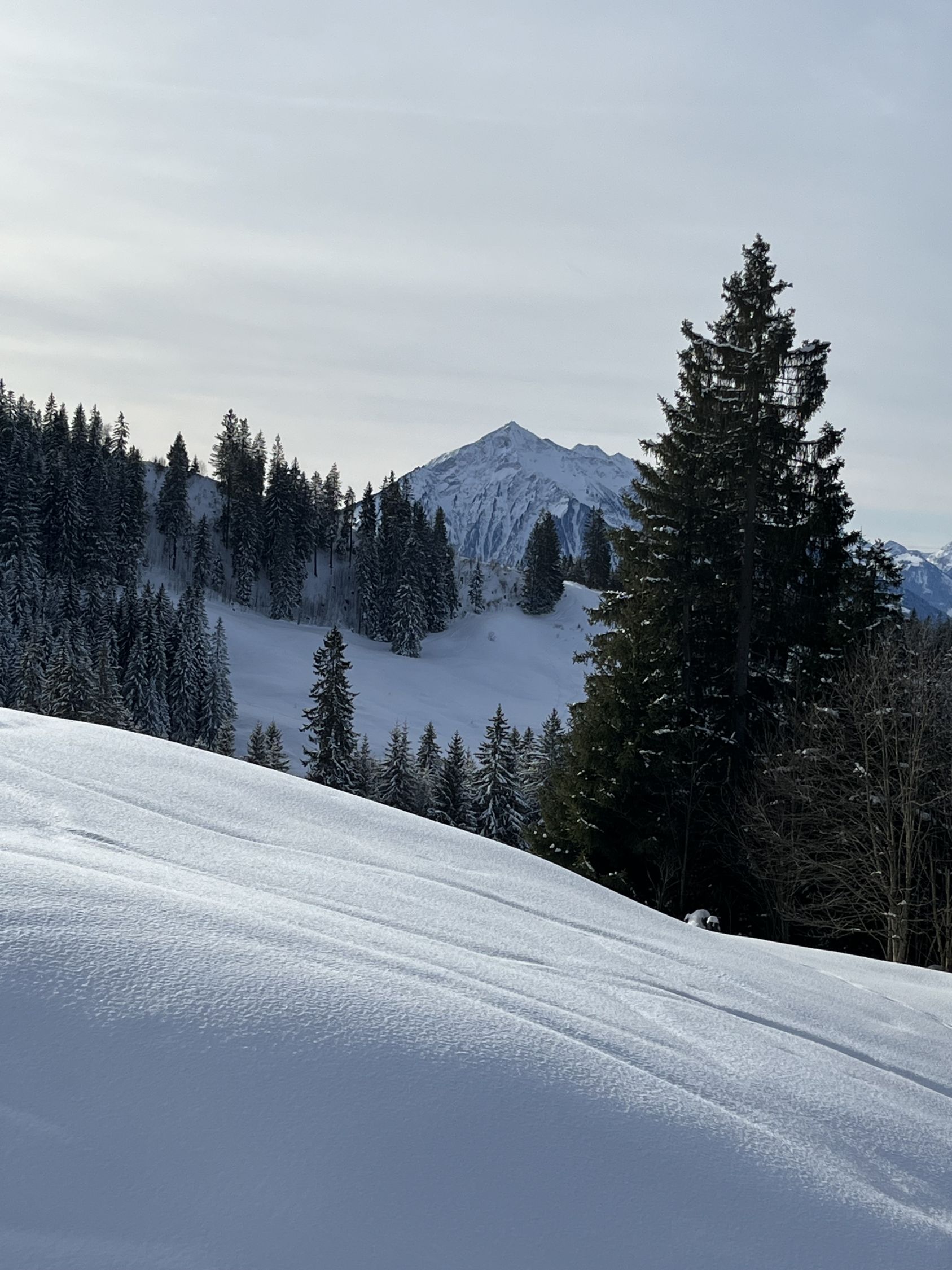 Abfahrt durch Pulverschnee mit Unterlage zurück ins Skigelände. Mit Lift nochmals hochfahren und erneute Abfahrt durch unverspurtes Gelände mit Niese und Seeblick.