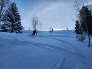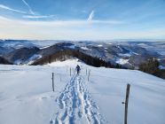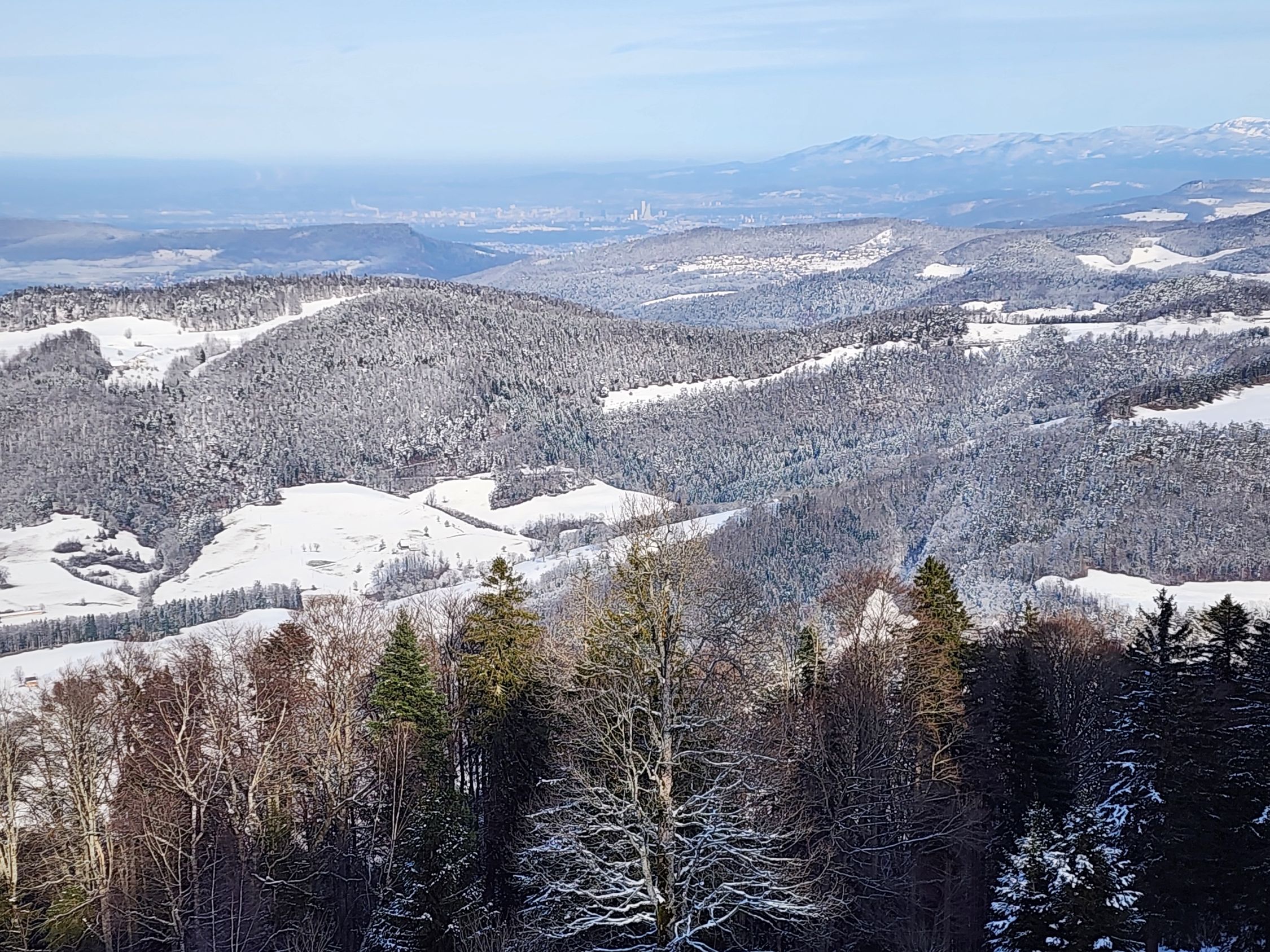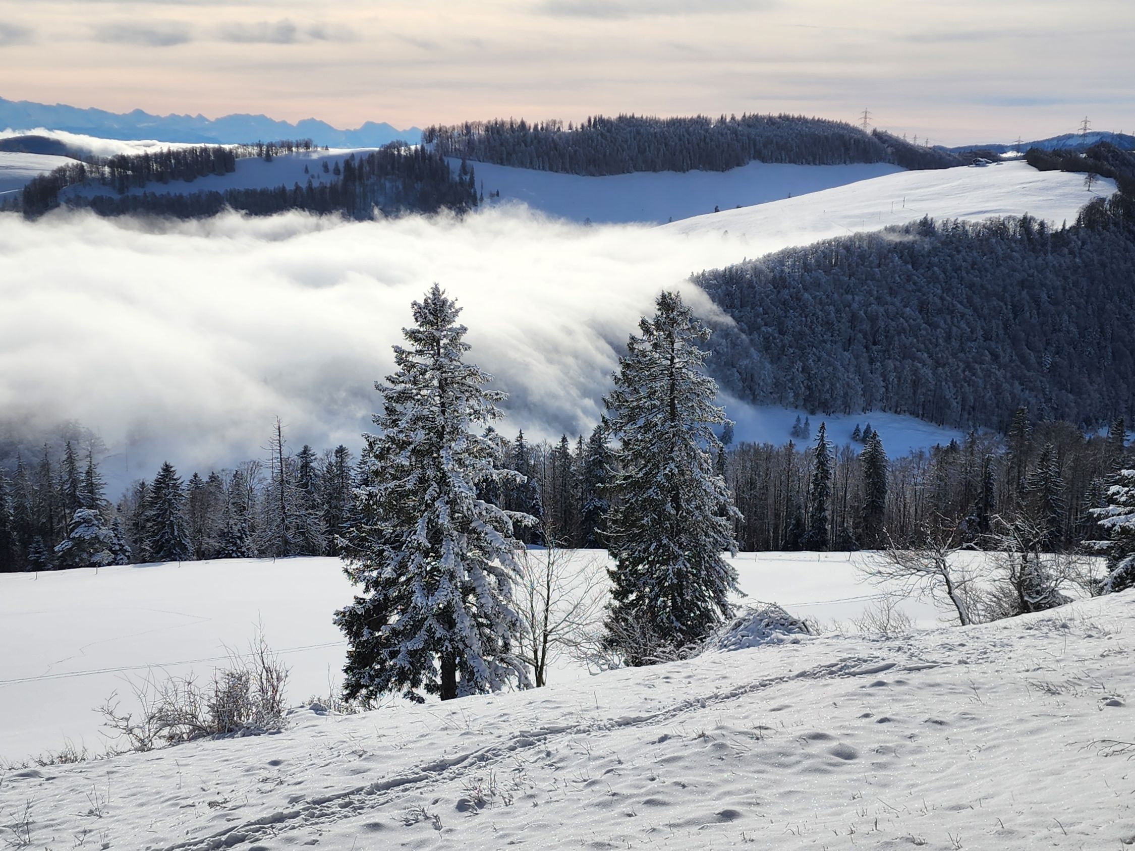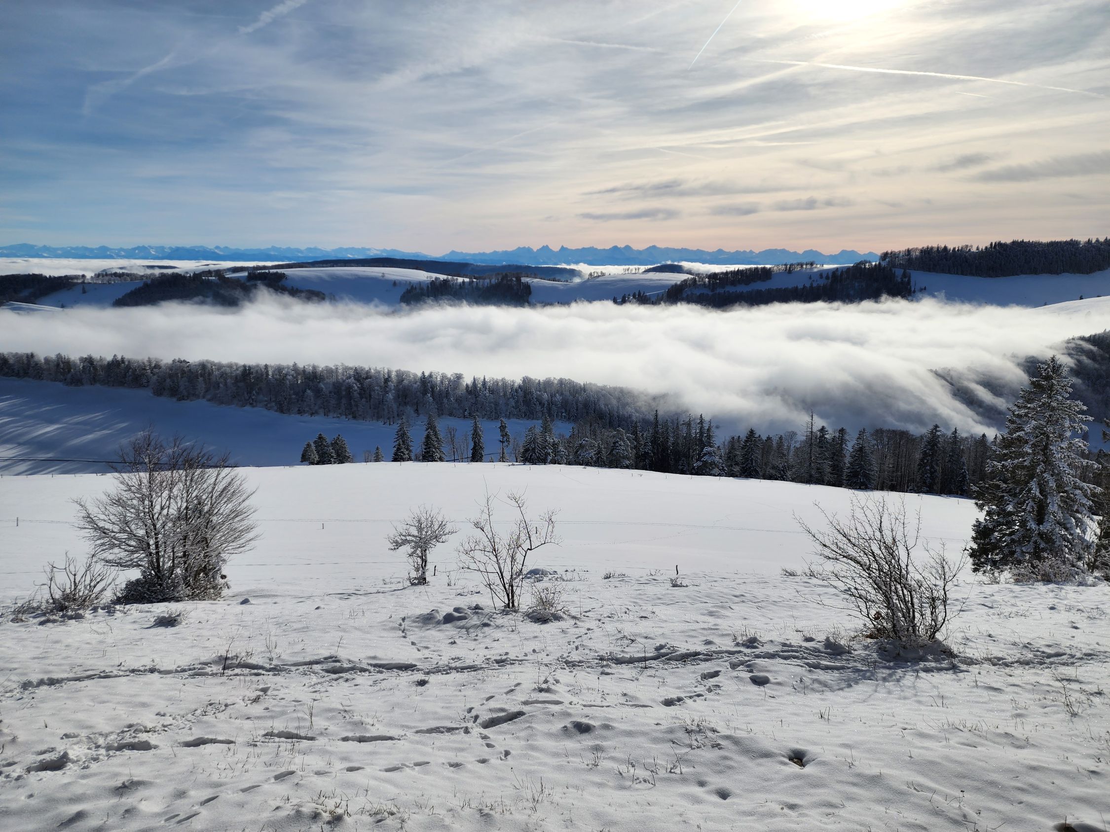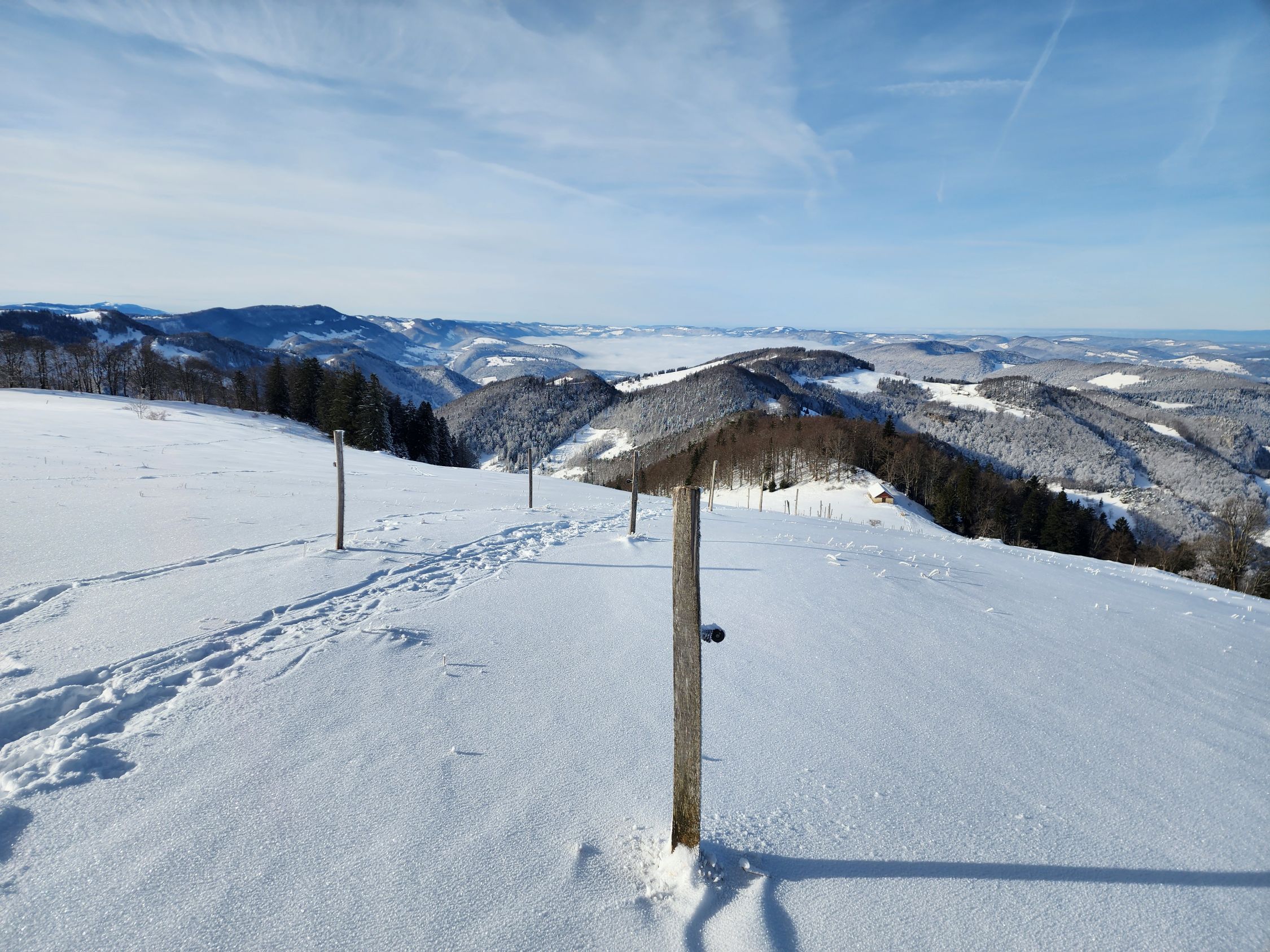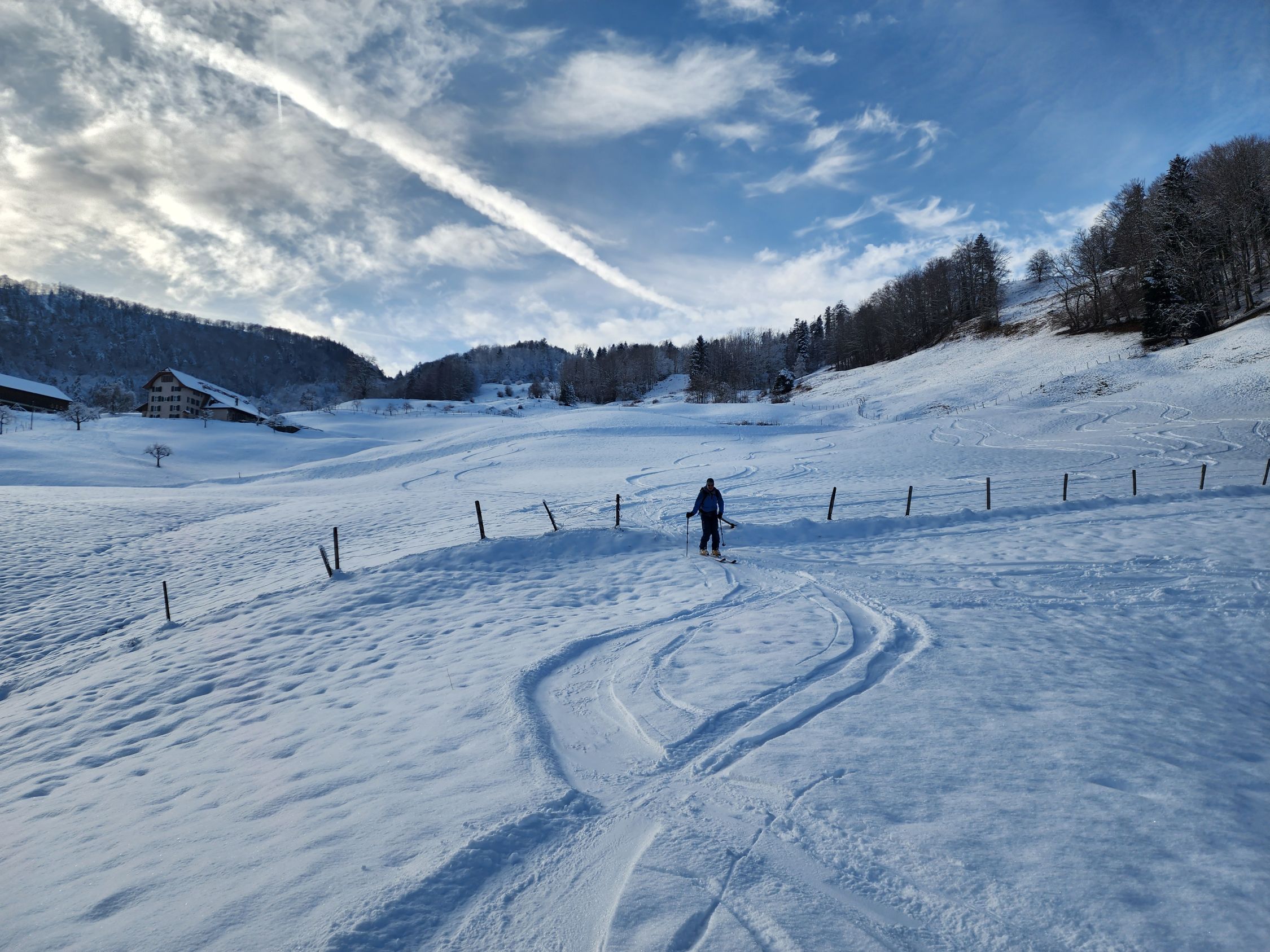 Wir sind mit dem Shuttle und dem Skilift bis auf 1057m hochgefahren. Der Skilift läuft und eine Bergfahrt kostet 5Fr. Durch den Wald mit Skiern hoch, im Abstieg getragen. Ansonsten erstaunlich gute Verhältnisse und toller Schnee bis zur Haltestelle Schachen trotz eher wenig Schnee. Tolle Aussicht nach Basel, das Nebelmeer im Mittelland und die Alpen.