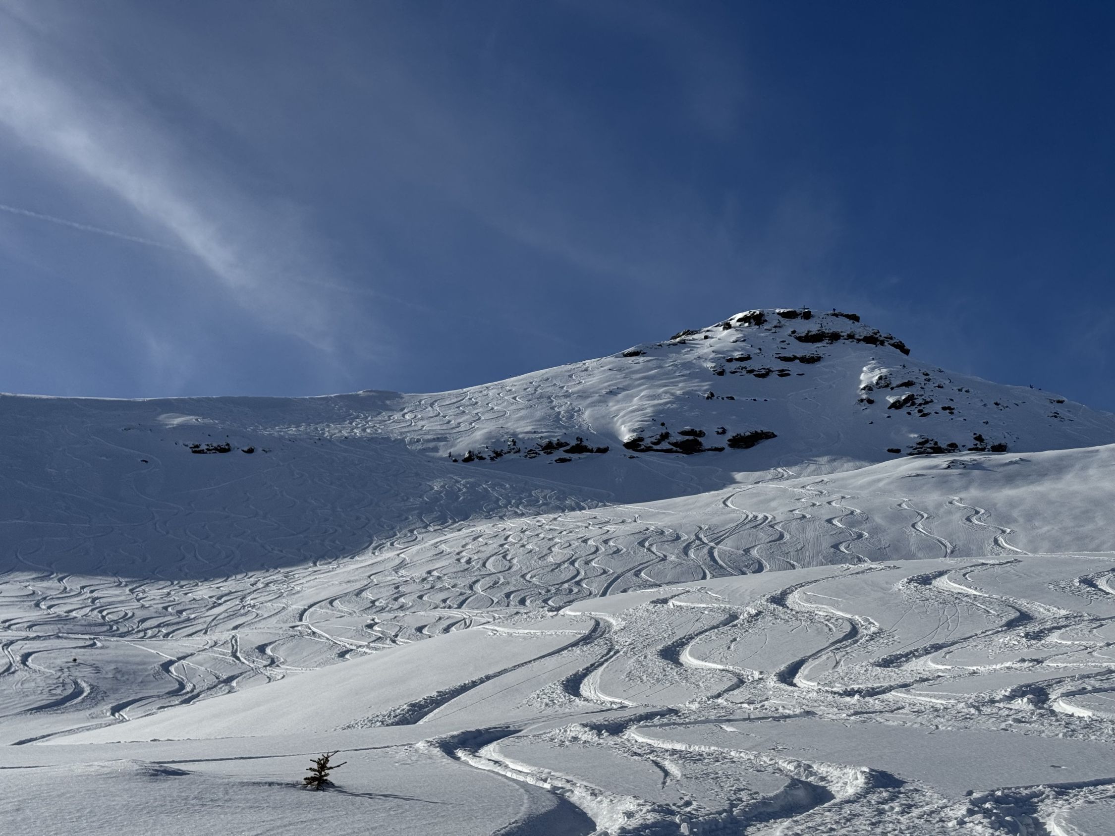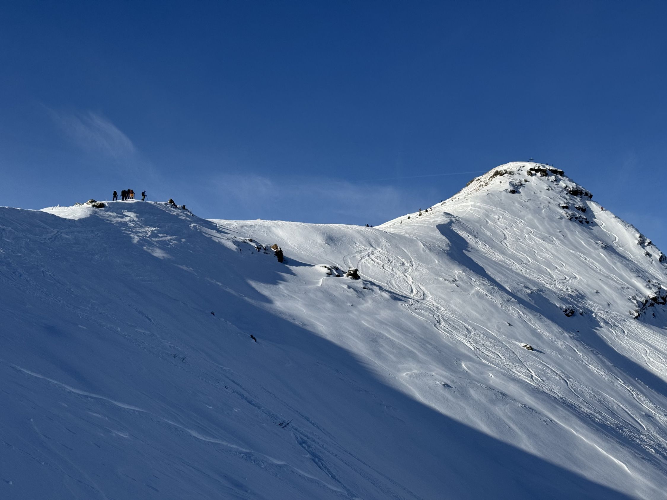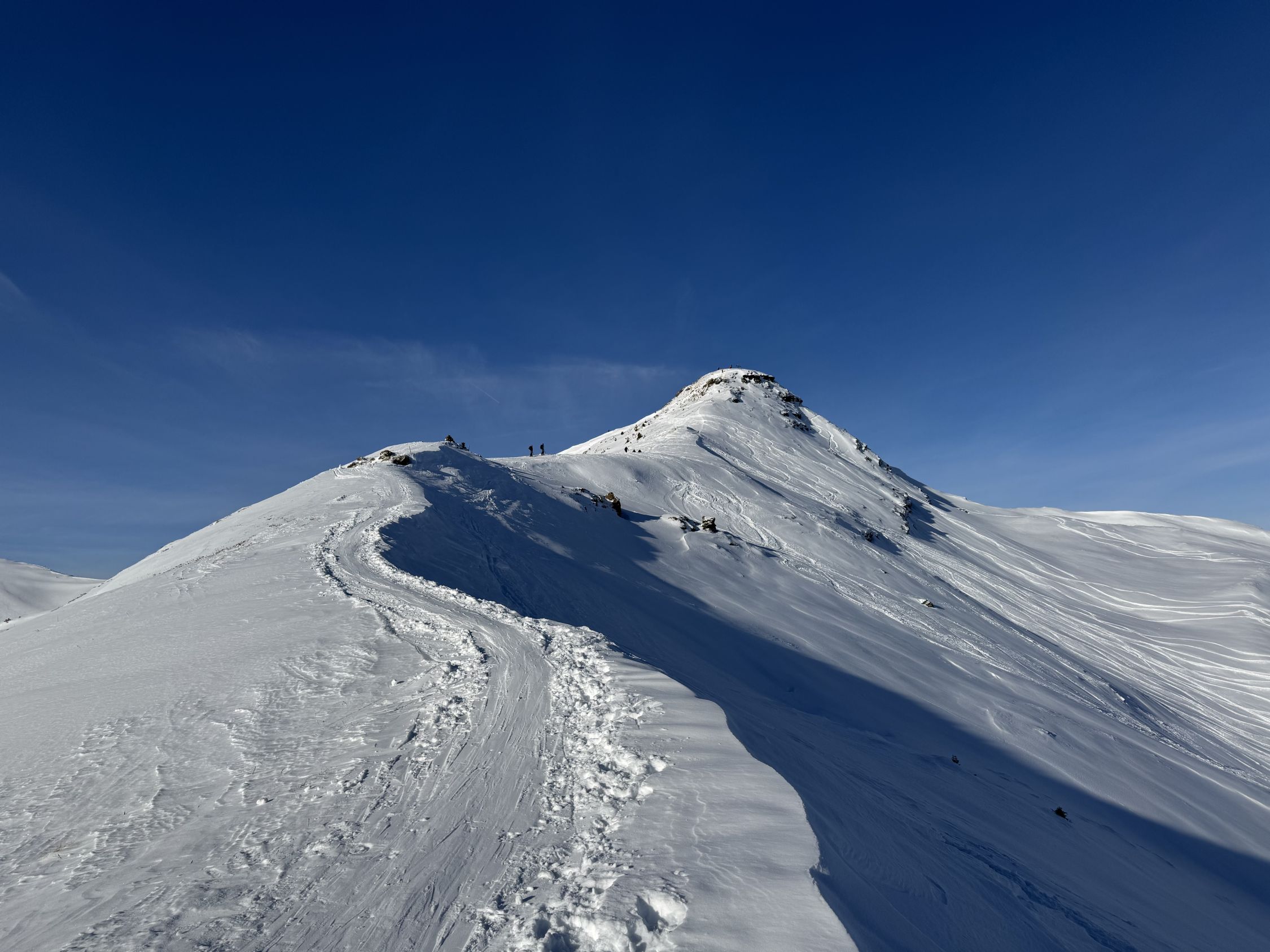 Traumhafte Bedingungen am Hüenerchopf - Pulverschnee auf harter Unterlage von oben bis unten. Grat und Gipfel sind abgeblasen.