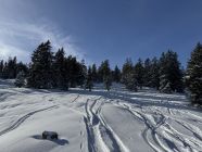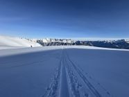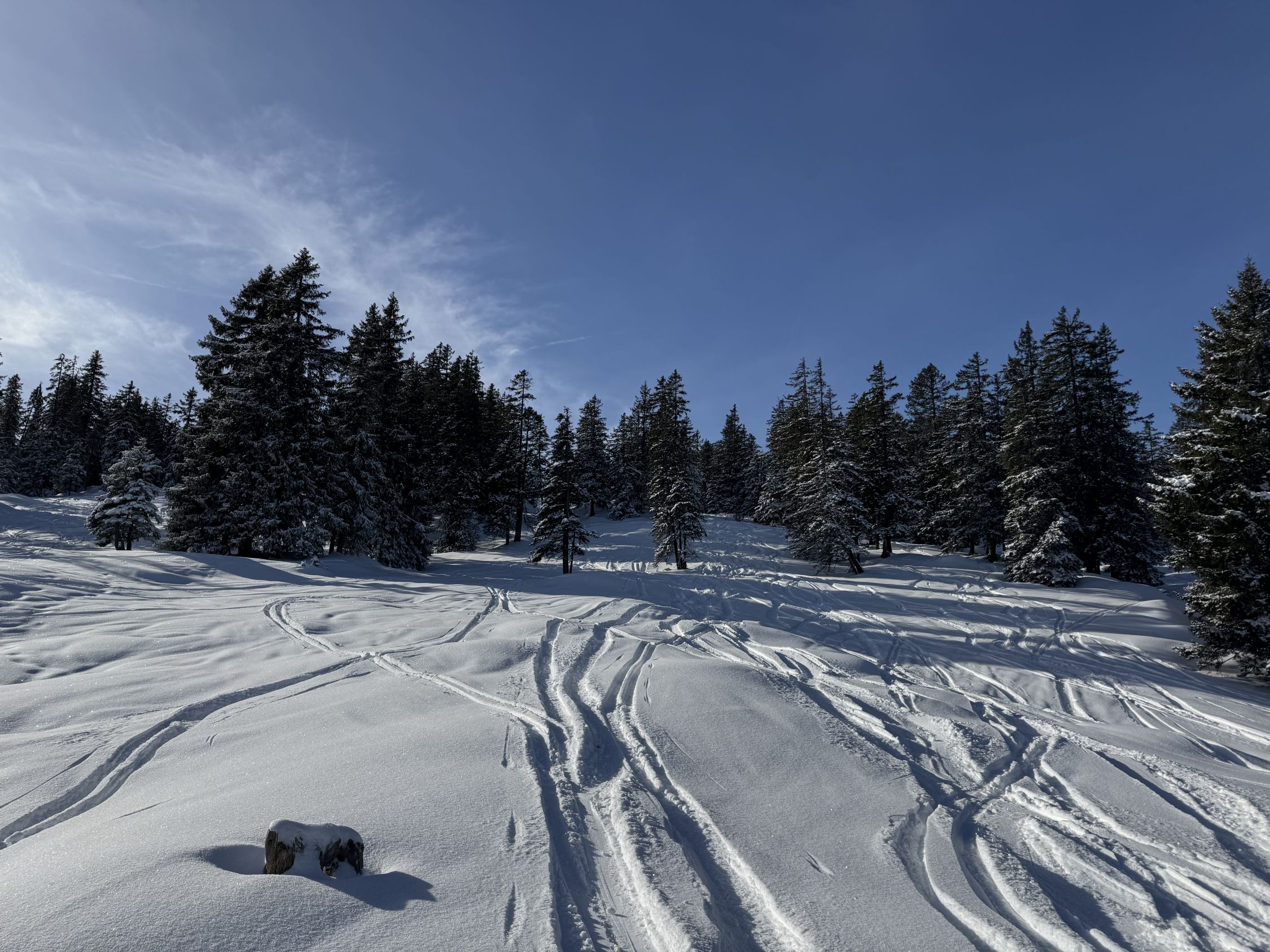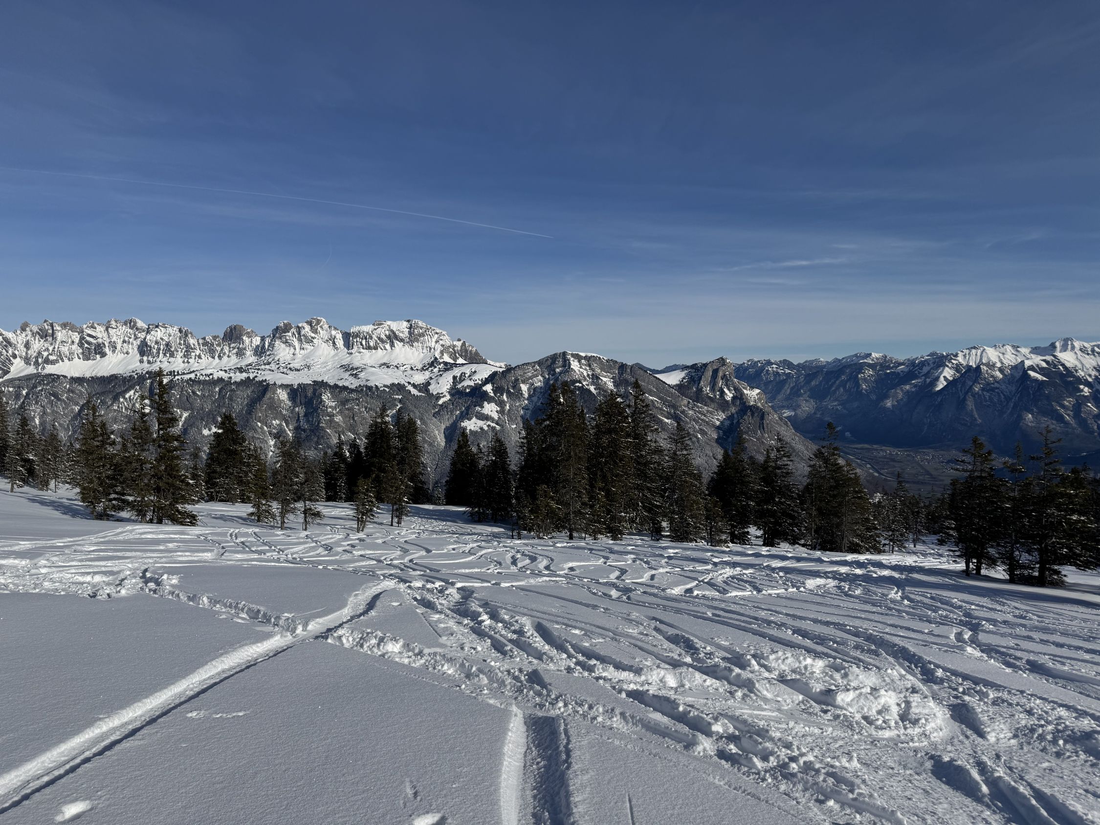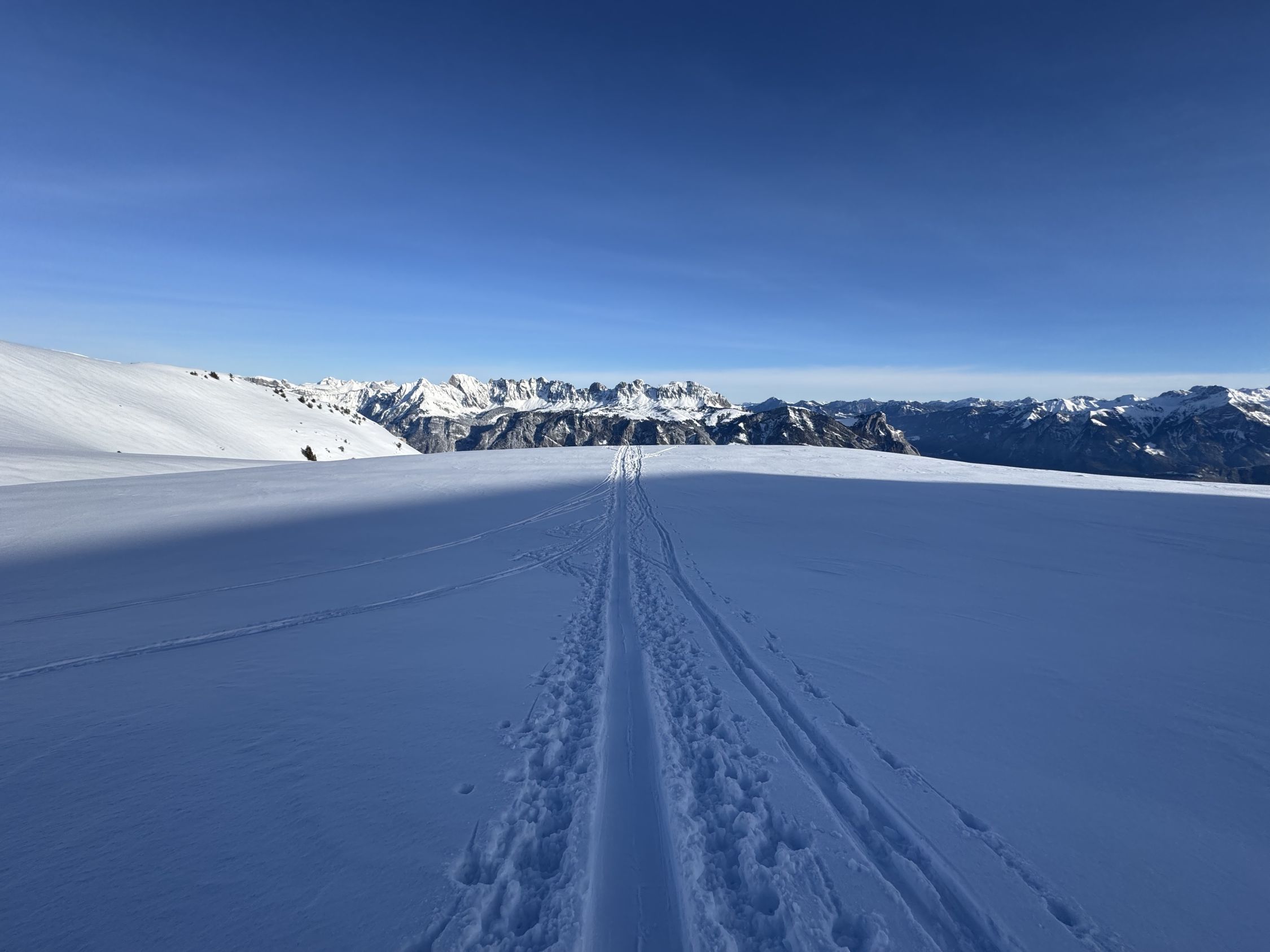 Traumhafte Bedingungen am Hüenerchopf - Pulverschnee auf harter Unterlage von oben bis unten. Grat und Gipfel sind abgeblasen.