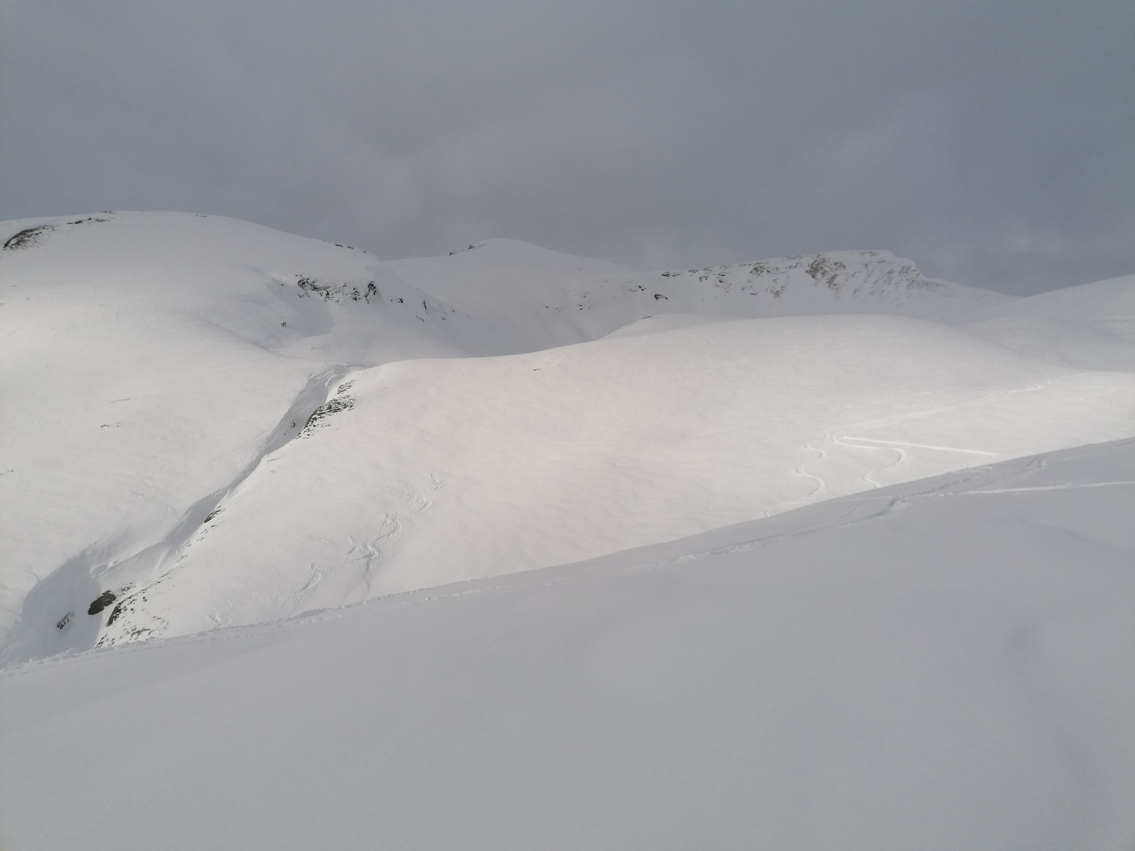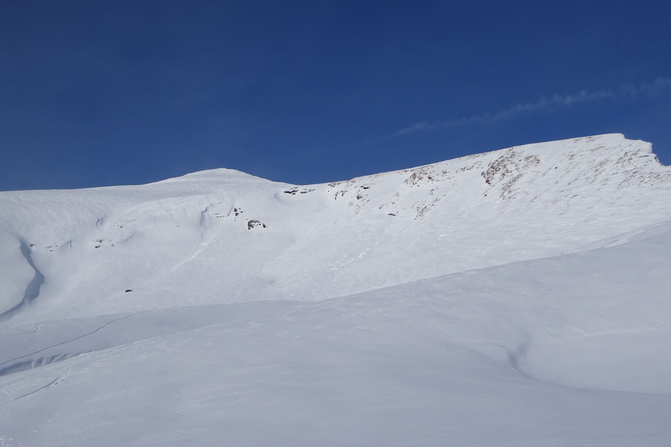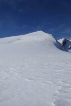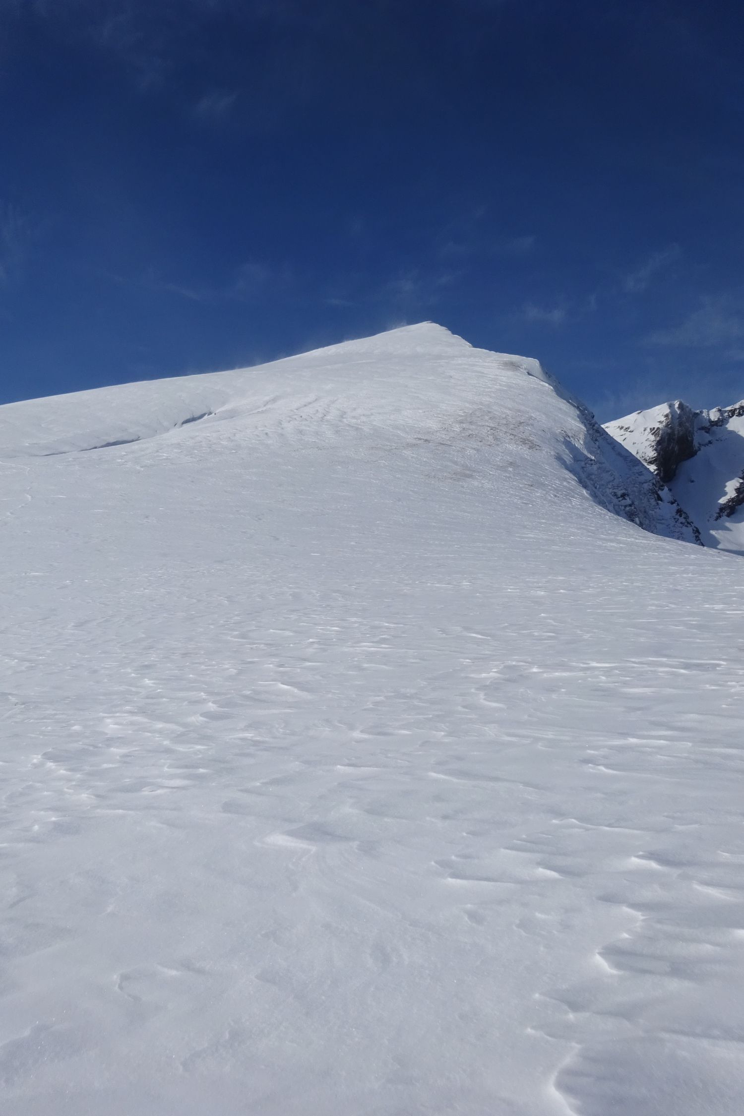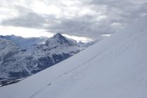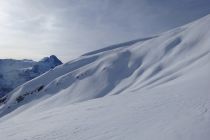 Ausgezeichnet. D.h. bis zum Umkehrpunkt auf 2500m waren die Verhältnisse ausgezeichnet. Mit 30cm bis 50cm Pulverschnee in den Mulden und Hängen. Der Gipfelaufschwung hatte viel Bodenwind abbekommen, es wehte noch immer ziemlich stark, und es hatte gebundene Schneeplatten auf einer harten Unterlage. Das empfanden wir als zu heikel. Umdrehen gehört auch zum Alpinismus. Der Berg bleibt dort. Wir kommen wieder.