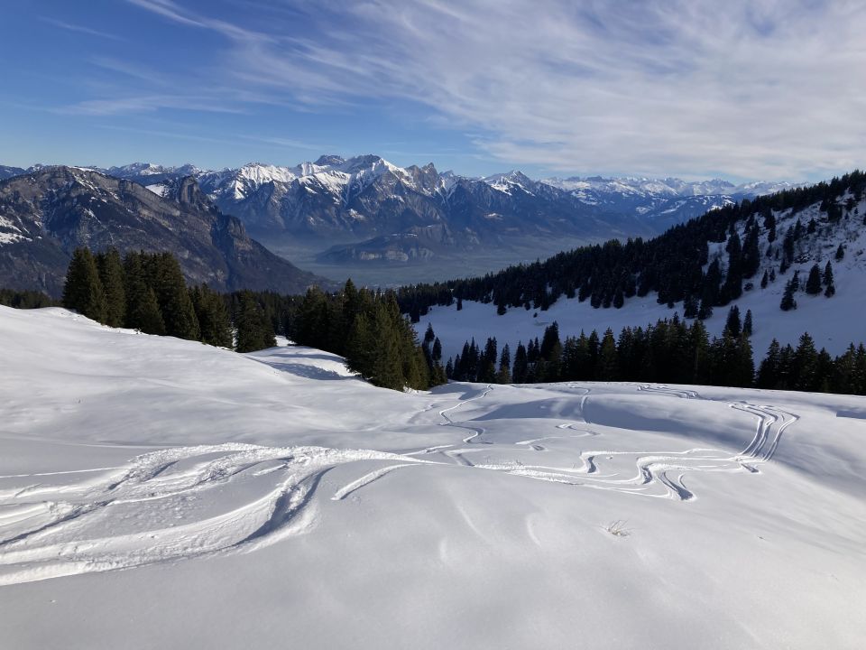 Tour ab Berghaus Schönhalden möglich. Sonneabgewandt noch schöner Pulverschnee. Aufstieg im Gipfelhang durch Gleitschneebrett erschwert.