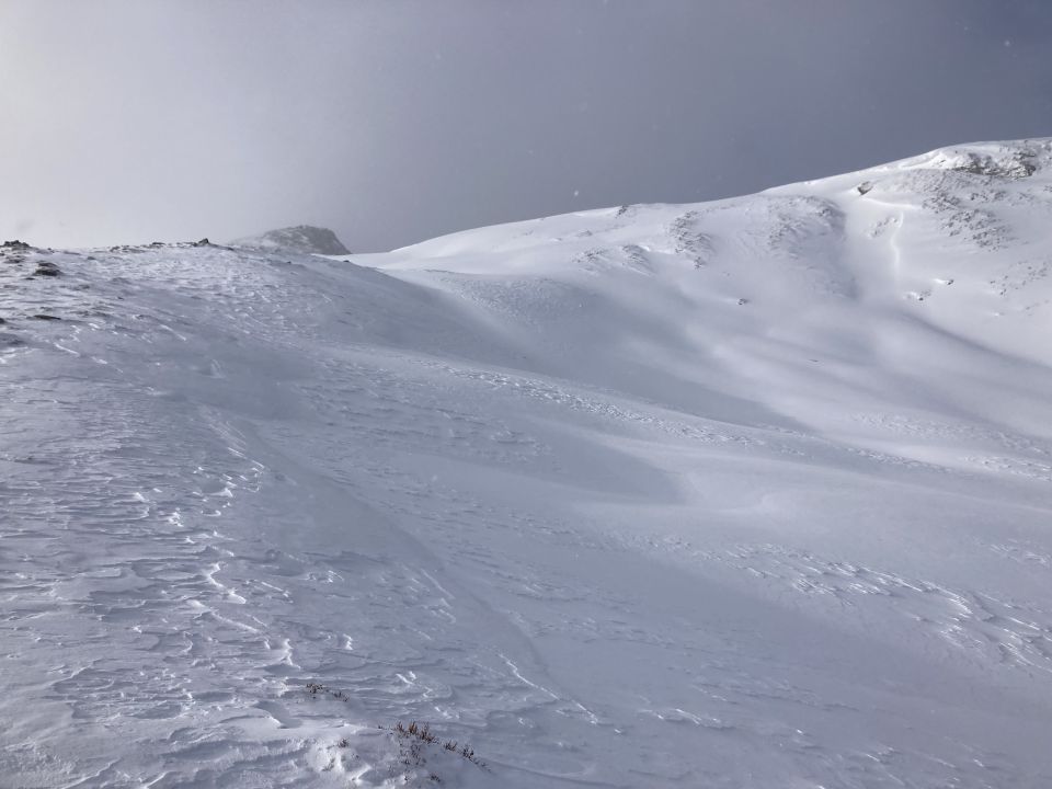 Maue Schneelage, die Tour vor allem im oberne Bereich vom Wind gezeichnet. Das Plateau und der Übergang nach Stalverder voll ausgeblasen. Die letzten 3oo hm jedoch noch schöne Pulverschwünge