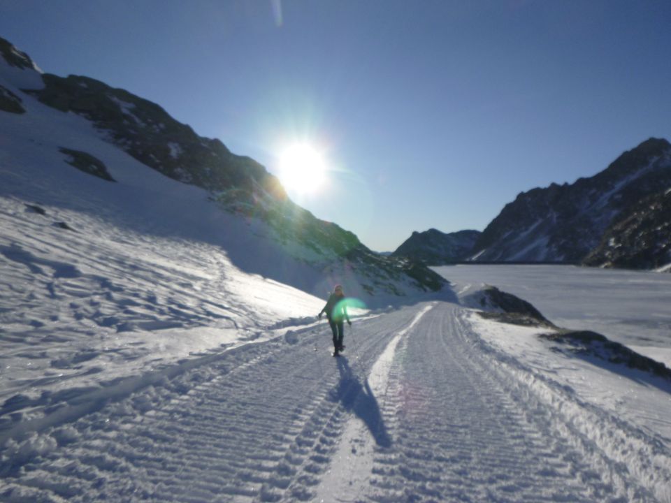 Tourenbeginn um 08:55 Uhr bei -1°C unter klarem Himmel ab der Duisburger Hütte, die im Winter bewirtschaftet ist. Tagsüber wurde es dann recht warm. Wir stiegen hinzu zum Raupenfahrweg am Hochwurtenspeicher ab und dann weniger steil zur Talstation der Panoramabahn hinauf. Für den Rückweg wählten wir nach dem Ombrometer die Piste Nr. 8 hinauf und bogen dann rechts ab zur Piste Nr. 9 hinab zur Duisburger Hütte. Der Südgrat war im oberen Bereich zum Teil schneefrei.
