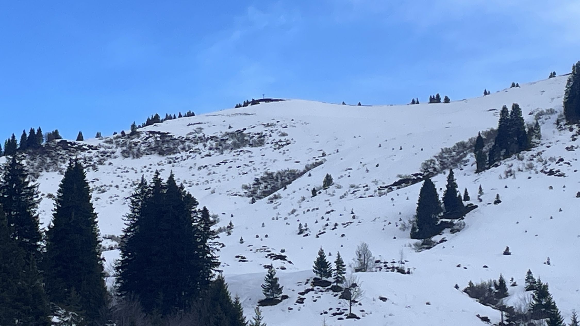 Wir hatten gehofft, noch etwas mehr Schnee beim Gerenfalben vorzufinden. Beim Anblick des Gipfelhangs (siehe Verhältnisfoto) haben wir Plan B gezogen und sind über die Strasse zum Furkajoch gestiegen, damit wir wenigstens etwas Bewegung hatten.