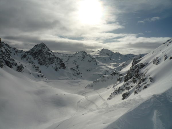Durch die z.T. üppigen Schneefälle am WE vom 27./28.3. (im Mont Blanc Gebiet 40-50cm; weiter östlich ca. 30cm) hatten wir ideale Tourenverhältnisse: 1.) Super Pulverschnee für die Abfahrten, 2.) guter Trittfirn bei den Aufstiegen (Ski am Rucksack) an den steilen Pässen (s. Etappe 1+2) und 3.) die Möglichkeit ohne Schwierigkeiten steile Passagen auf Skiern (mit Harscheisen) statt wie in der Karte markiert „zu Fuss“ zu bewältigen (im weiteren Verlauf der Haute Route (s. Etappe 5+6)).