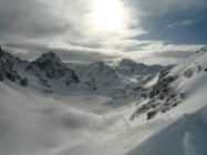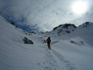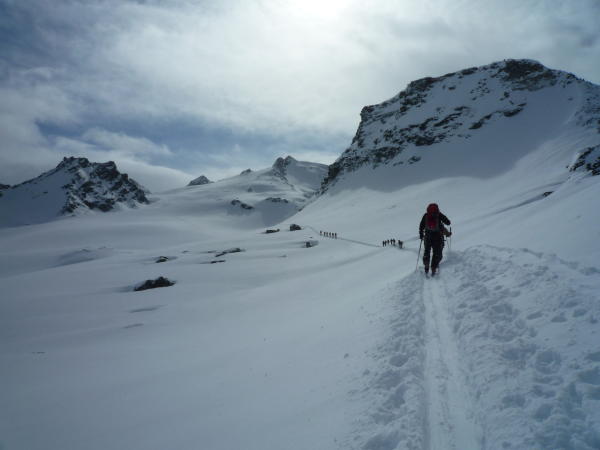 Von der Cabane du M.Fort (2457m) zunächst der Piste entlang im Tal aufwärts bis ca. 2700m, dann weiter südwestwärts auf den Col de la Chaux (2940m), den wir nach 1,5 Std. erreichten.