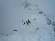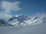 Ostseitig der Scharte genießen wir die sonnigen Powderhänge bis in flacheres Gebiet. Bald tut sich Richtung Süden der beeindruckend Blick auf die Grands Combin auf! Mit geschickter Spurwahl und etwas Gestockel kann man fast bis unter den Col de Louvie rutschen. Auffellen und zwischen "dekorativen" einzelnen Felsklötzen hindurch hinauf zum Col de Momin (3015m). Auf der anderen Seite des Sattels quert man möglichst ohne Höhenverlust das Gletscherbecken in östlicher Richtung und steigt dann am südlichen Felsausläufer des Pt M.Calme vorbei auf. Man ersteigt die Nordflanke des Rosablanche (3336m) eher an deren östlichem Ende. Die letzen Meter zum Gipfel(kreuz) ersteigt man ohne Ski auf Firnstufen; seit dem Start an der Cab. du M.Fort sind genau 4 Std. vergangen. Aufgrund der aufgezogenen Bewölkung waren die meisten direkt zur Cabane de Prafleuri abgefahren; nur eine handvoll hatte den Abstecher zum Gipfel gemacht - leider keine Panorama-Aussicht.