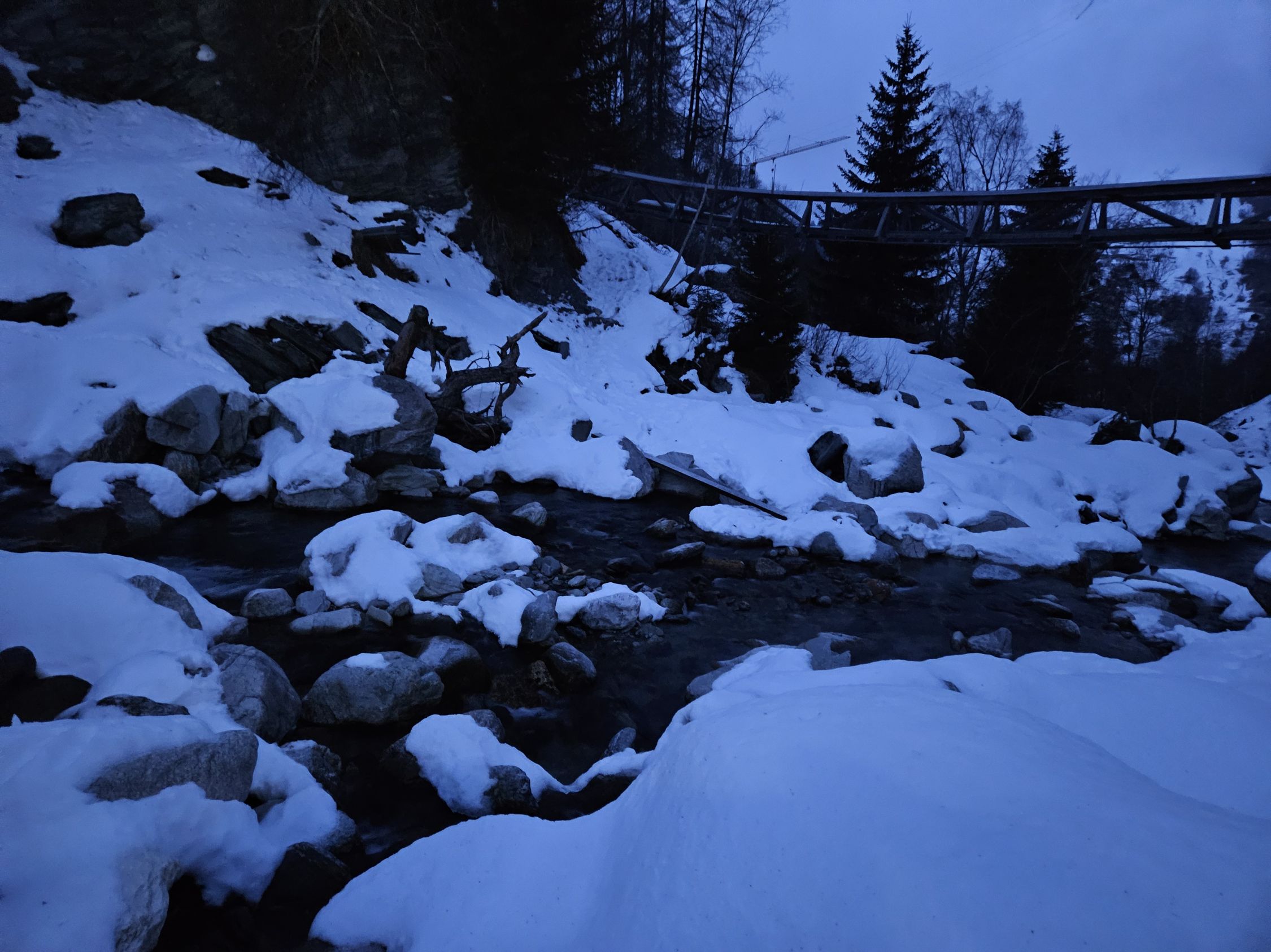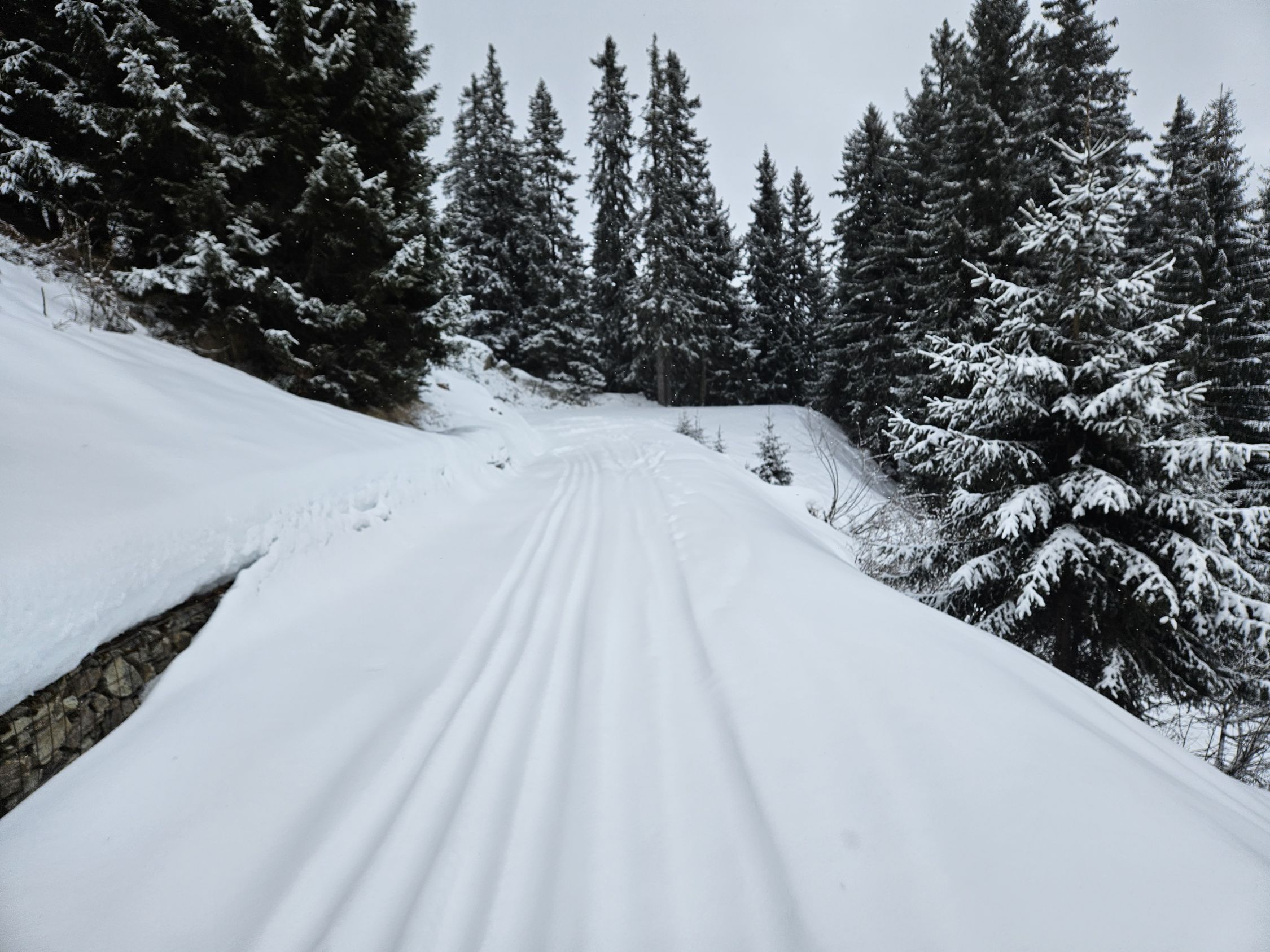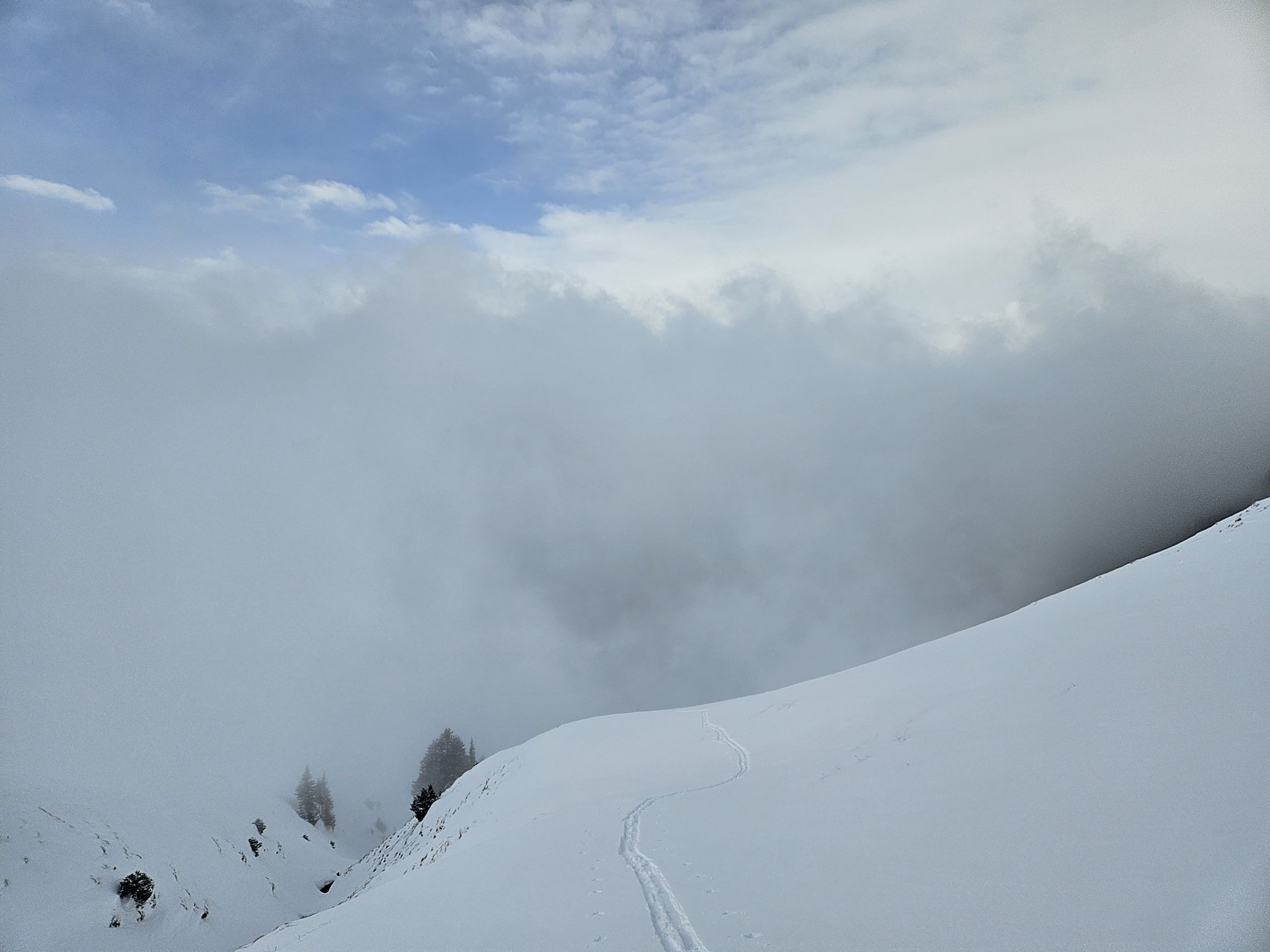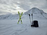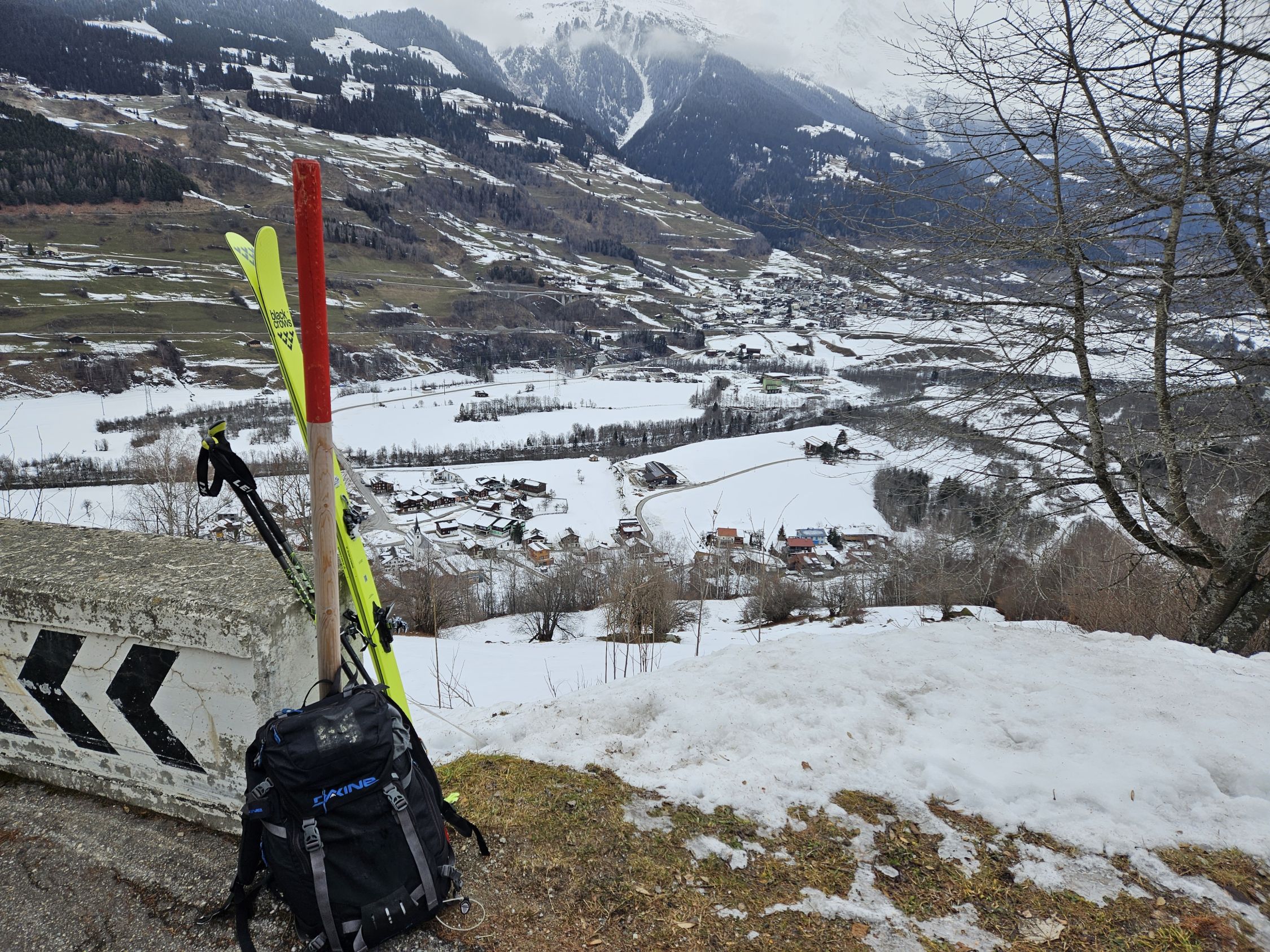 Die Hängebrücke auf dem kürzesten Weg von Curaglia (1334 m) nach Soliva (1492 m) ist gesperrt und dadurch gleich der ganze Weg, obwohl man mit etwas Geschick den Bach auch so überqueren kann. Ab 1600 m kann man mit den Ski gehen. Ab 2100 m liegen 10 cm Neuschnee mit Windbeeinflußung. Vom Gipfel, der mehr einer Ebene gleicht, ging es im Nebel vorsichtig tastend bergab. Bis zum Punkt 2286 m auf Fellen. Unterhalb von 2050 m war wieder Sicht und annehmbare Powder-Verhältnisse. Der Weg nach Vals ist komplett mit Ski ohne Schwierigkeiten befahrbar. Leider ist das Gasthaus momentan dort geschlossen, daher ging es zu Fuß durch den Tunnel bis zum Punkt 1083 m. Hier ergab sich eine Top-Firn-Abfahrt nach Surrein (900 m) . Hier geht es in 30 Minuten zur rhätischen Bahn.