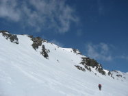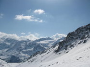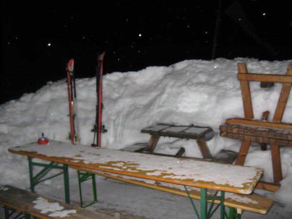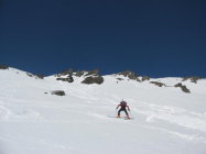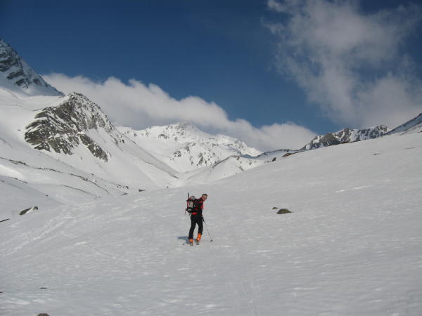 Morgens um 5.30 Wetterausschau bei der Marteller Hütte 2610m, Sterne und Schneefall, so was schon erlebt? Das Wetter sollte bis Mittag halten, die Suldenspitze war geplant. Die Front kommt zügig, es nebelt, keine gute Idee auf die riesigen Gletscherflächen zu gehen, obwohl schon einige ins Whiteout hinauszogen. Wir entscheiden abzufahren, dabei wird das Wetter je tiefer wir kommen besser. Zwischen Zufallhütte und Enzianhütte reichts uns, der Himmel zeigt sich nun im schönsten blau! Anfellen und Abmarsch ins Madritschtal, zunächst gemütlich ansteigend entlang des Baches bis das Tal einen leichten Rechtsbogen macht. Ab hier geht´s zur Sache, das steile Spitzkehrengelände, es waren unendlich viele, wird nur zweimal von einem kleinen, flacheren Absatz unterbrochen, es führt aber eine sehr gute Spur hinauf. Bei der Gratlücke ist der Gipfel immer noch versteckt, rechts querend über den ruppigen, harten Steilhang hoch (Harscheisen). Inzwischen schlägt das Aprilwetter wieder zu, besser es macht zu. Mehrere Gipfelanwärter taumeln fast seekrank in der Nebelsuppe zum Kreuz. Da kommt Gioseppe mitten aus dem Weiss singt La Montanara und bringt Stimmung mit, brava! Doch die bevorstehende Abfahrt ist nicht zum Lachen, eher zum Haxenbrechen! Heute hat hier jeder standhafte Schenkel zu zeigen, es ist eisig und hart, die markante Abkühlung zeigt Wirkung. Die meisten fahren durch´s Butzental, es ist weniger steil, der Schnee aber schlecht. Wir tasten uns ins Madritschtal, fahren im Pulver fast bis zum Rio Madriccio. Anstrengend ist nur, fast keine Sicht zu haben. Durch das Tal, rechts des Baches fegt´s flott auf einem hart gefrorenem Deckel hinaus, bevor in die "Bobbahn" des Zustiegs zur Zufallhütte eingebogen werden kann. Glücklich landen wir beim Auto, Gioseppe, Monica und die Sonne! lachen wieder.