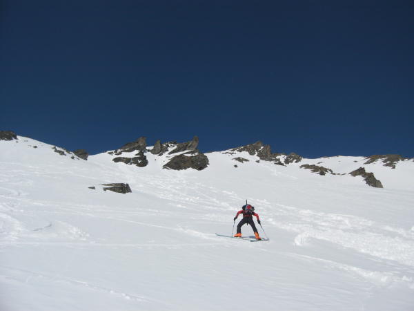 Madritschtal, vom Talboden steil zu P. 3040 zur Gratlücke der Madritschspitze, rechtshaltend queren und über den Gipfelsteilhang zum Kreuz, Abfahrt wie Aufstieg zur Enzianhütte und anschl. Heimfahrt;
