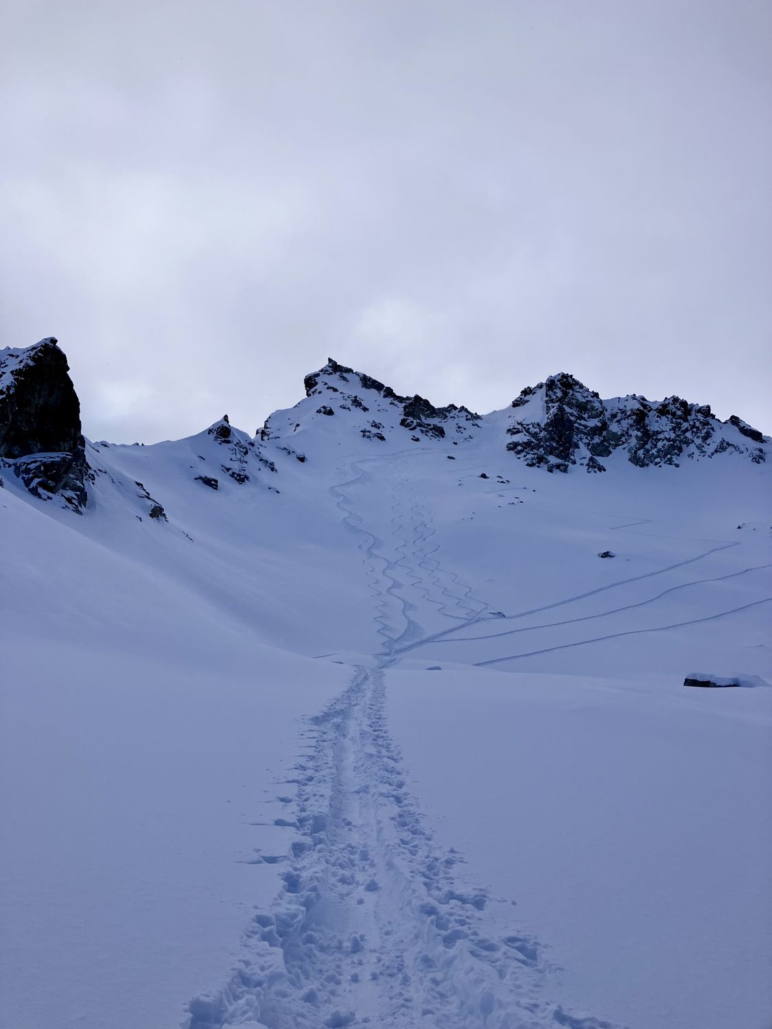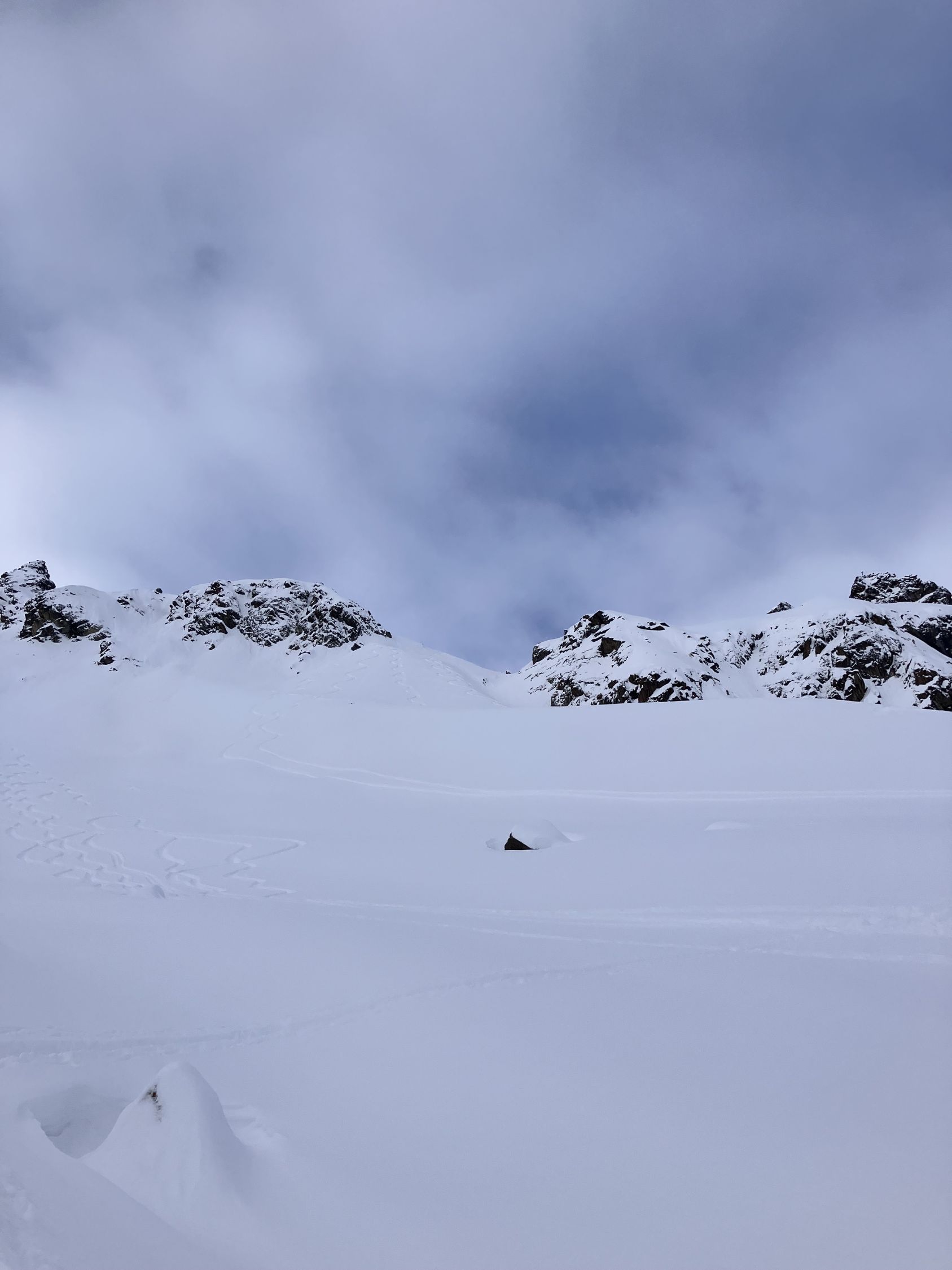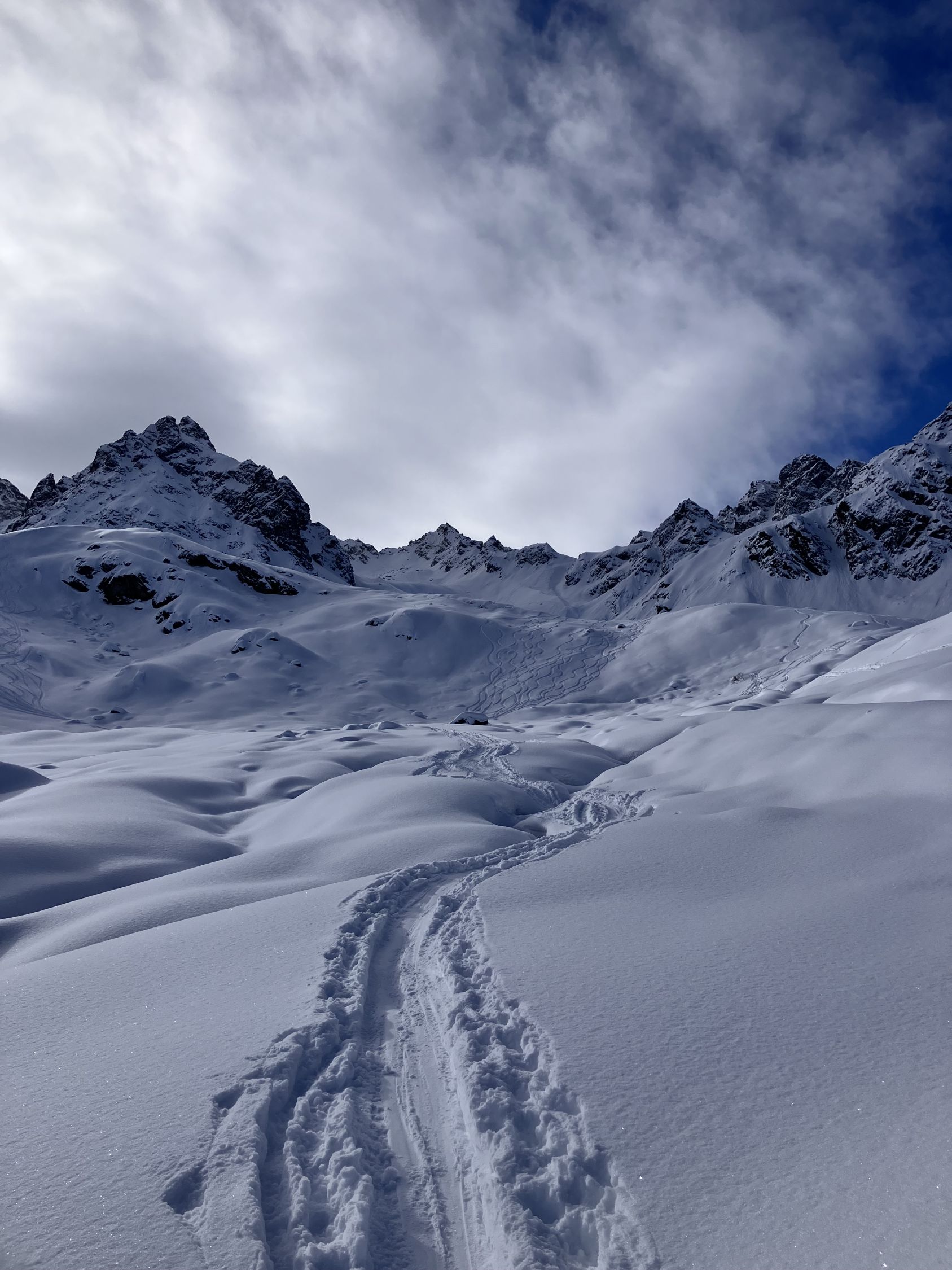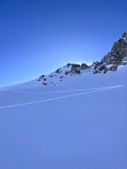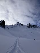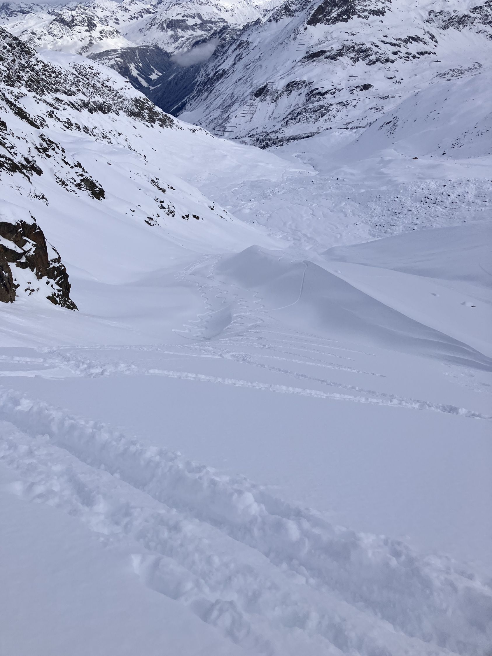 Ab Kromertal absoluter Traumpowder heute, der Aufschwung zum Schweizer Gletscher heute auch mit Splitboard sehr gut machbar. Letzte 50-100hm unter der Scharte windbeeinflusst, ich bin zu Fuß gegangen, ziemliche Wühlerei aber gut machbar ohne Steigeisen.