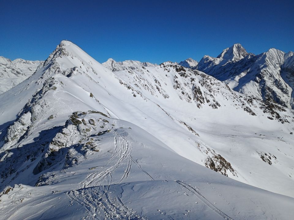 Immer wieder ein paar hübsche Schwünge im Triebschnee möglich, dazwischen windbearbeitet und teils auch abgeblasen auf den Rücken. Aber ganz gut fahrbar eigentlich...