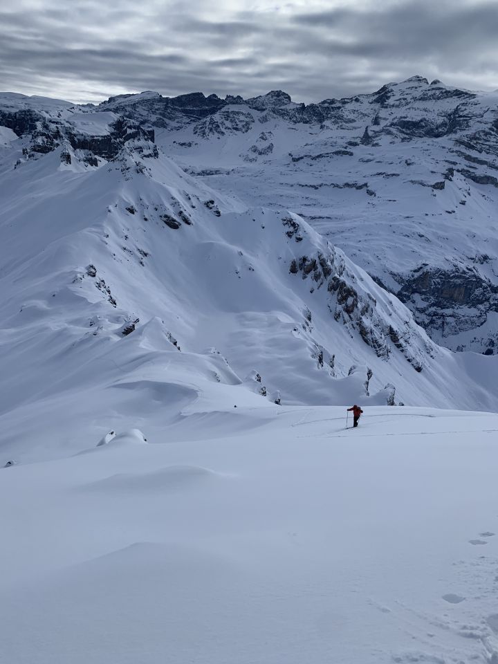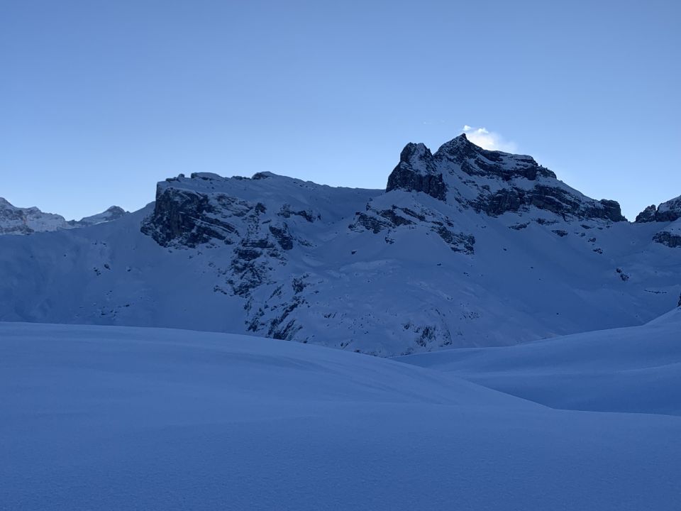 Start am oberen Parkplatz um 7:30 Uhr bei -8 °C. Bis Ruosalper Chulm im Schatten. Dank den beiden Vorspurern, die uns bis zum letzten Hang unterhalb der Chulm viel Arbeit abgenommen haben. Ab dann jungfräulich unverspurt. Keine Lawinenanzeichen, insbesondere Windeinfluss und Triebschnee, erkannt, daher die Tour auch bei der ausgegebenen Stufe 3- als vertretbar angesehen. Tiefe Wühlarbeit im Couli, oben heraus besser. Fantastischer Schnee in der Traverse zum Ansatz des SE-Grats. Einstieg Grat heikel, Lockerschnee, wenig Sicherungsmöglichkeiten. Sobald der Charakter firnlastig wird, deutlich einfacher, wenn auch zum Teil tiefe Spurarbeit (weiterhin ohne Triebschneeansammlungen). Abstieg vom Hauptgipfel am Steinmann rechts vorbei (Achtung Wechten links). Im Couli tiefer Pulverschnee, bis zur Engstelle sehr gut fahrbar (wenn man das Fahrkönnen mitbringt). Engstellen aktuell nicht fahrbar, die untere geht nur mit Steigeisen). Unten heraus viel Slush, der von oben beständig rieselt. Hammerpow in der Abfahrt bis Oberstafel, dann leichter Deckel aber immer noch schön zu fahren. Ab dort bereits stark verspurt. Sehr kalt, Getränke froren im Rucksack ein.