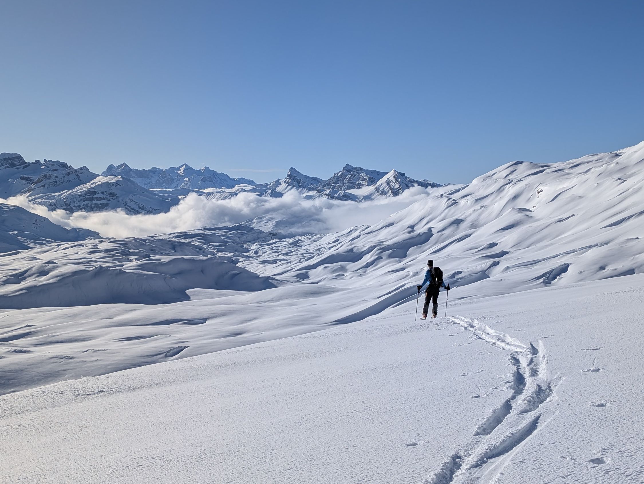 Start bei der Bergstation Gumen und traversiert bis ins Bützi. Danach ein langes auf und ab bis in die Erigsmatt und nach vorne ins Tal bis zum Charetalphüttli. Felle abziehen lohnte sich leider kaum. Vom Pfaff in die Glattalphütte gabs dann einen kleinen Vorgeschmack auf den schönen Pulver. Nach einer Nacht in der geräumigen Glattalphütte dann Start bei Eiseskälte über Glattalpsee hinauf in die Furggele. Danach Traumabfahrt in den Lauchboden. Weiter über Fanen, hatte knapp genug Schnee, bis zum Bergetenseeli. Danach nochmal 1h Felle drauf und zurück ins Skigebiet. Keine Menschenseele getroffen und alles komplett unverspurt.