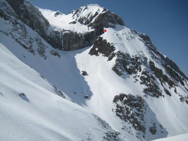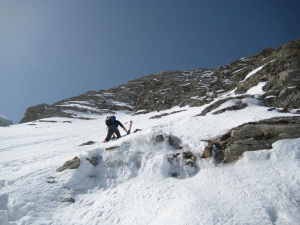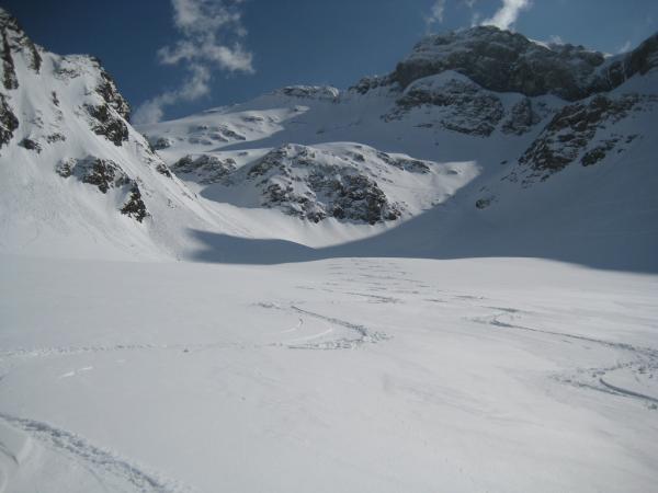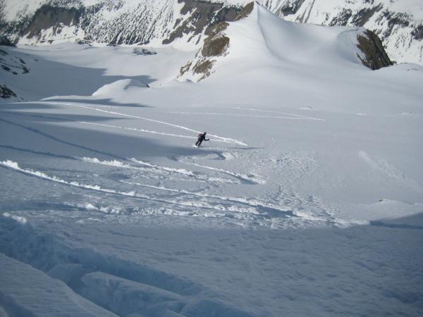 Ich hatte mal davon gehört, dass die Rote Wand im Winter via Gletscher erklimmt werden kann. Näher habe ich mich nicht darüber informiert. Nach Kartenstudium habe ich gesehen, dass der Übergang zum Gletscher die Schlüsselstelle ist. Schnell erkannten wir, dass es für uns kein Durchkommen gibt. Dafür wurden wir mit den schönen Abfahrten belohnt. Wir waren die einzigen in dem Gebiet.