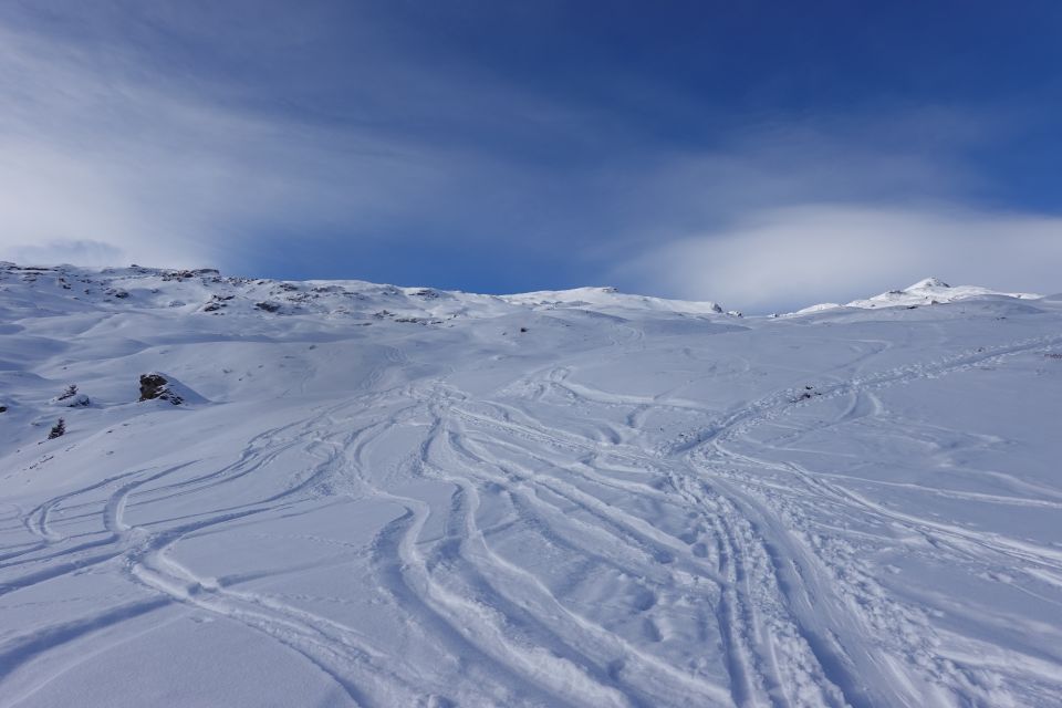 Generell (zu) wenig Schnee im Safiental. Was es hat, ist dafür derzeit top. Vom Gipfel bis unten herrlicher Pulver, zuunterst auf einer gefrorenen Grundlage.