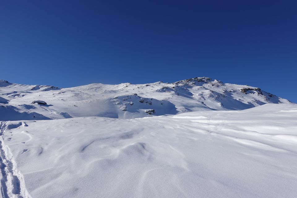 Oberhalb des Tomülpass kaum Schnee, der häufig abgeblasen ist.. In der Abfahrt lässt sich Steinkontakt kaum vermeiden. Darunter herrlicher Pulver bis ins Tal, wenn auch auf wenig oder keiner Unterlage.