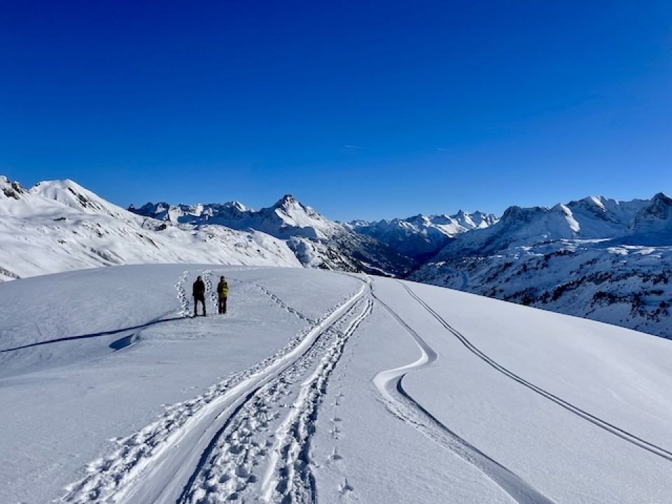 Schöner Pow auf der ganzen Tour. Vor allem am Grat griffiger guter Trittschnee. Der Höfergrat ist aktuell ein Genuss. Ganz rüber bis zur Höferspitze sind wir nicht. Bei den steileren und dann auch zu kletternden Aufschwüngen am Grat sind wir umgedreht und sind lieber am Hochalppass noch etwas durch die wunderbar verschneite Landschaft gelaufen.