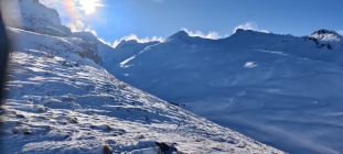 Gestartet mit leichter Wolkendecke und begleitet von Schleierwolken war der Aufstieg vom Berggasthaus bis zum Gipfel bestens gespurt. Ein paar Sonnenstrahlen hatten die Kälte erträglicher gemacht. Es waren viele Personen im Gebiet. Schnee hatte es trotzdem noch reichlich und es war sogar noch Platz für einige Schwünge im unverspurten Gelände.