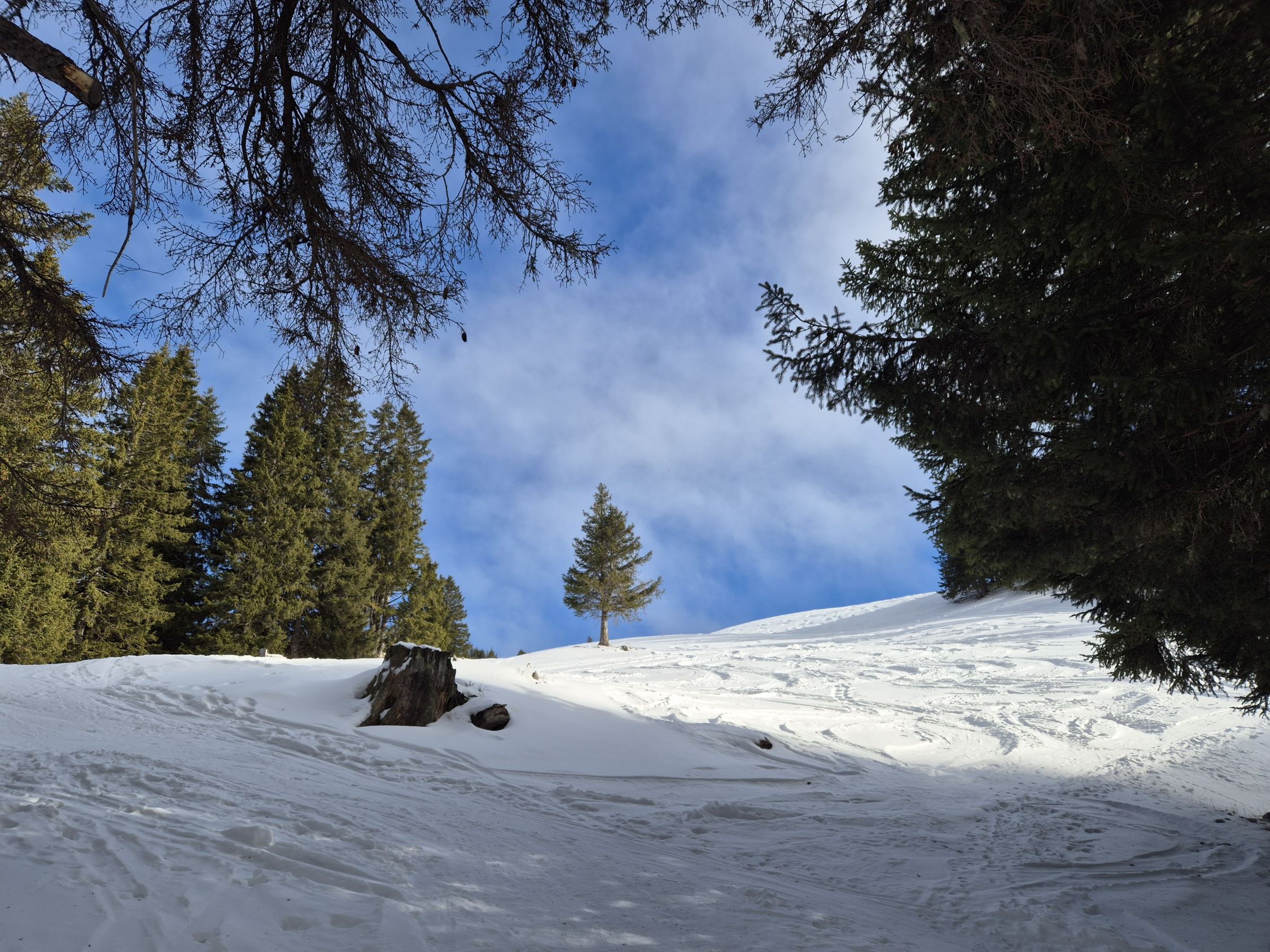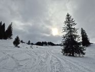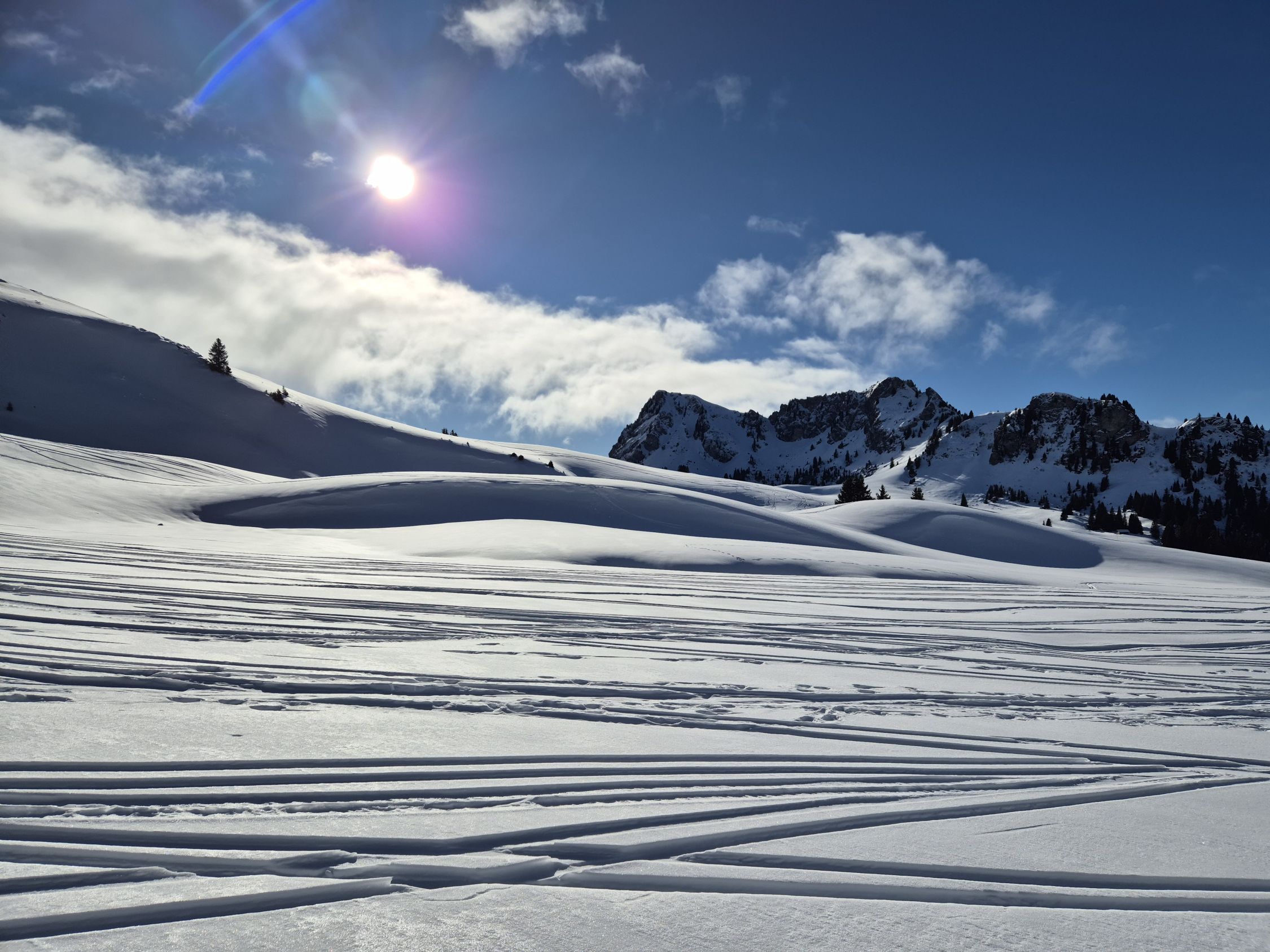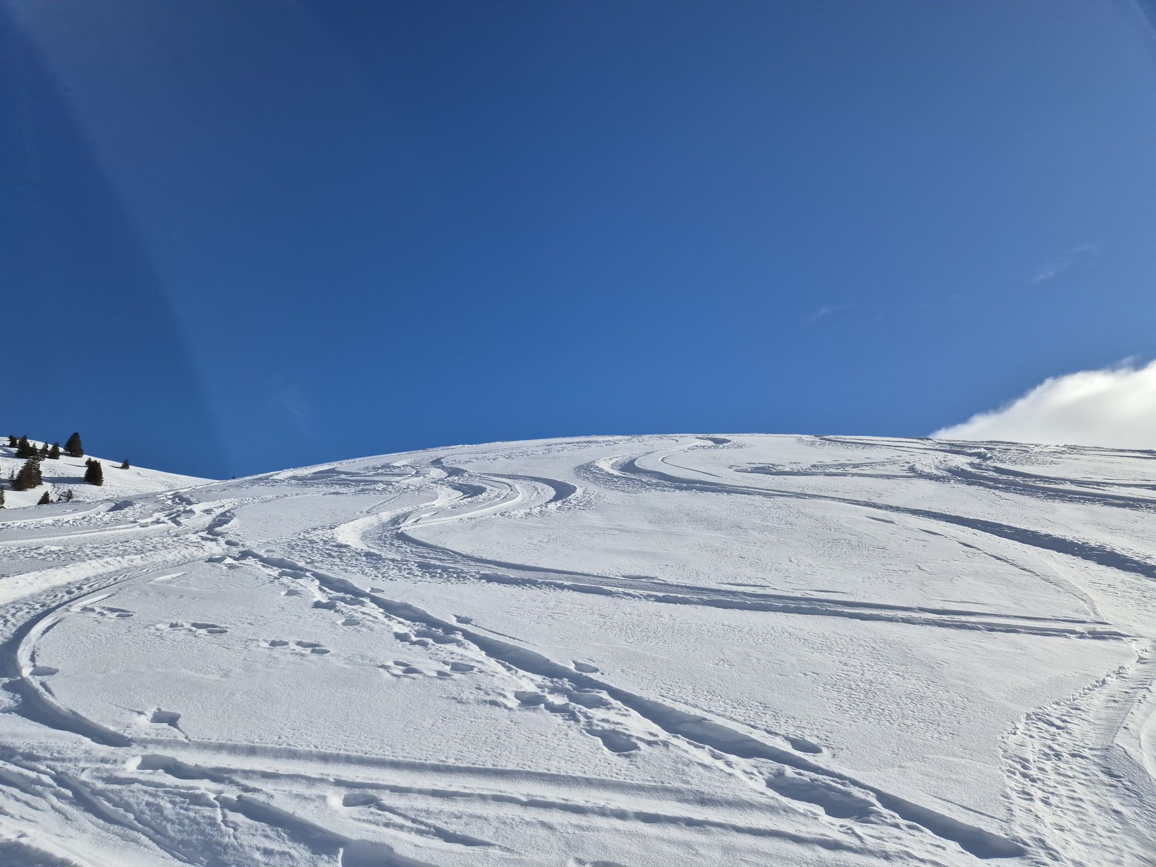 Schöne Pulver Auflage ....viele Spuren... und doch noch Möglichkeiten unverspurte Pulverbögli zu fahren.