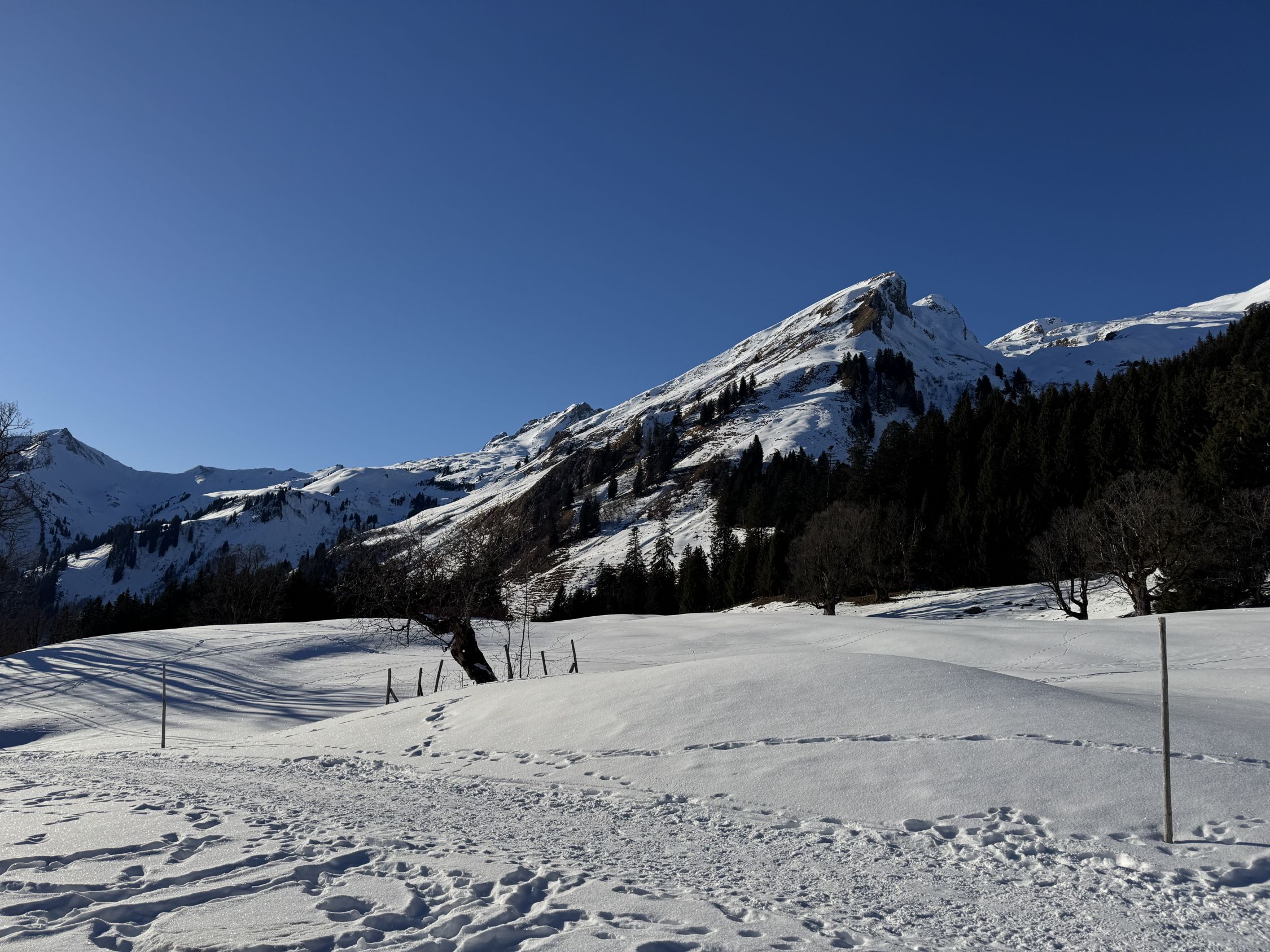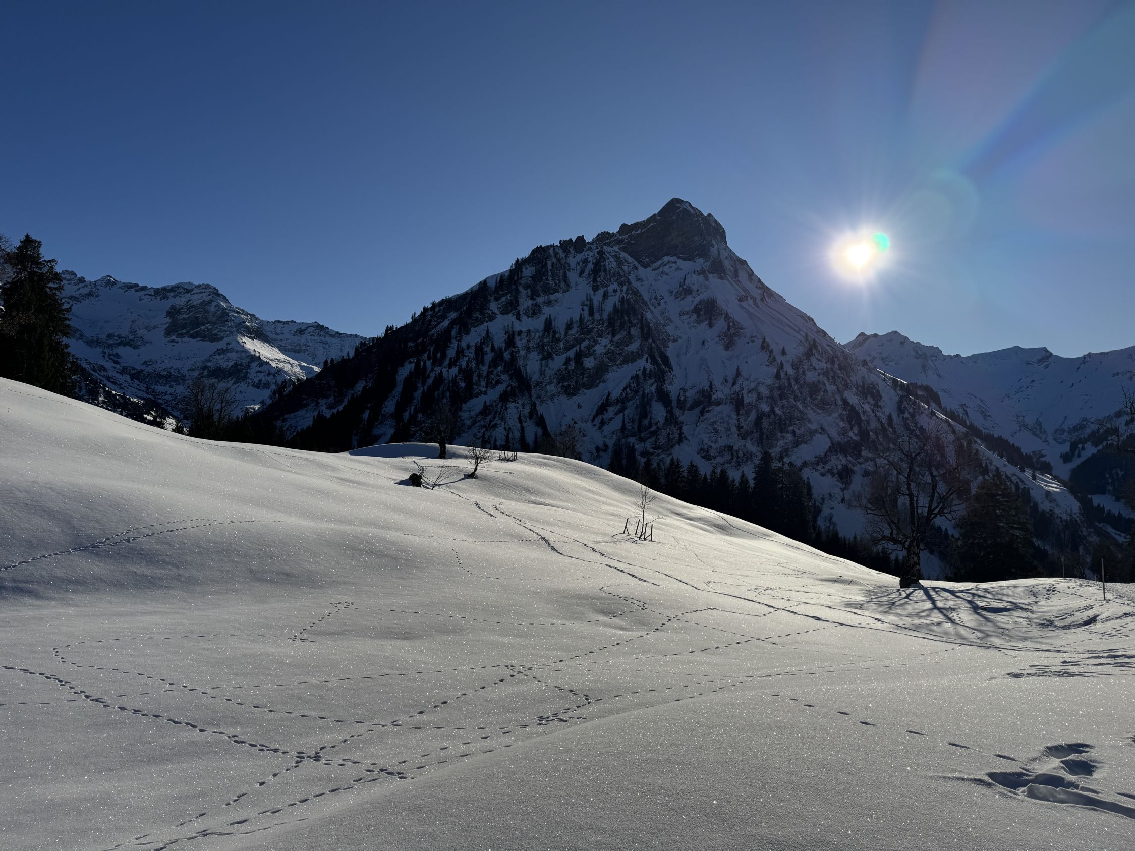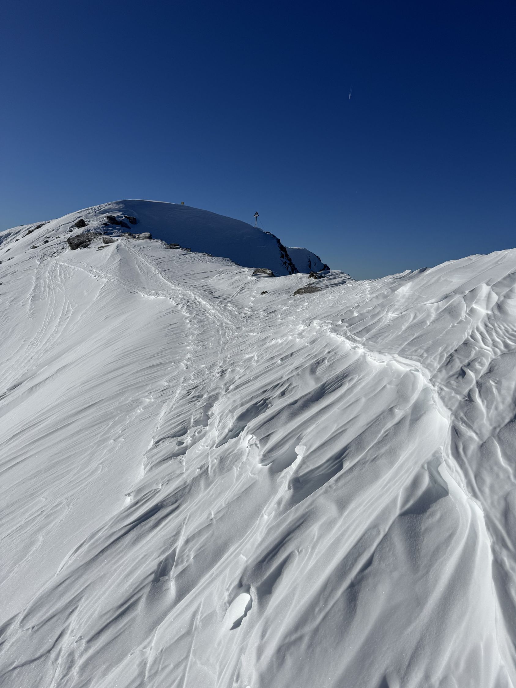Unten ein Fläumchen Glitzerschnee und oben bis 10 cm Pulver auf harter Unterlage.