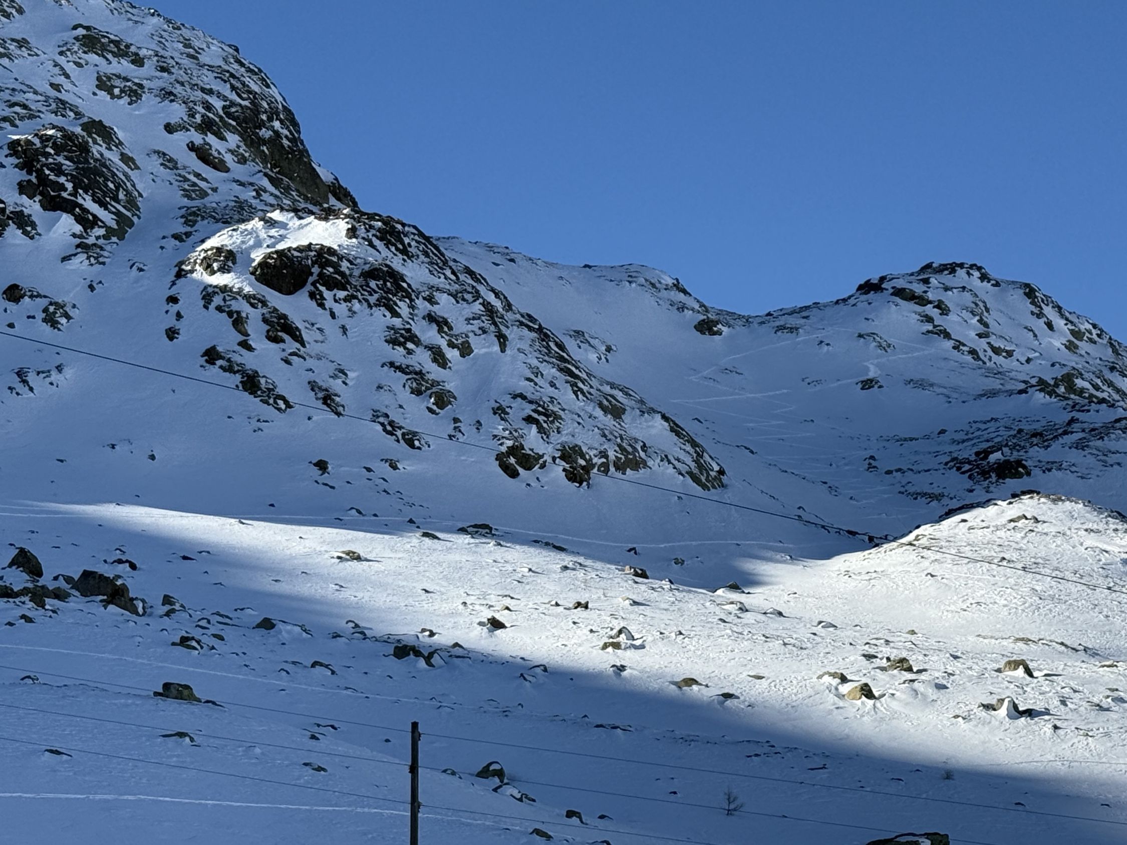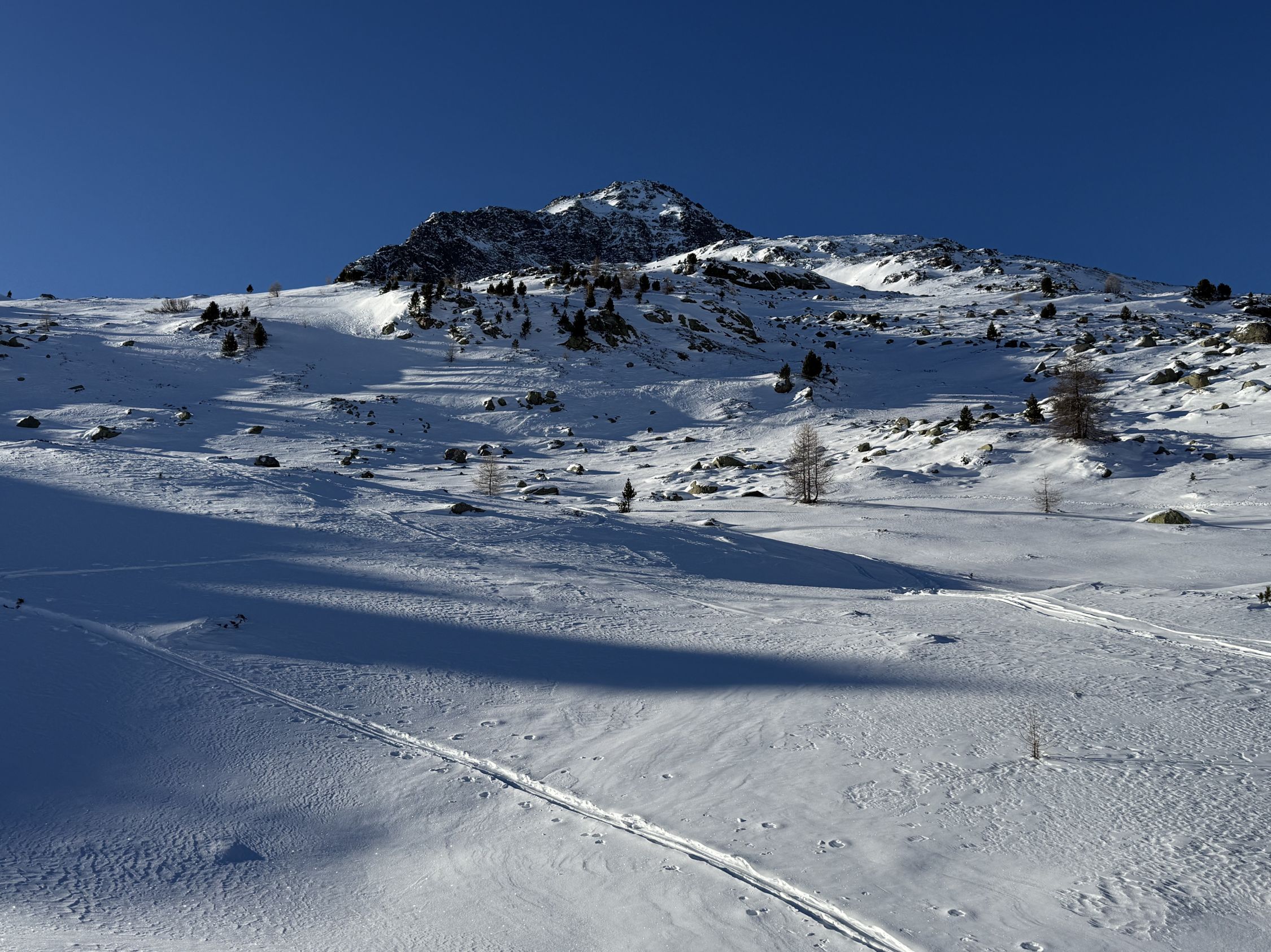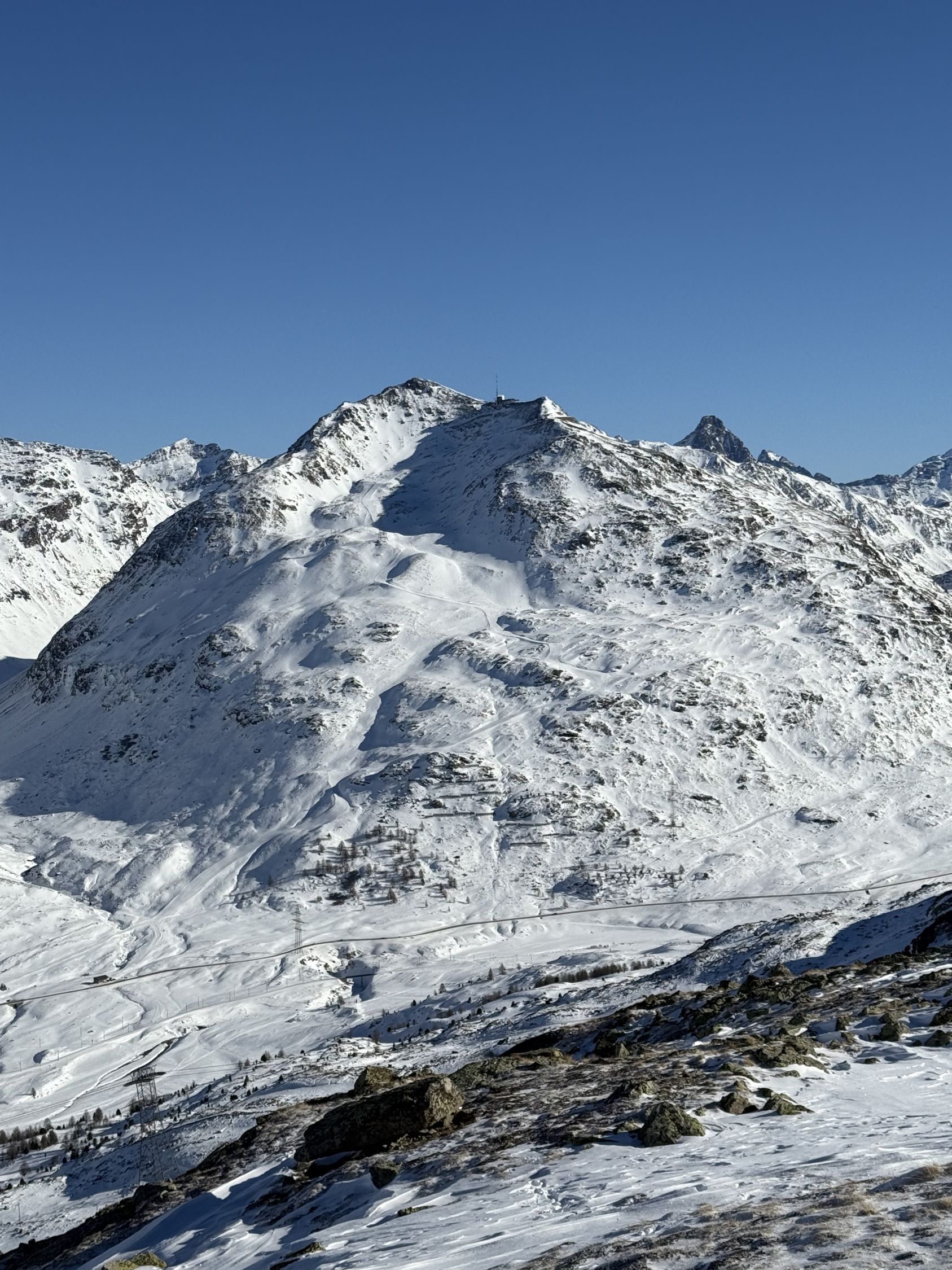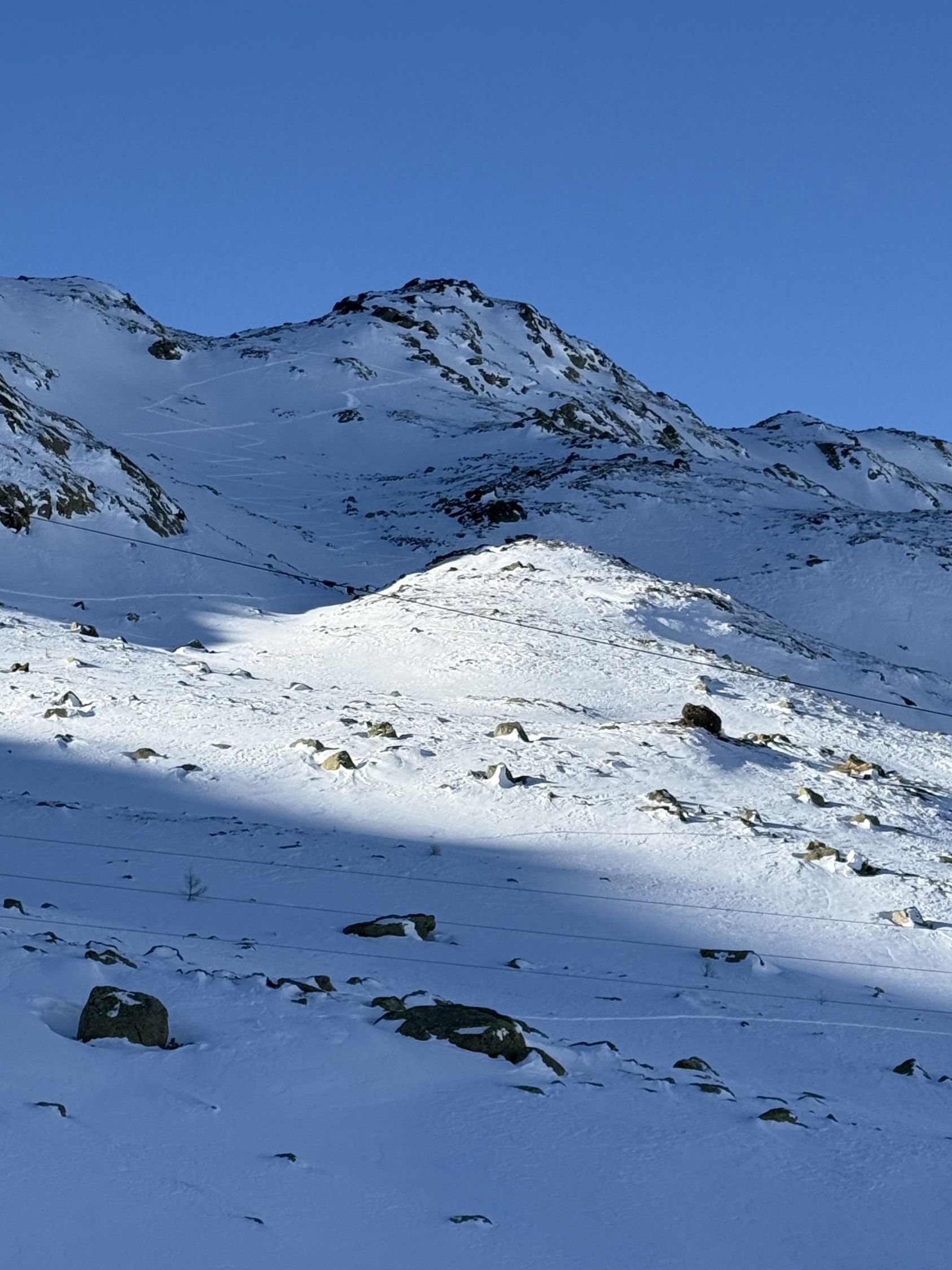 Bei diesen Verhältnissen anspruchsvolle Tour auf den Gipfel unterhalb Ostgrat Munt Pers, WS+. Start Diavolezza Parkplatz 9Uhr, minus 10 Grad, windstill, wolkenlos, Bin auf guter Spur bis Höhe 2375 m die Nordostflanke Las Collinas alles ausserhalb der präparierten Skipiste hoch. Ab Höhe 2375 Spuren auf unterschiedlichen Schneearten, Pulver, hart, Löcher, Steine usw. Im Steilhang bis Höhe 2575 viel Schnee, Steine, Hartschnee, einfach alles. Ab Höhe 2575 zu Fuss auf dem Rücken bis Punkt 2616. Abfahrt ab Höhe 2575 sehr vorsichtig, teilweise viel Schnee aber auch verdeckte Steine. Bin dann ab Höhe 2485 Richtung Süden zu Punkt 2489 abgefahren und dann auf der präparierten Piste zur Talstation Diavolezza runter. Auf Piste sehr wenig Leute. Es hat einfach zu wenig Schnee für gute Verhältnisse. War wie erwartet alleine am Berg. Aufstieg gut, Abfahrt machbar, Piste ausgezeichnet.