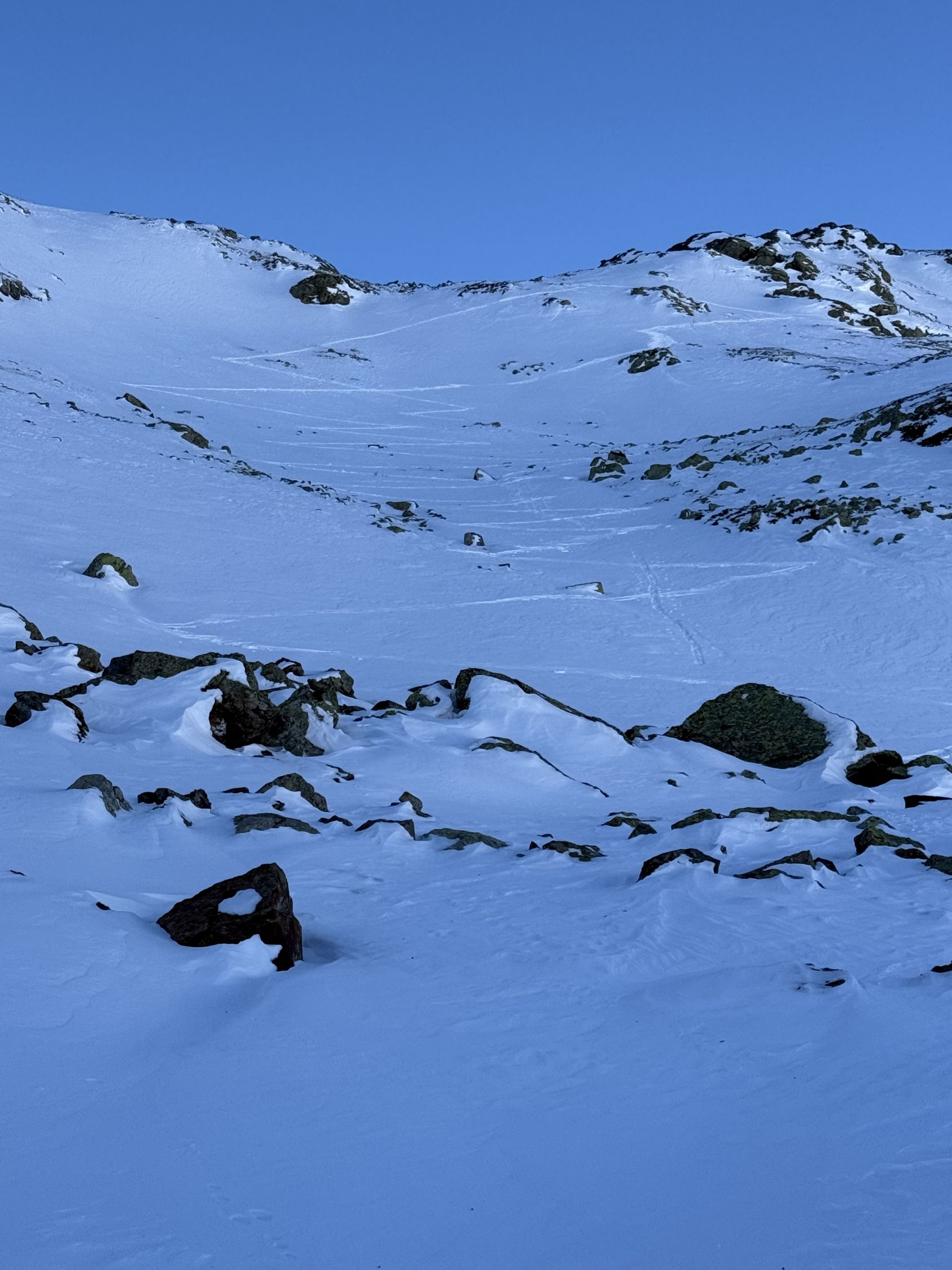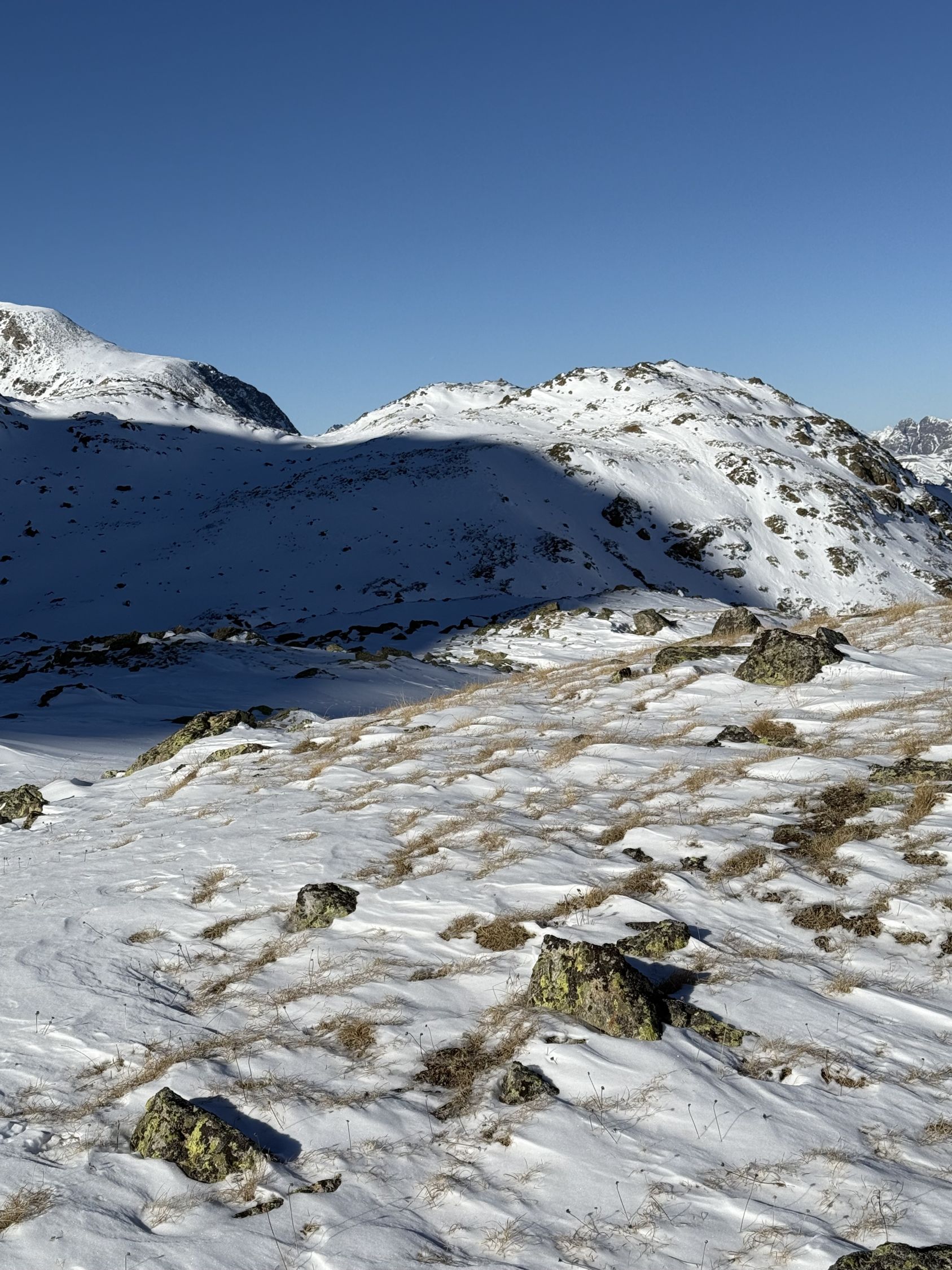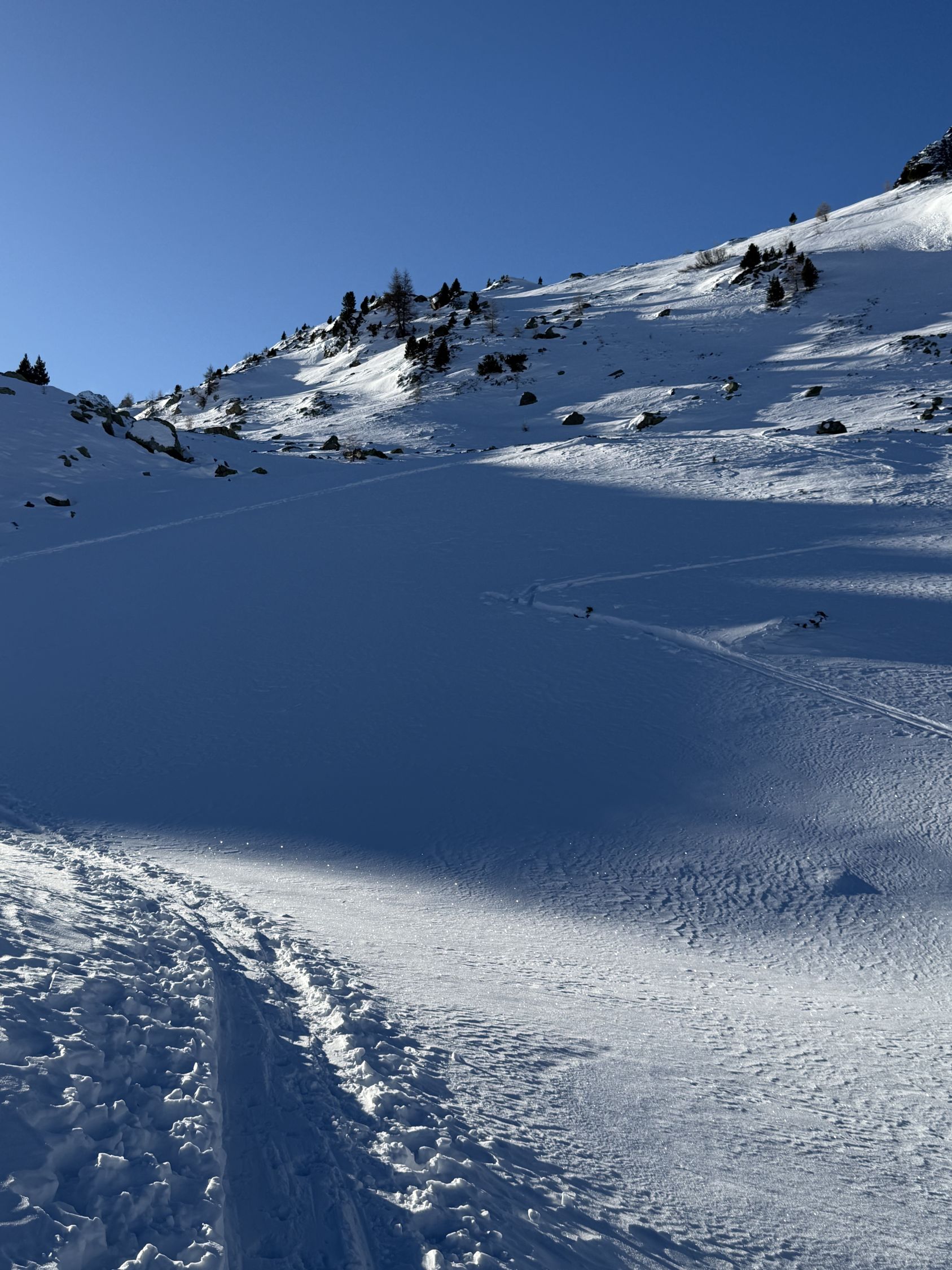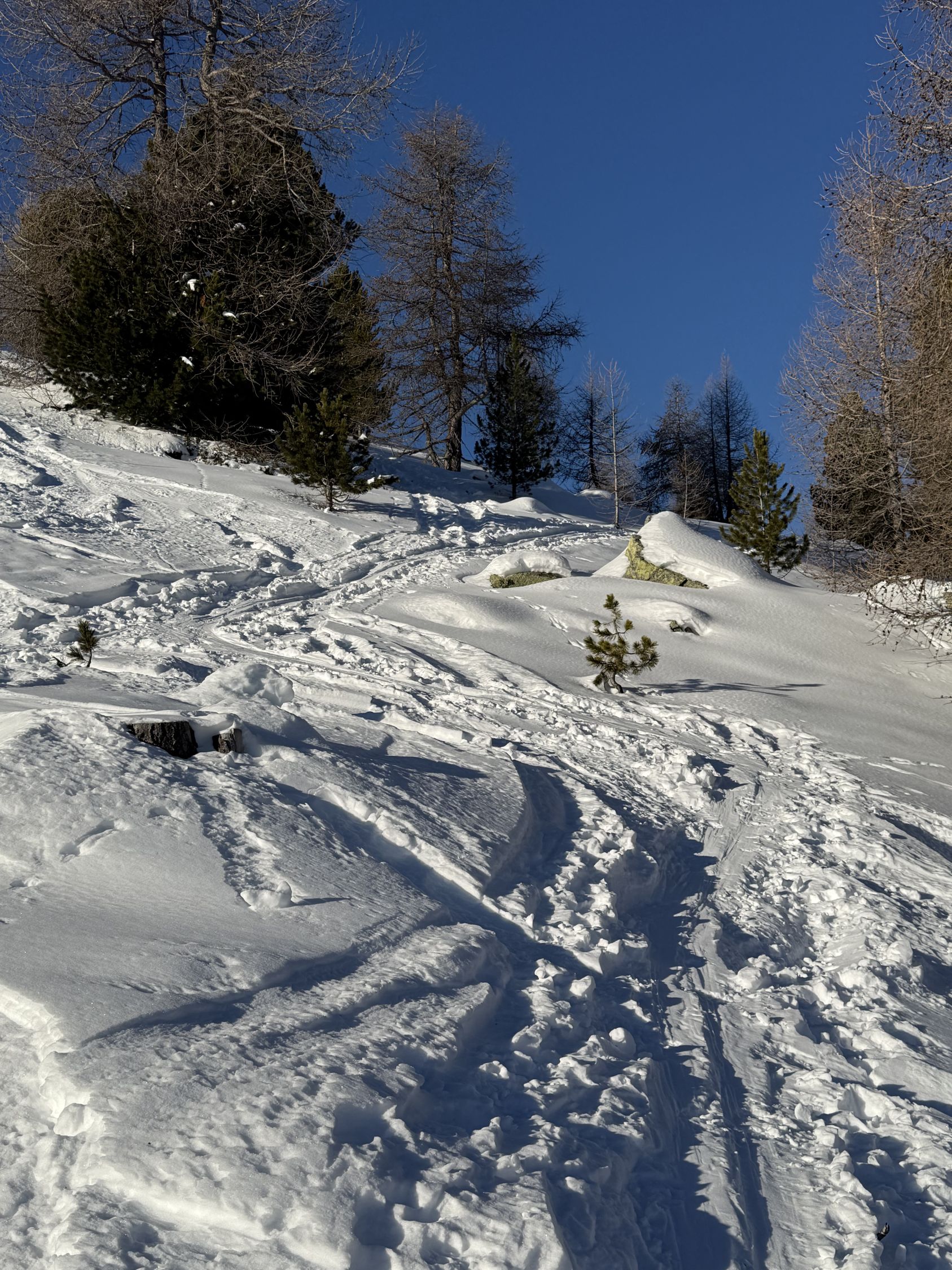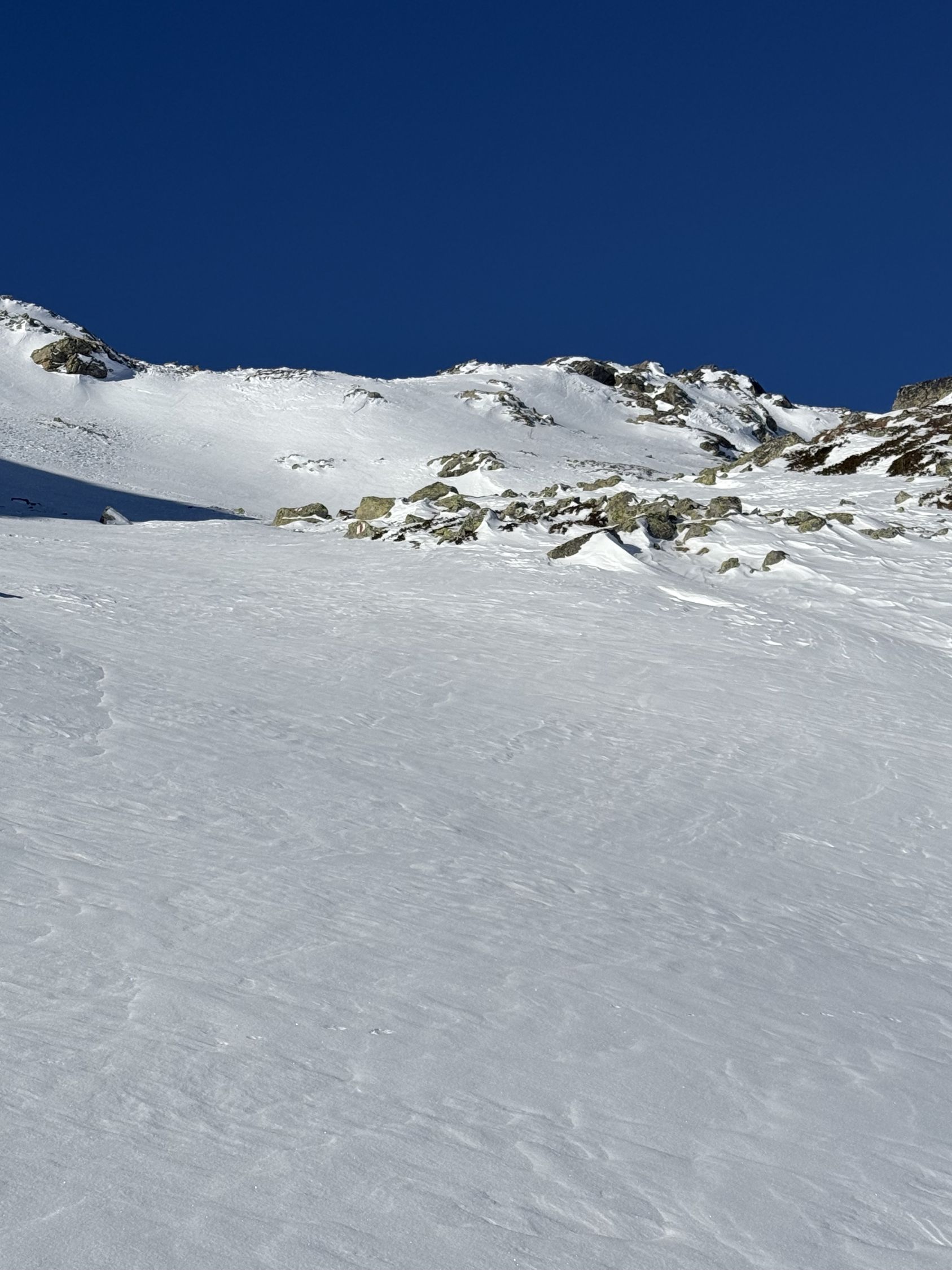 Bei diesen Verhältnissen anspruchsvolle Tour auf den Gipfel unterhalb Ostgrat Munt Pers, WS+. Start Diavolezza Parkplatz 9Uhr, minus 10 Grad, windstill, wolkenlos, Bin auf guter Spur bis Höhe 2375 m die Nordostflanke Las Collinas alles ausserhalb der präparierten Skipiste hoch. Ab Höhe 2375 Spuren auf unterschiedlichen Schneearten, Pulver, hart, Löcher, Steine usw. Im Steilhang bis Höhe 2575 viel Schnee, Steine, Hartschnee, einfach alles. Ab Höhe 2575 zu Fuss auf dem Rücken bis Punkt 2616. Abfahrt ab Höhe 2575 sehr vorsichtig, teilweise viel Schnee aber auch verdeckte Steine. Bin dann ab Höhe 2485 Richtung Süden zu Punkt 2489 abgefahren und dann auf der präparierten Piste zur Talstation Diavolezza runter. Auf Piste sehr wenig Leute. Es hat einfach zu wenig Schnee für gute Verhältnisse. War wie erwartet alleine am Berg. Aufstieg gut, Abfahrt machbar, Piste ausgezeichnet.
