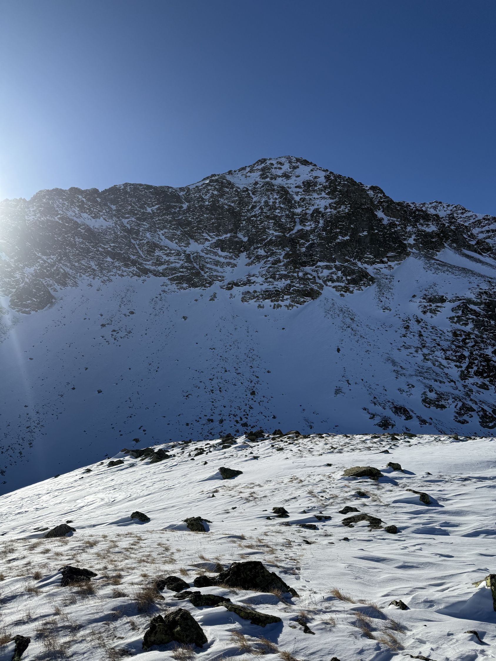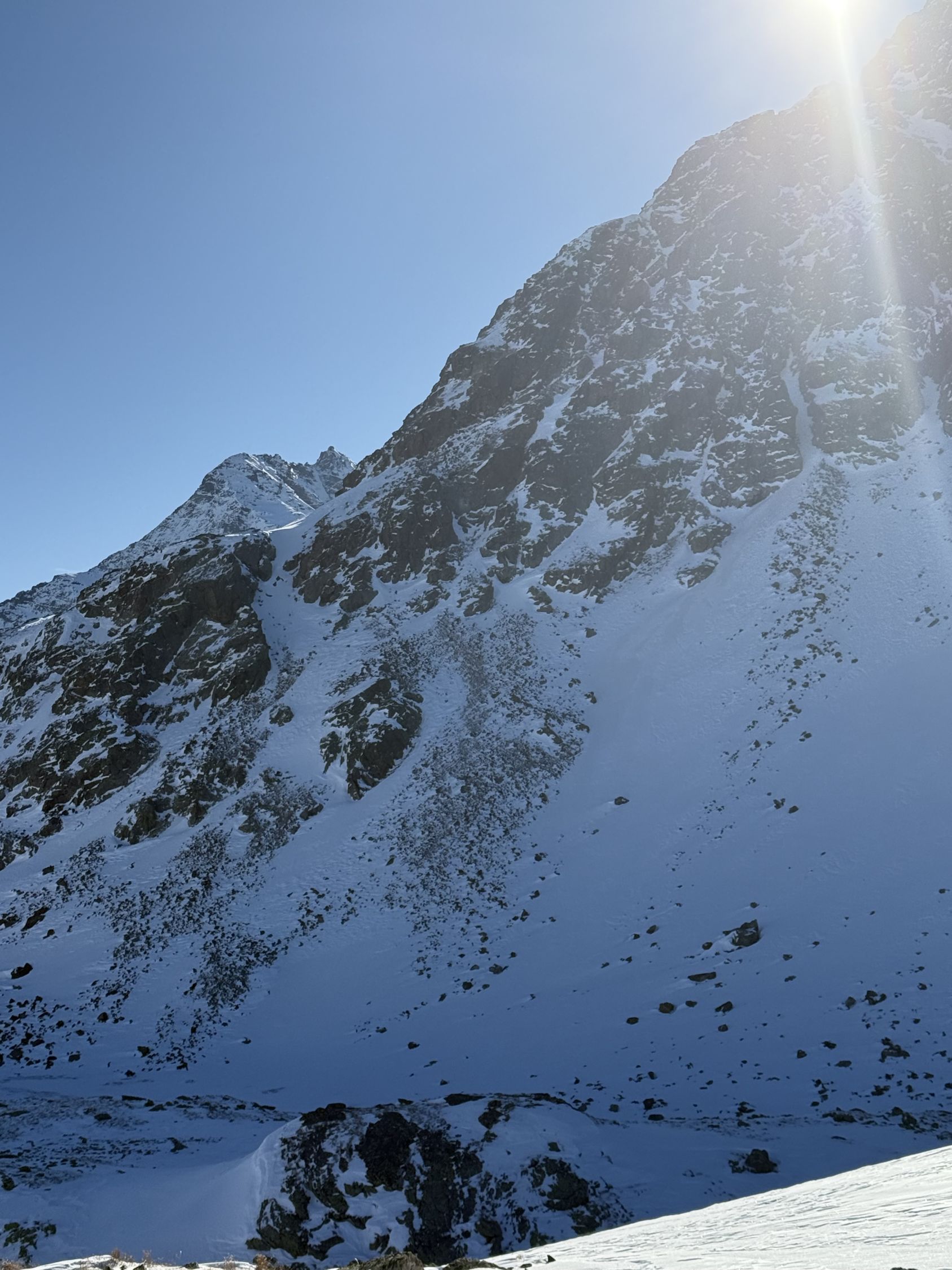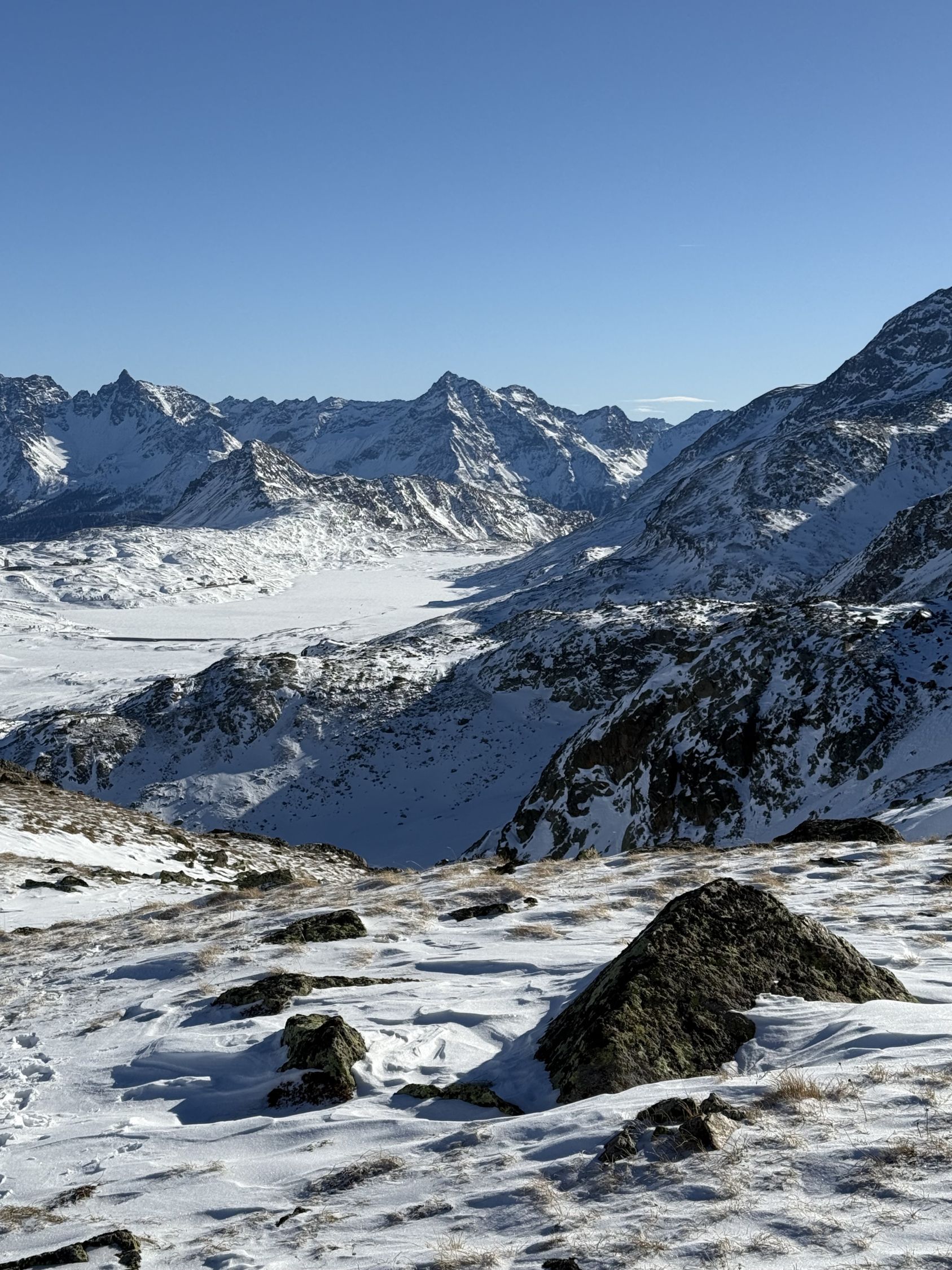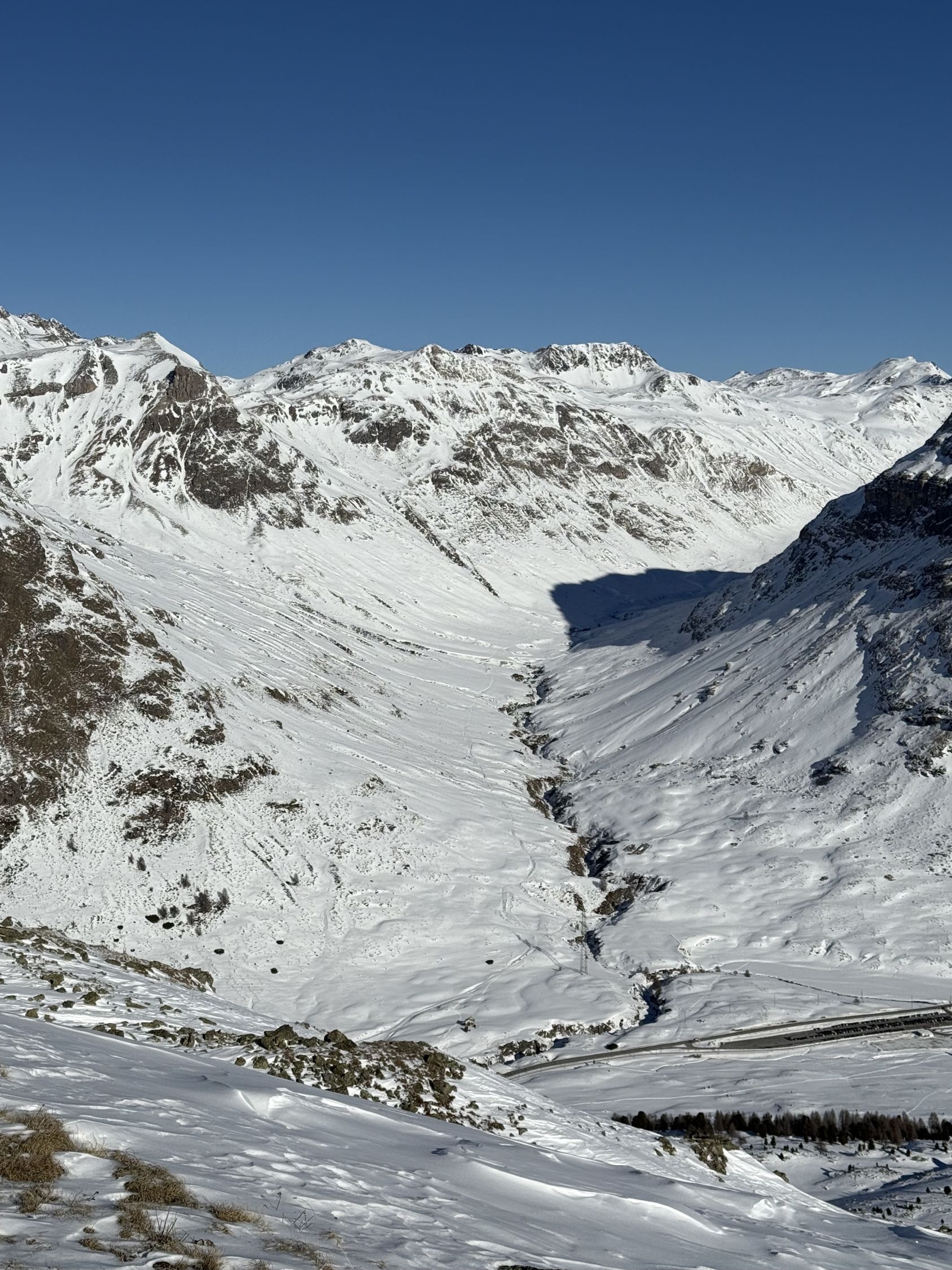 Bei diesen Verhältnissen anspruchsvolle Tour auf den Gipfel unterhalb Ostgrat Munt Pers, WS+. Start Diavolezza Parkplatz 9Uhr, minus 10 Grad, windstill, wolkenlos, Bin auf guter Spur bis Höhe 2375 m die Nordostflanke Las Collinas alles ausserhalb der präparierten Skipiste hoch. Ab Höhe 2375 Spuren auf unterschiedlichen Schneearten, Pulver, hart, Löcher, Steine usw. Im Steilhang bis Höhe 2575 viel Schnee, Steine, Hartschnee, einfach alles. Ab Höhe 2575 zu Fuss auf dem Rücken bis Punkt 2616. Abfahrt ab Höhe 2575 sehr vorsichtig, teilweise viel Schnee aber auch verdeckte Steine. Bin dann ab Höhe 2485 Richtung Süden zu Punkt 2489 abgefahren und dann auf der präparierten Piste zur Talstation Diavolezza runter. Auf Piste sehr wenig Leute. Es hat einfach zu wenig Schnee für gute Verhältnisse. War wie erwartet alleine am Berg. Aufstieg gut, Abfahrt machbar, Piste ausgezeichnet.