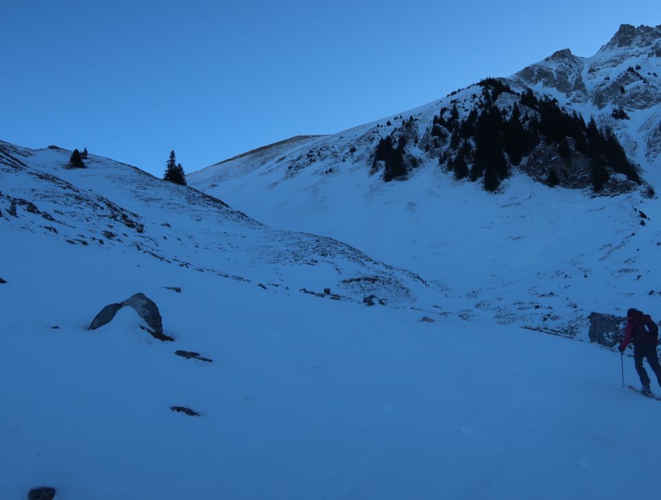 Dann wunderbarer Pulverschnee in der Abfahrt zum Schattige Riprächte (durch erstes Couloir am Grat). Ab Grenchegalm bis unterhalb Grencheberg Sulzschnee (Achtung viele Steine), dann über den Weg oder rechts davon im Hang zum Hengst (Traktorspuren und ab und zu Steine!)