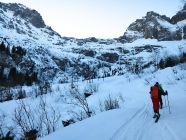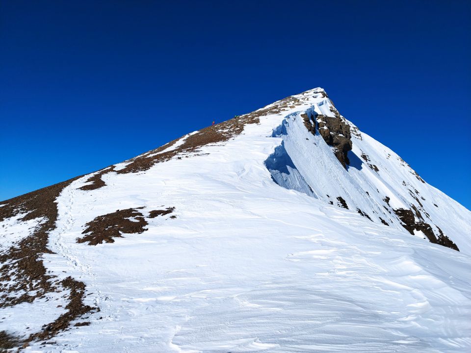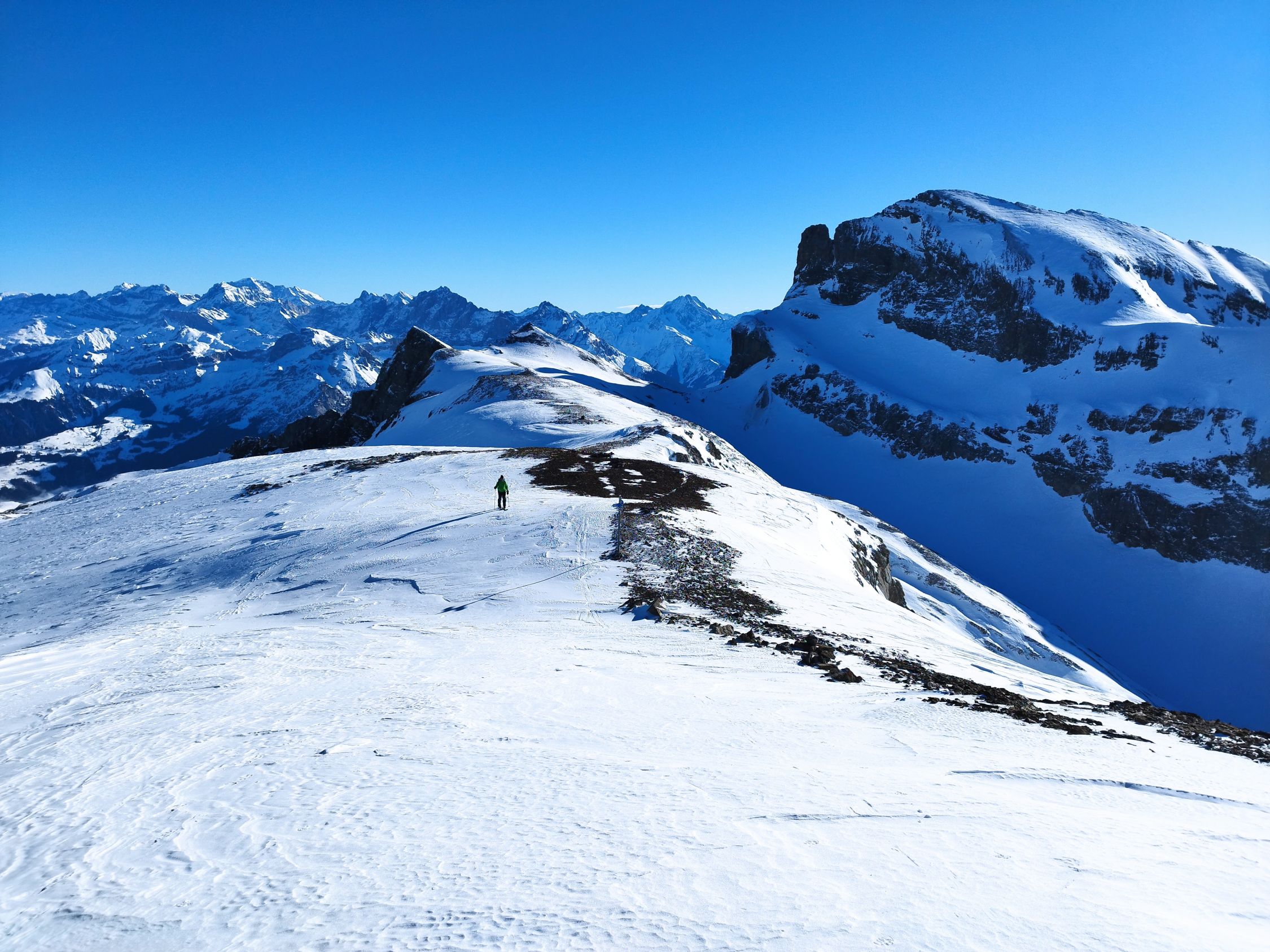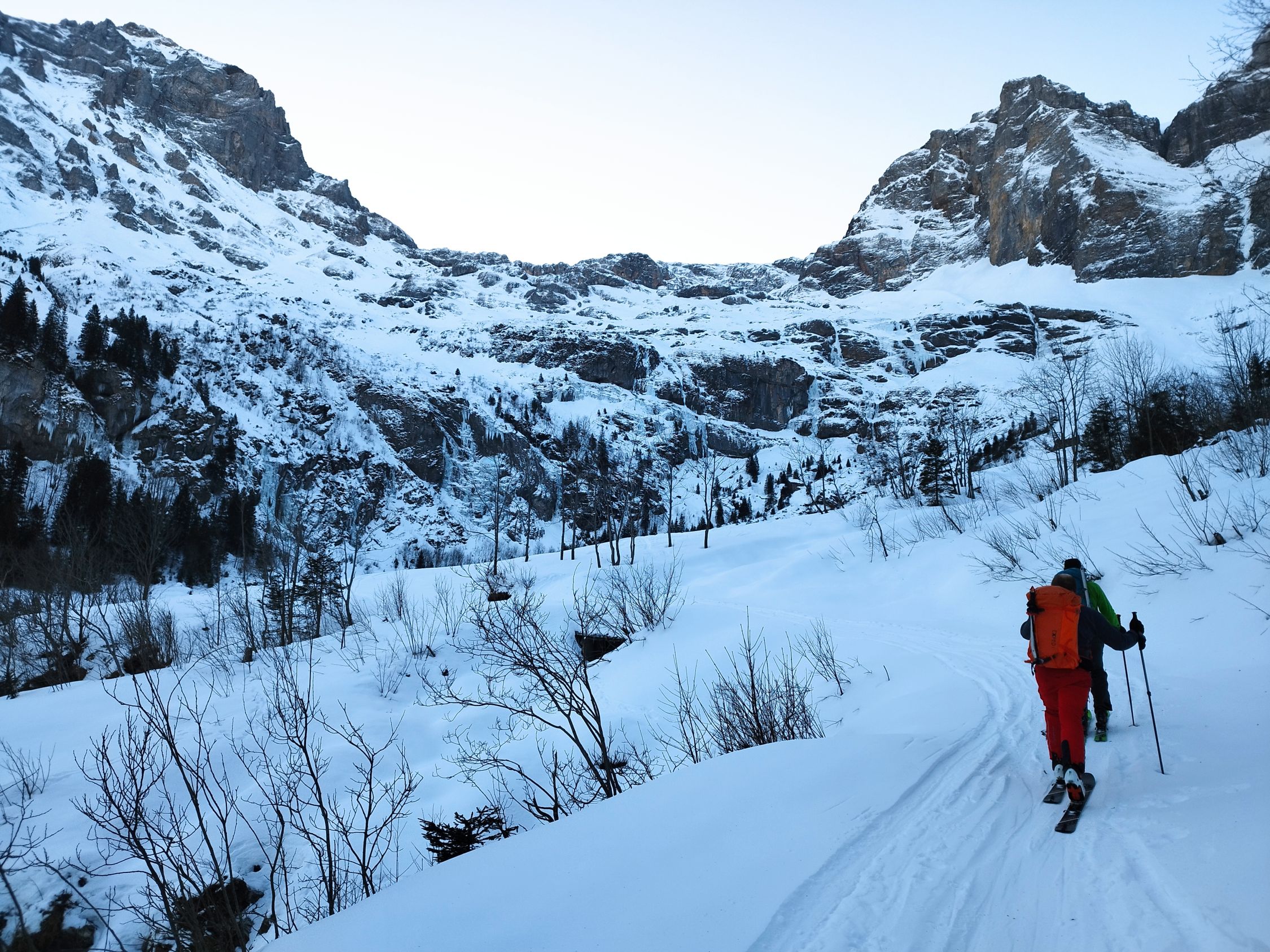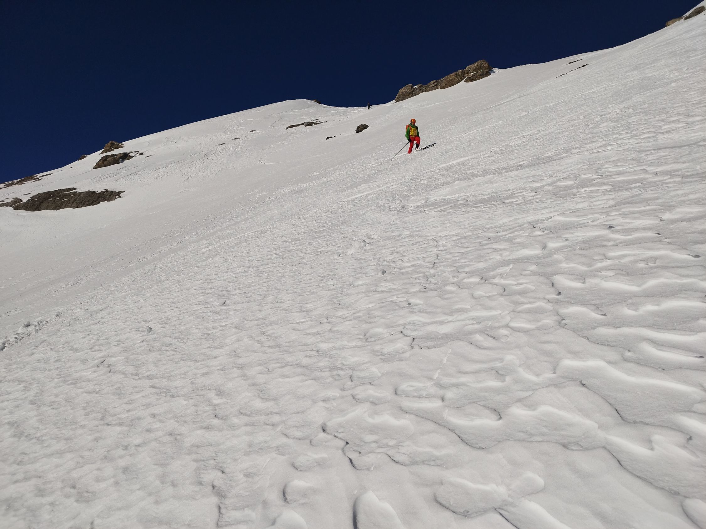Man muss mit alle Arten von Schnee rechnen. Unten gibt's Pulverschnee, im mittleren Teil, unter der Gitschenhörelihütte ist es abwechslungsreich mit hartem und Wind-bearbeitete Schnee und oben hat's wenig Schnee. Es gibt sehr wenig Schnee auf dem Gipfelhang. Steigeisen sind hilfreich aber nicht nötig. Der Steilhang unter dem Rotstocksattel war um 14 Uhr gut zum Fahren (eine Mischung von windgepresst und sulzig).