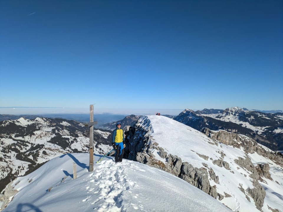 Unten hat's gerade noch genug Schnee zum Hochsteigen. Gleich nach der Brücke in Hirsegg kann man anfallen und bis zum Gipfel marschieren. Wir wählten zum Aufstieg die Spur Richtung Schlund, dann ein Stück auf dem Weg Richtung Silwänge, bis es ab ca. 1'500m ziemlich direkt zum Gipfel ging. Oben angekommen schritten wir durch die Scharte zum Gipfelkreuz.