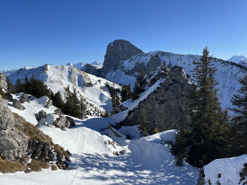 Wenig Schnee, keine Unterlage bis etwa 1500 m. Wir sind zu Fuss aufgestiegen bis zum Gipfel, das ging sehr gut (oft tragend). Die Nordflanke hingegen war sehr mühsam: Meist ein lästiger Winddeckel und auch hier sehr wenig Schnee. Aktuell wäre es bequemer, den Abstieg mit Steigeisen bzw zu Fuss zu begehen.