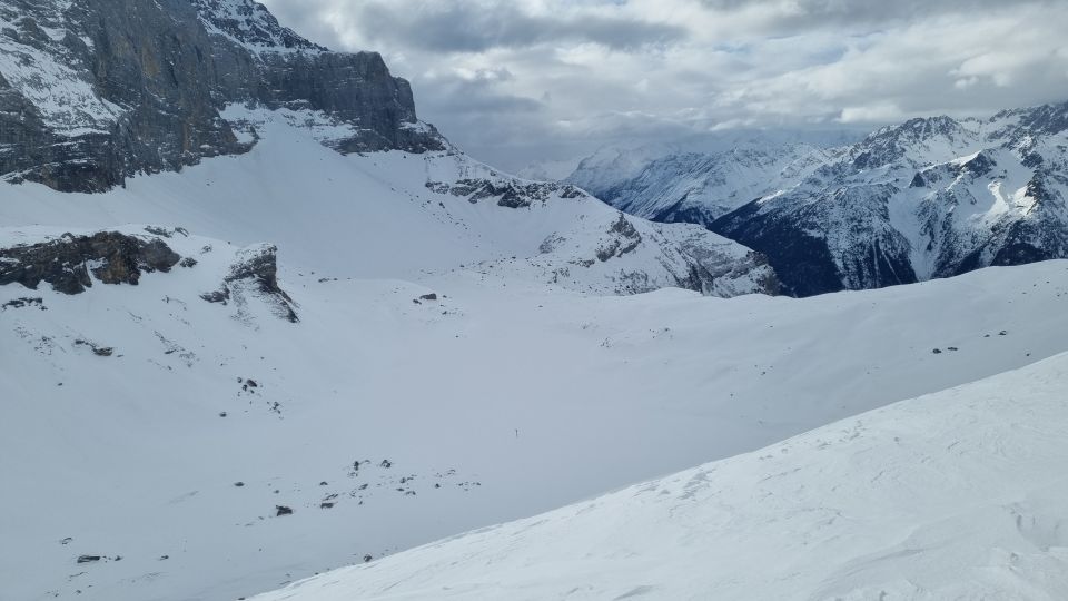 In der Abfahrt tw. diffuses Licht, aber gut machbar, wenn auch ohne viel Spass. Unter ca 1600m feuchter bis nasser Bremsschnee. Abfahrt auf Strase ab Bunnialp problemlos.